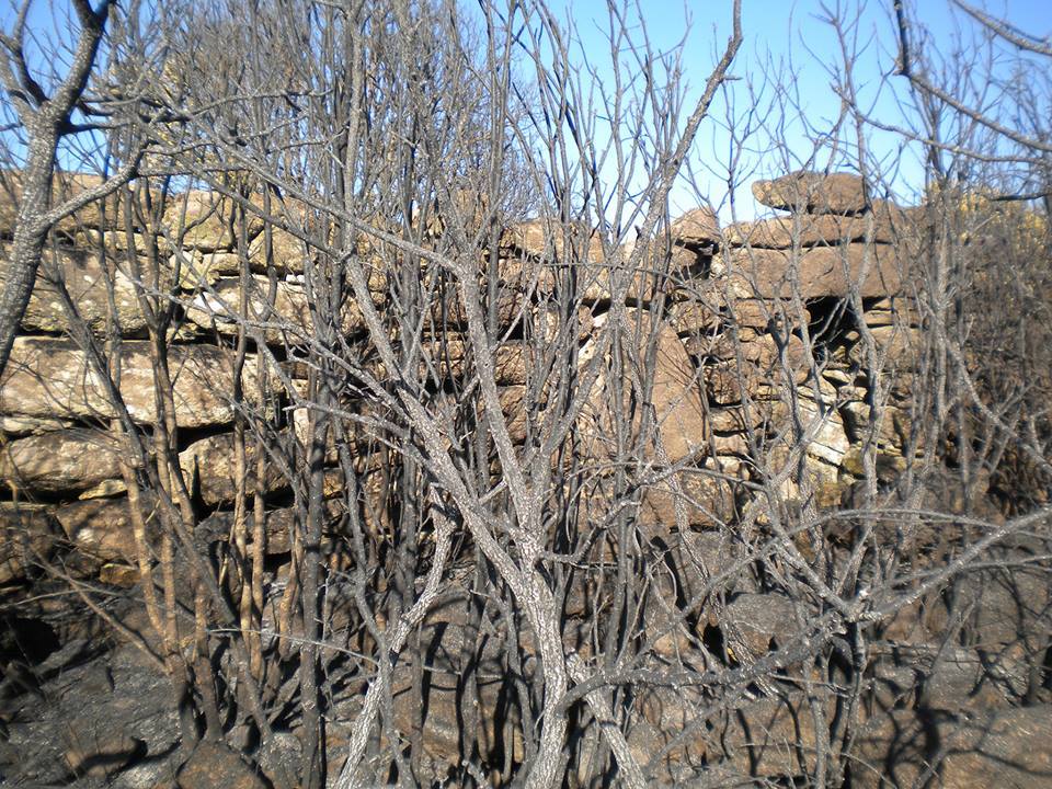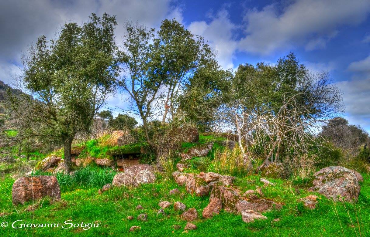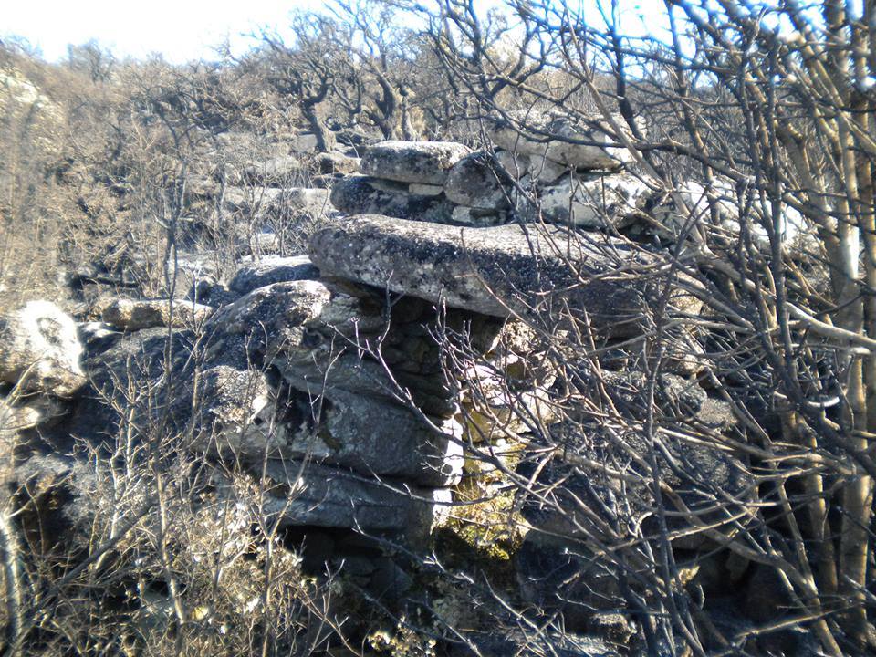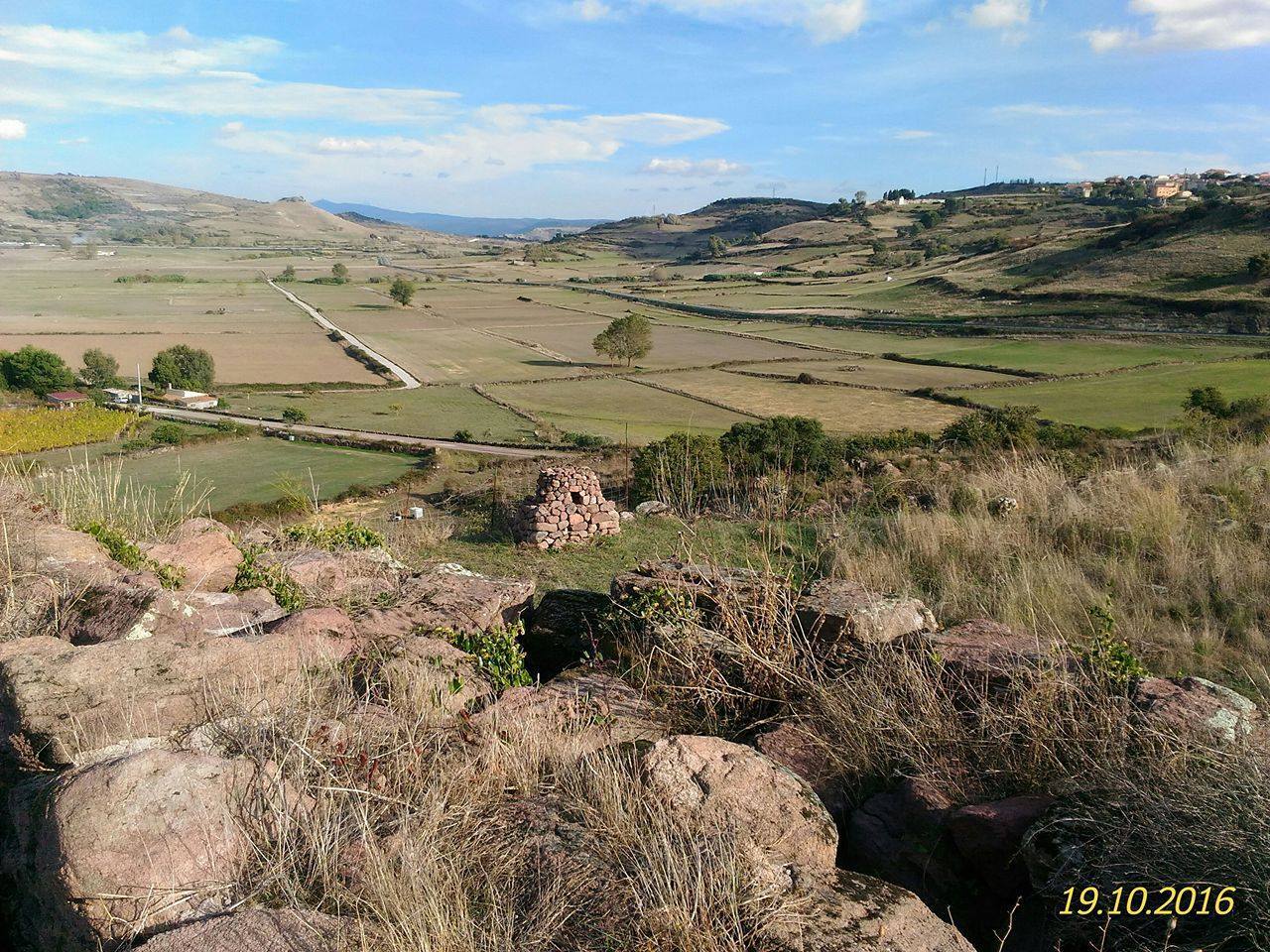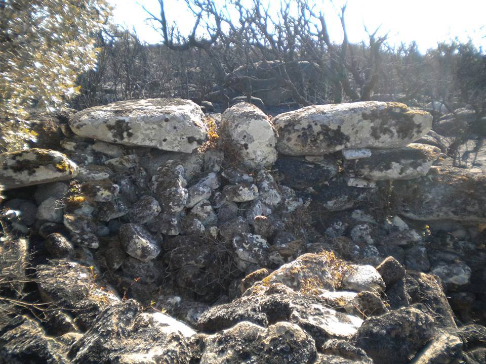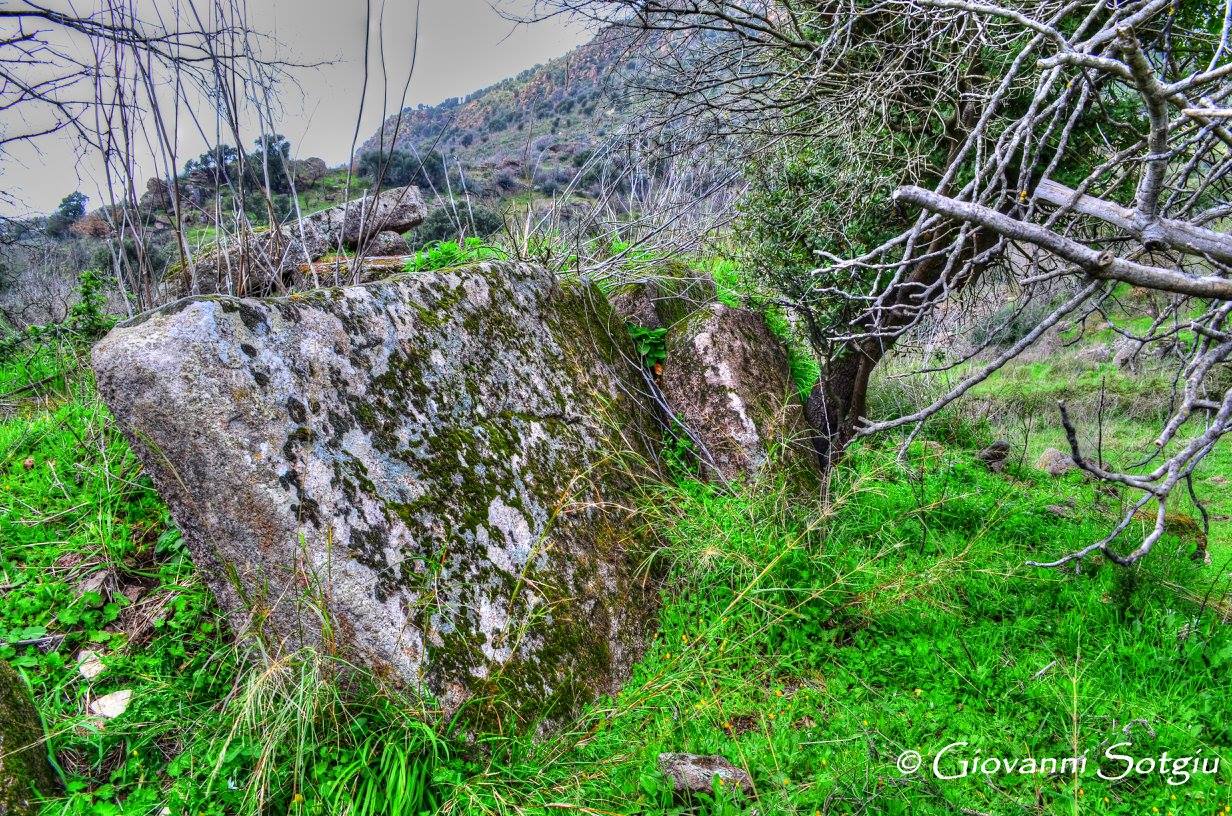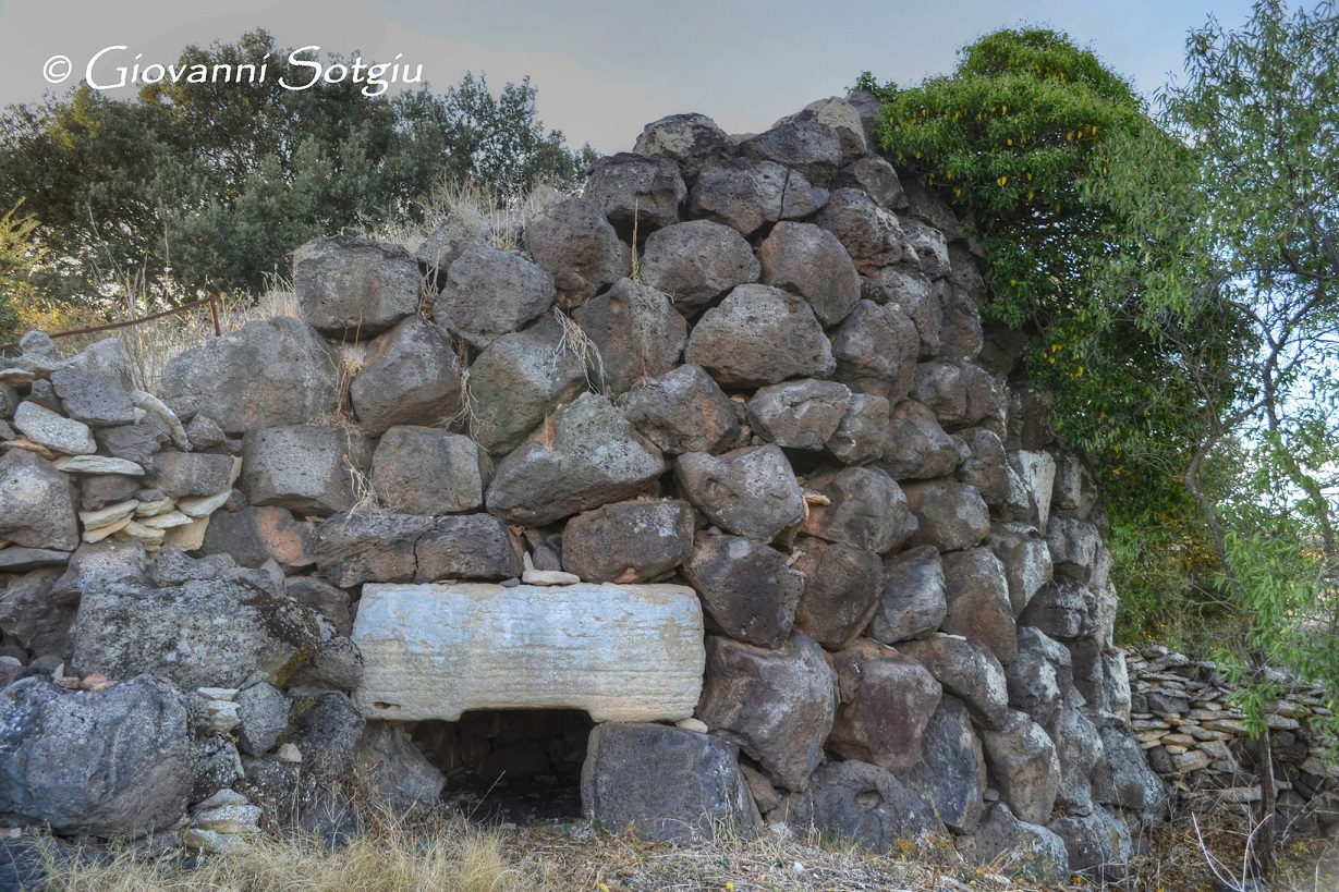 Nuraghe che si distingue per l’architrave calcareo, bianco su mura scure. La tholos è crollata verso l’interno.