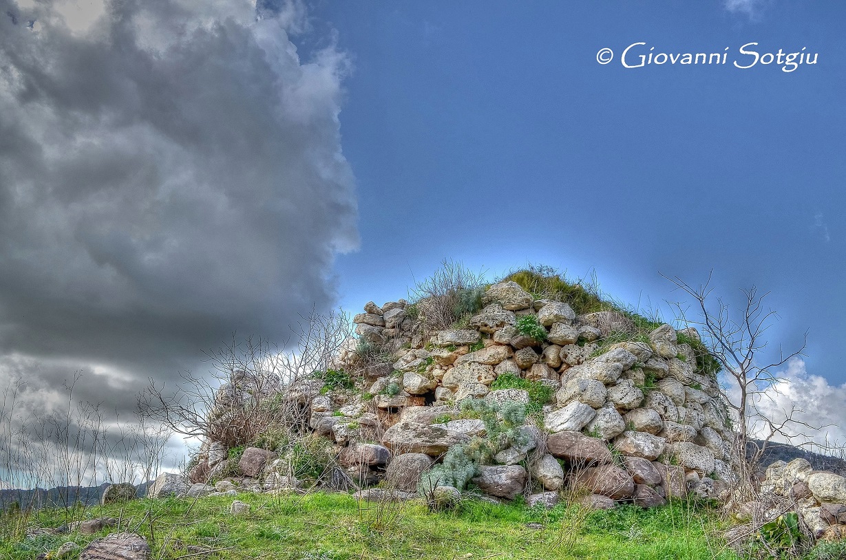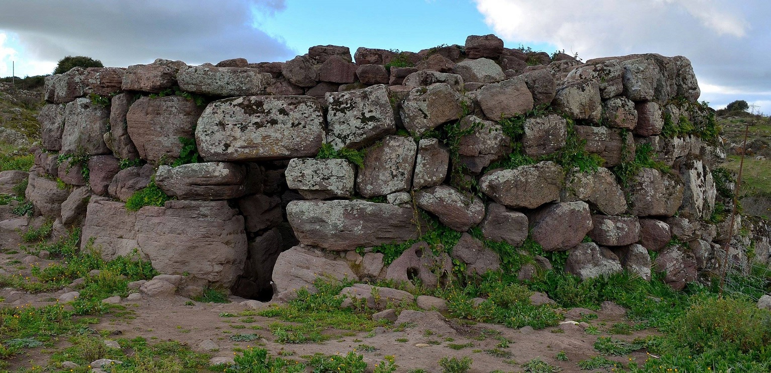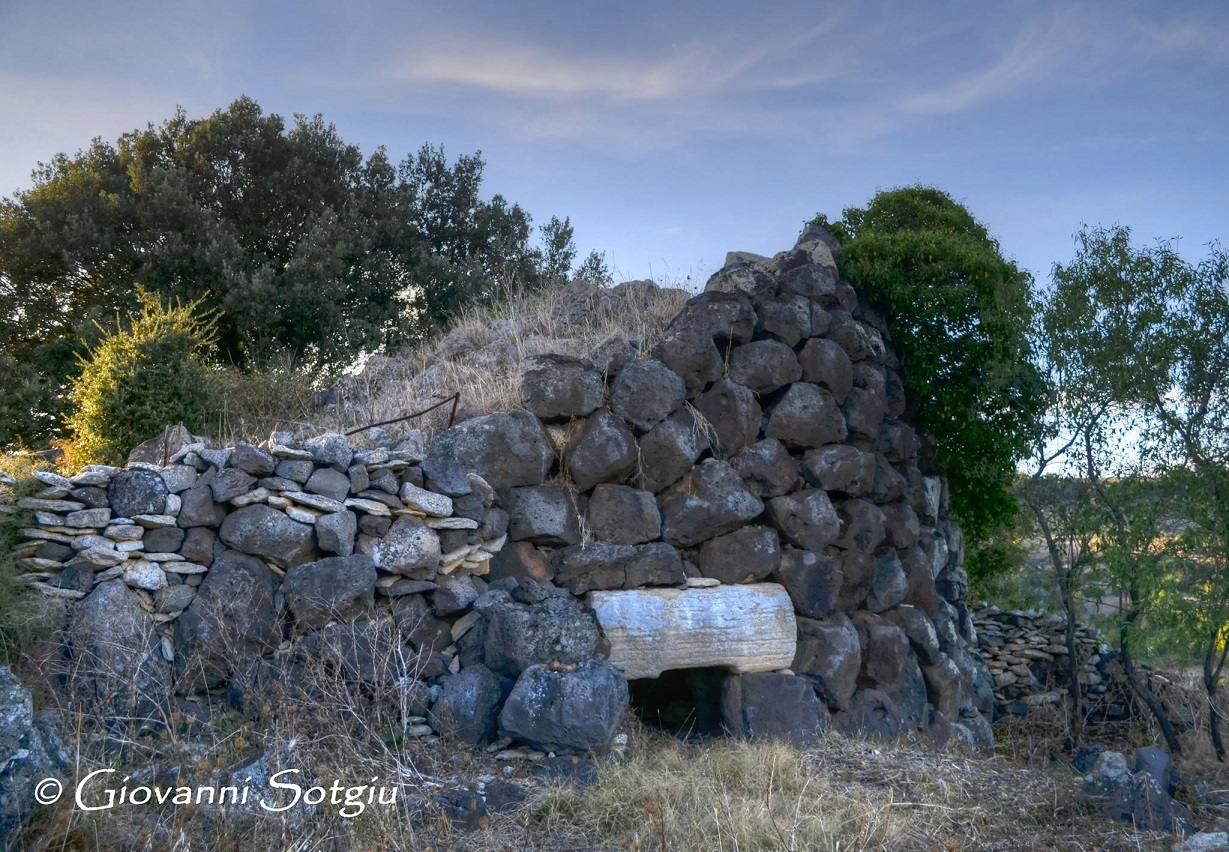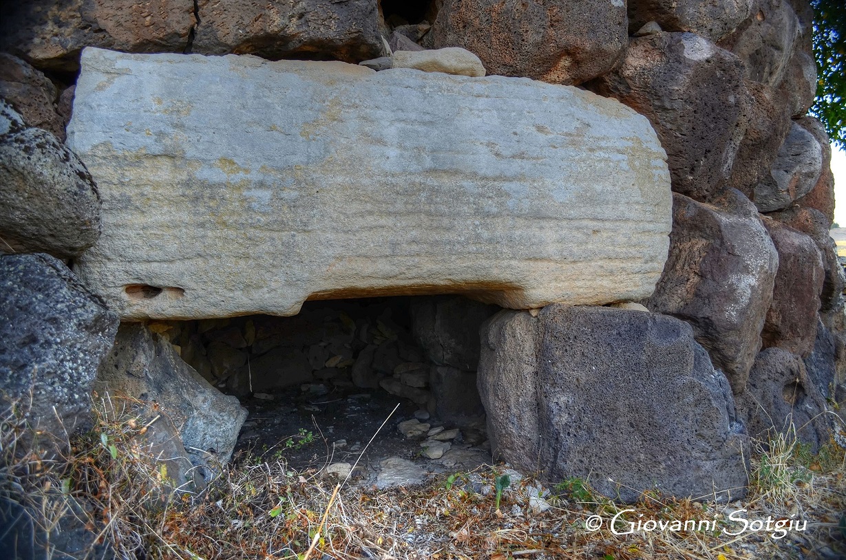 Nuraghe che si distingue per l’architrave calcareo, bianco su mura scure. La tholos è crollata verso l’interno.