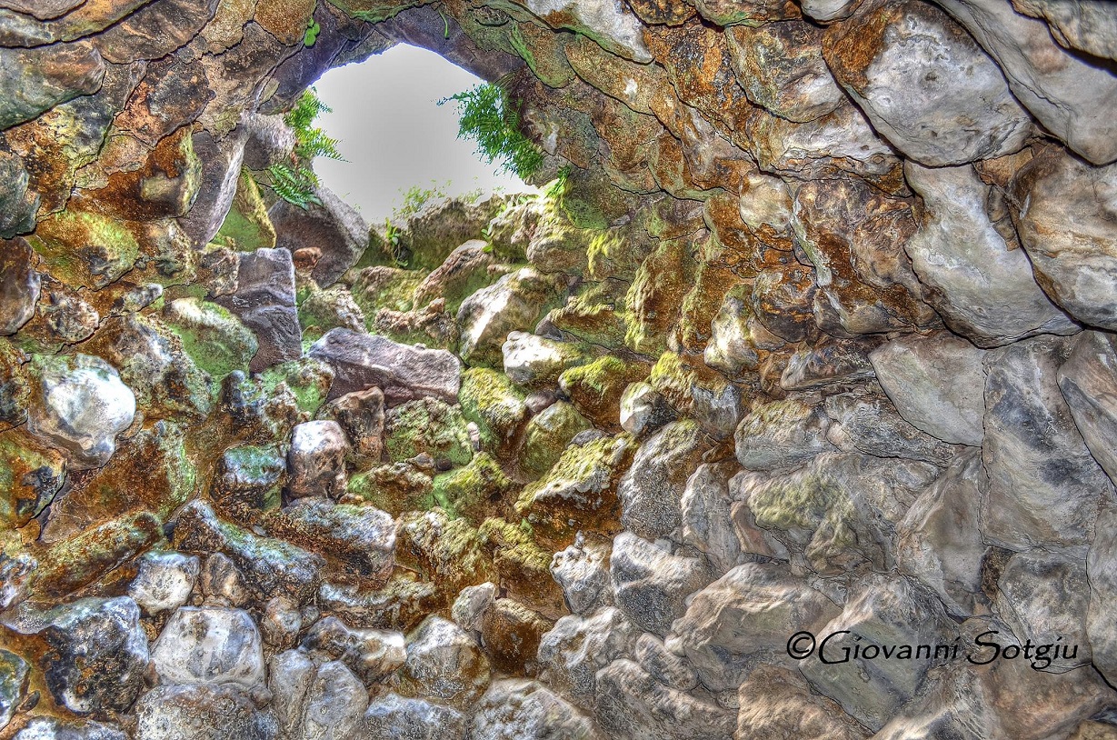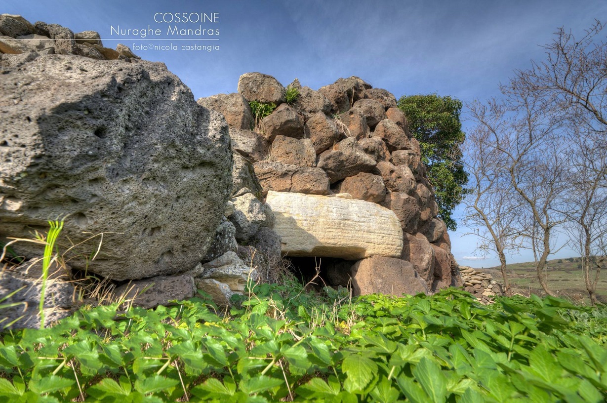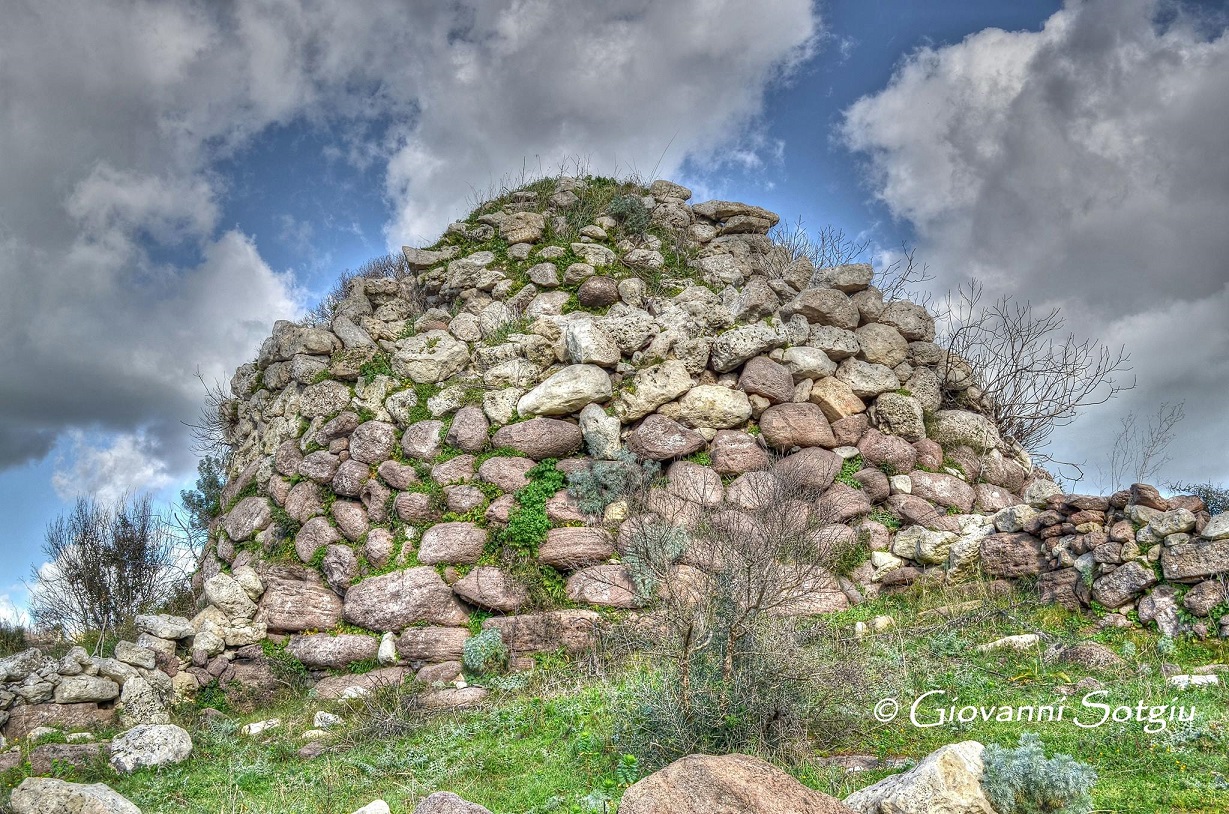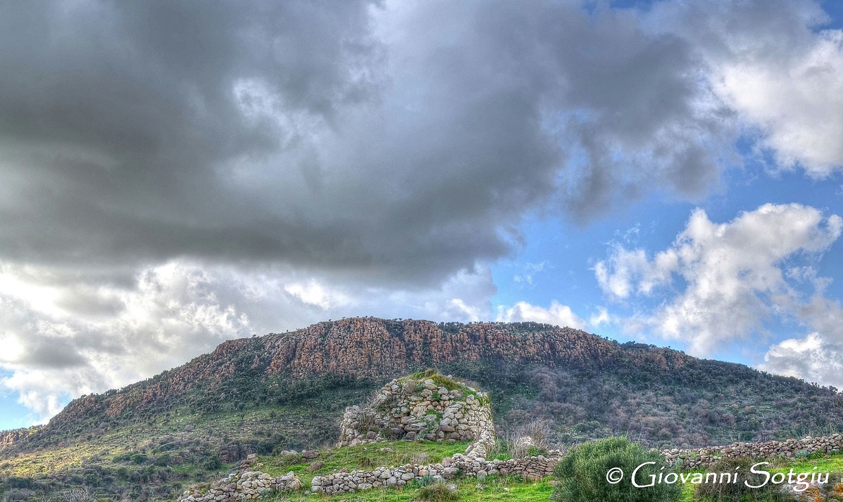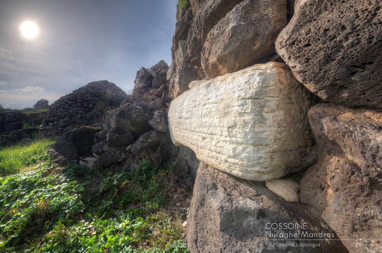Nuraghe che si distingue per l’architrave calcareo, bianco su mura scure. La tholos è crollata verso l’interno.