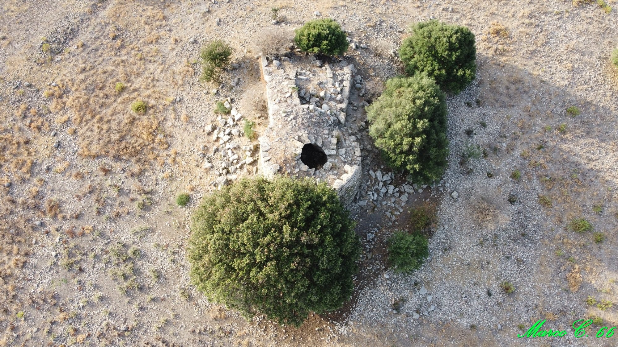 Il nuraghe si compone di una torre centrale circondata da una muraglia, alla quale sono addossate alcune torri secondarie. La torre centrale, che originariamente era costituita da più piani sovrapposti, conserva attualmente solo il piano inferiore e la scala che conduceva a quelli superiori, parzialmente ostruita dai crolli.