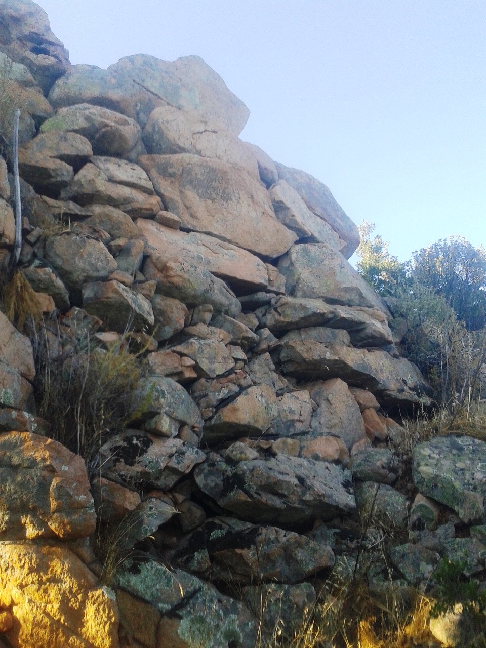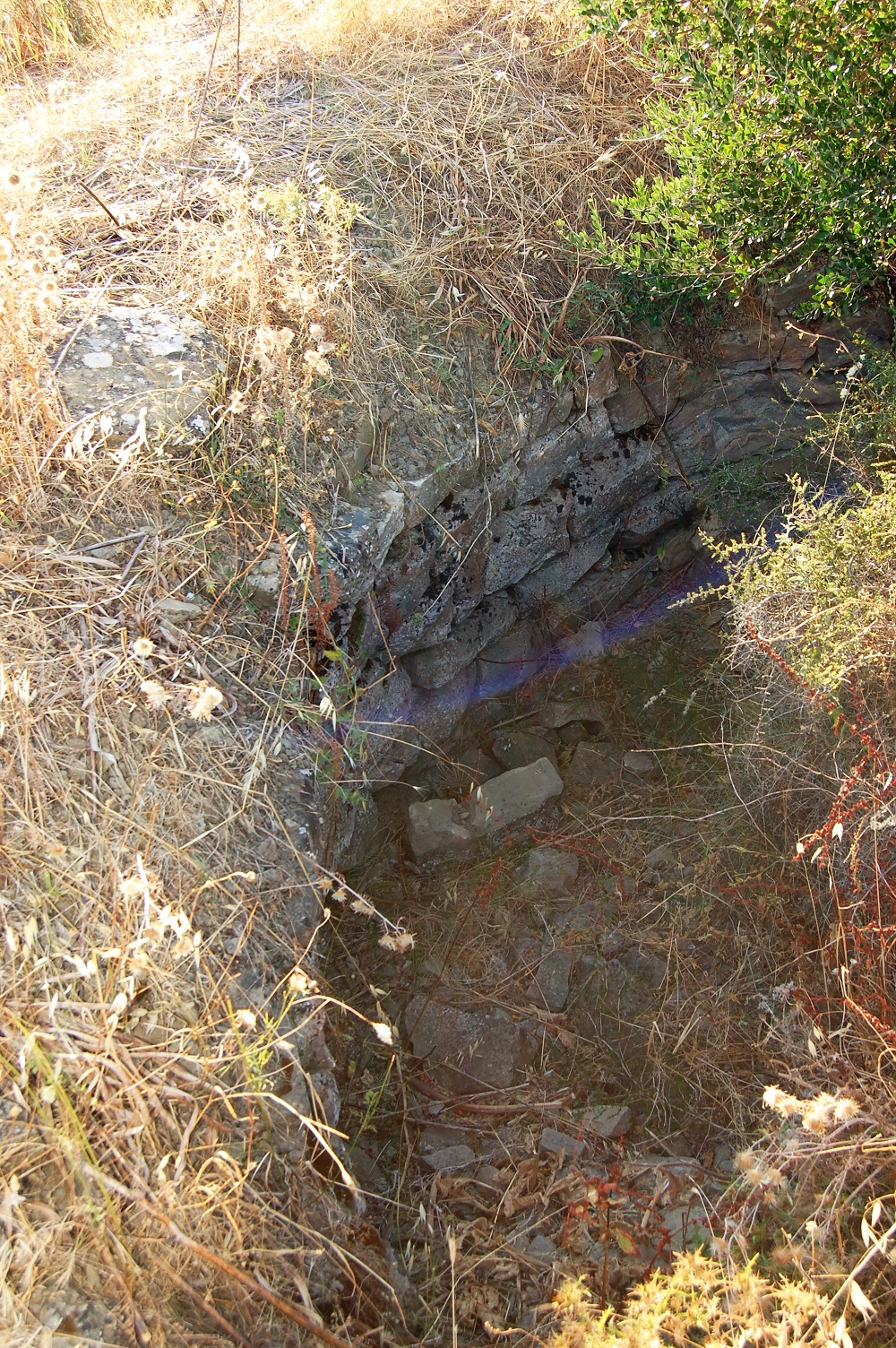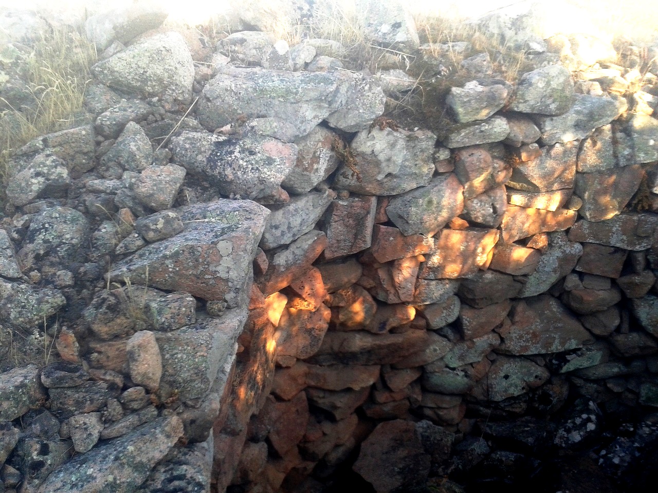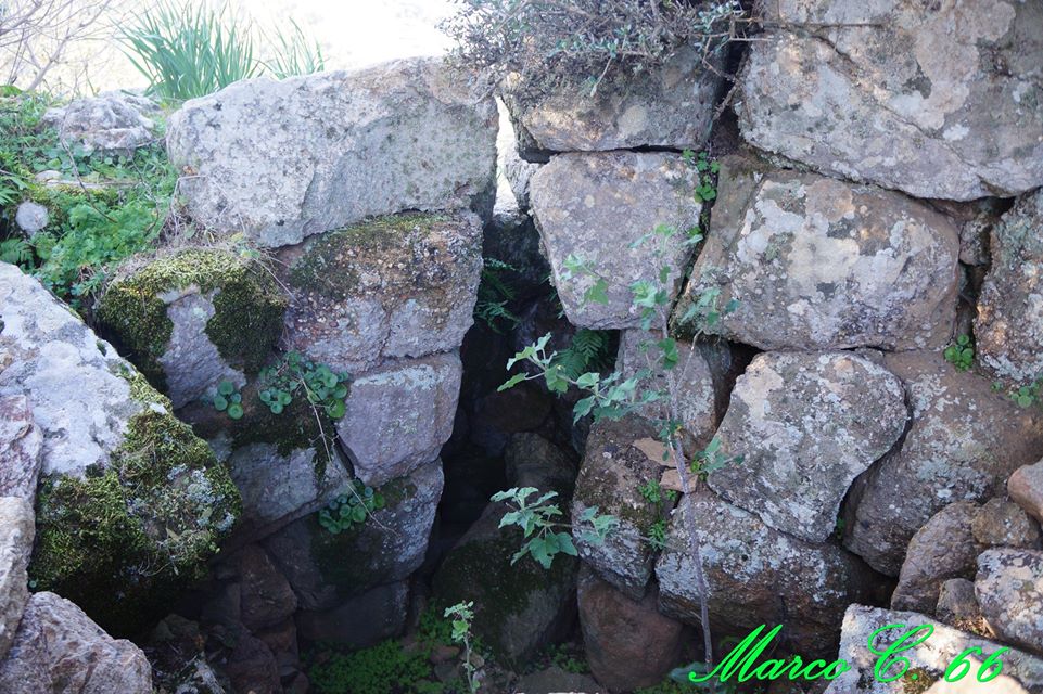 La parte esterna non è visibile perche’ coperta dal terreno,i massi sono visibili dall’interno entrando dalla parte alta di ciò che rimane del nuraghe,unico accesso disponibile.