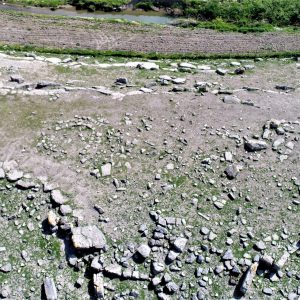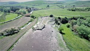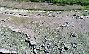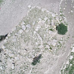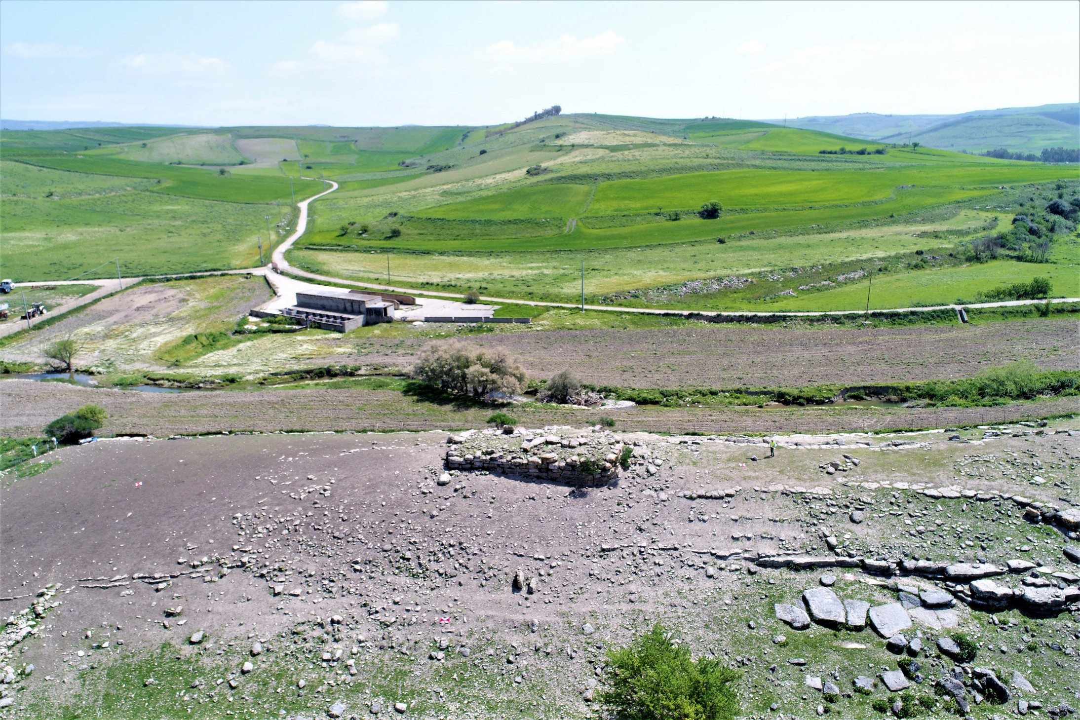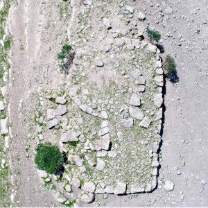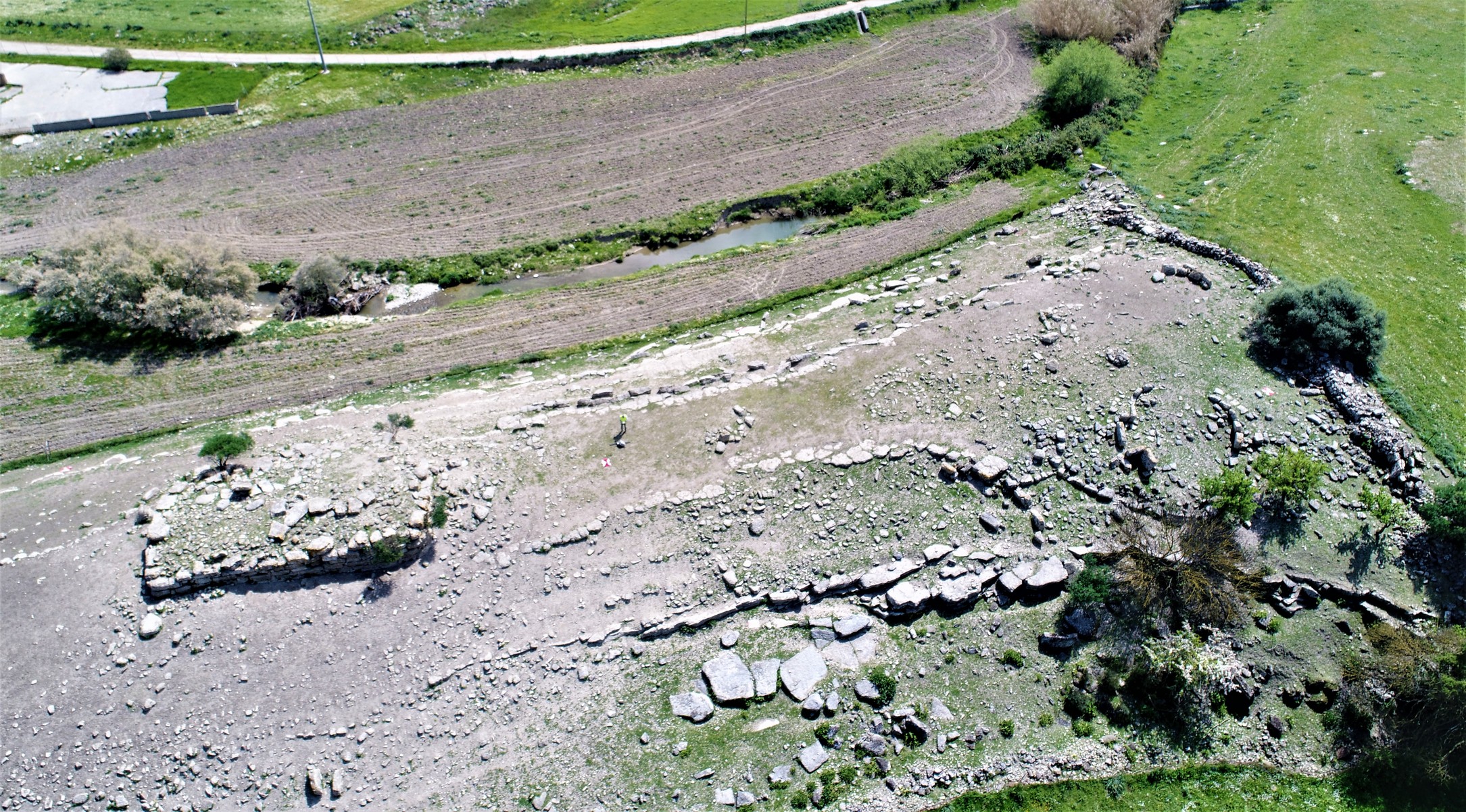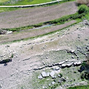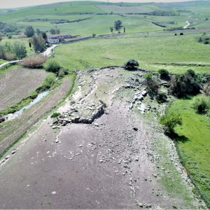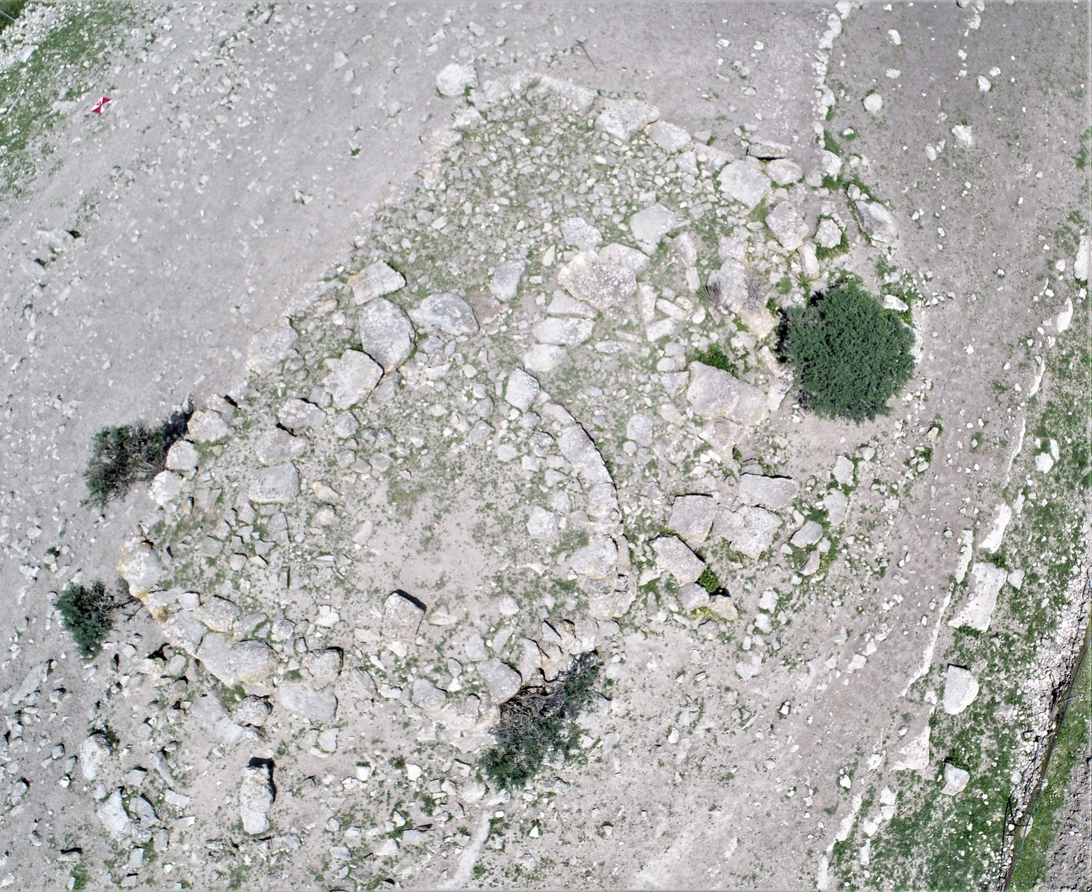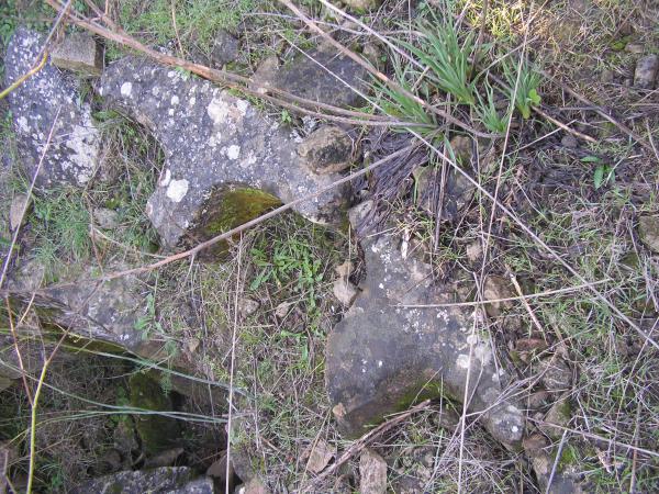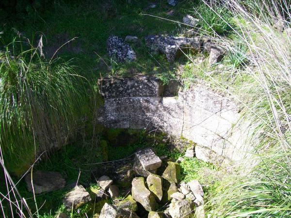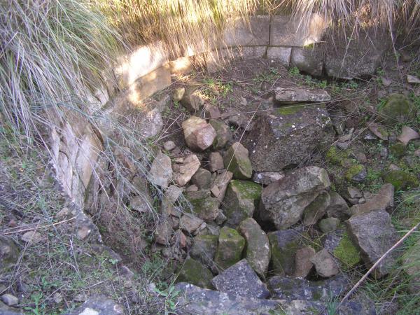 Nel filare inferiore, impostato direttamente sulla roccia naturale e raggiunto da scavi clandestini, è visibile la risega di fondazione che consente di ipotizzare la presenza di una conca raccolta acque scavato nella roccia stessa e oggi non visibile per la presenza di materiale di crollo e terriccio.