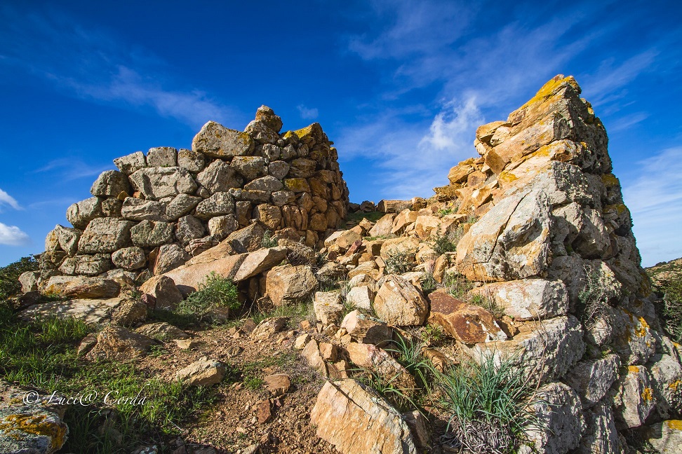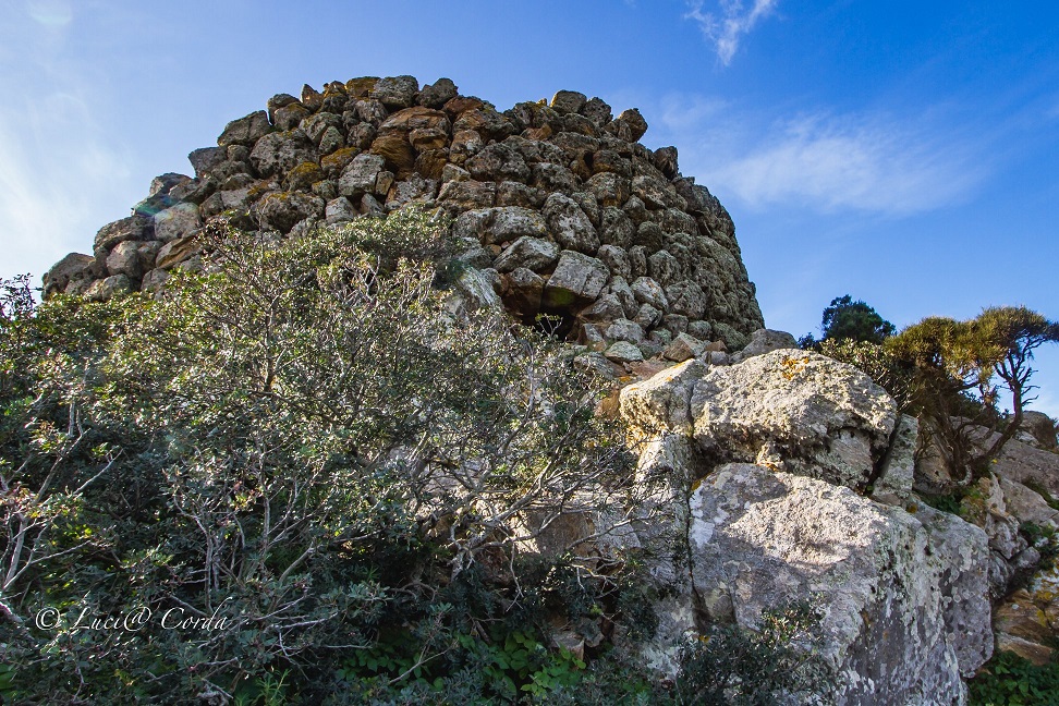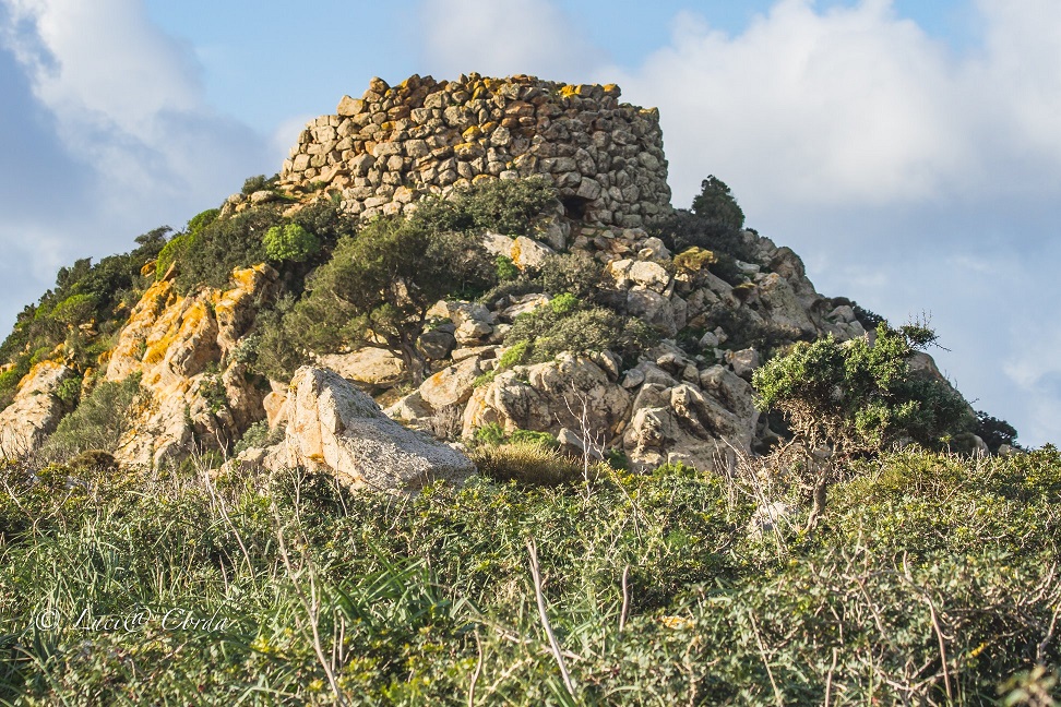 Nuraghe a Tholos di cui è ben visibile la torretta nord. La torre sud è franata sul lato mare. Presente un ingresso artificiale scavato da curiosi.