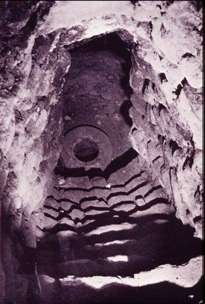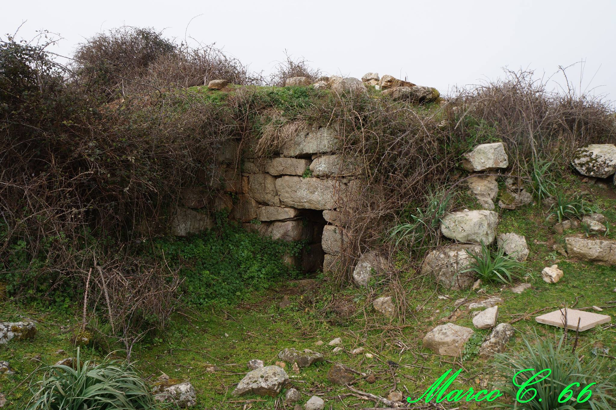 Dall”ingresso, orientato a sud/sud-est e mancante dell”architrave, si accede ad un andito strombato verso l”interno con copertura ad ogiva parzialmente residua. Sul lato sinistro del corridoio si apre l”accesso alla scala d”andito con copertura a piattabanda, della quale residuano tre blocchi.
