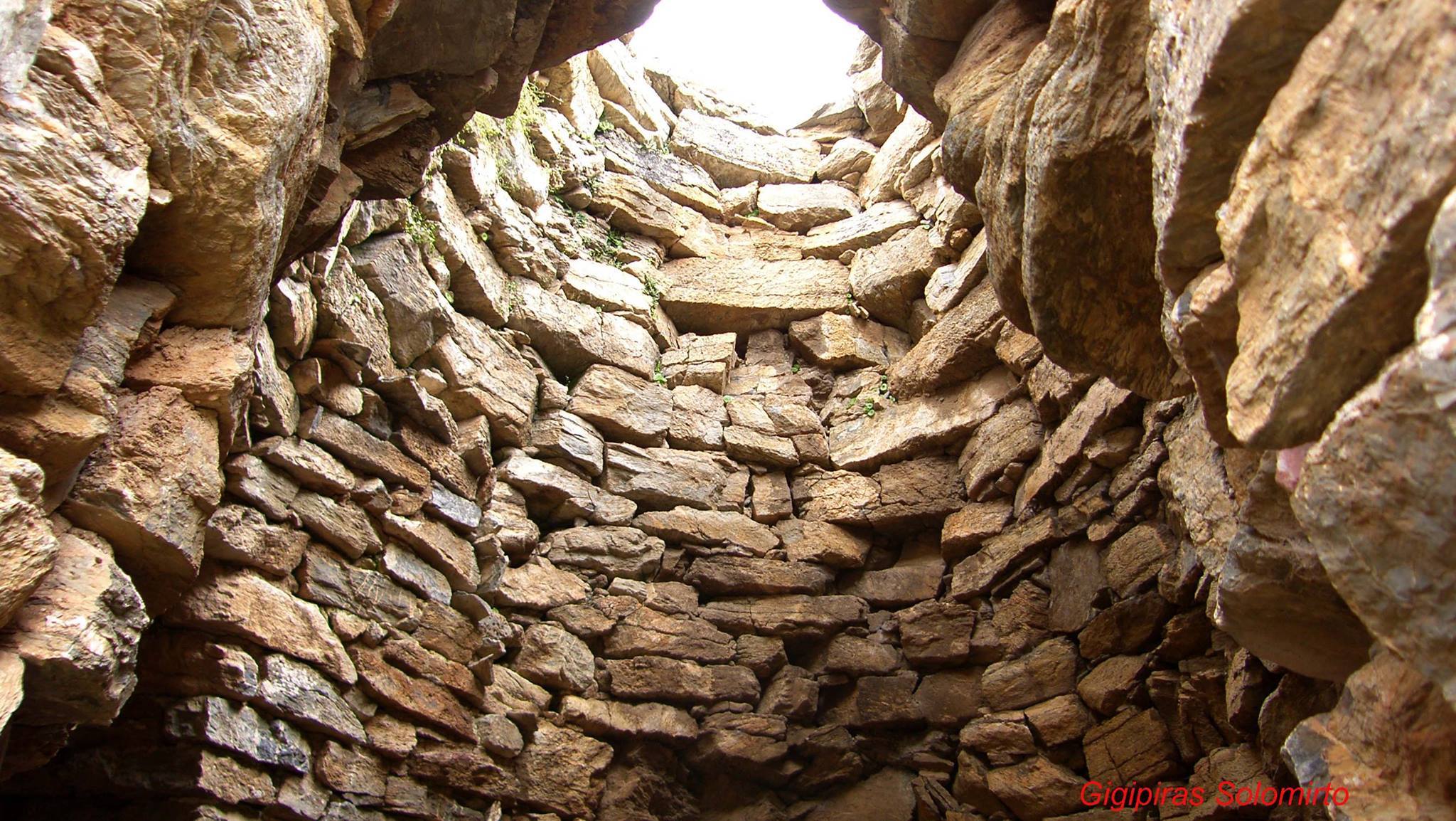 La torre, troncoconica presenta sul lato sud un vistoso cedimento strutturale che dall”ingresso arriva fino allo svettamento, interessando anche parte della “tholos”.