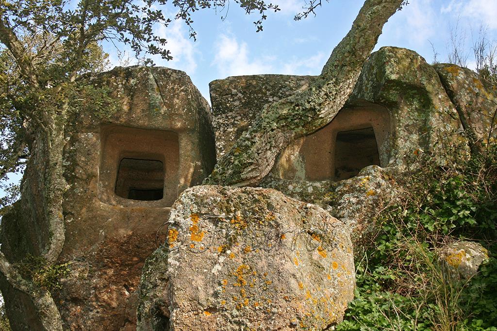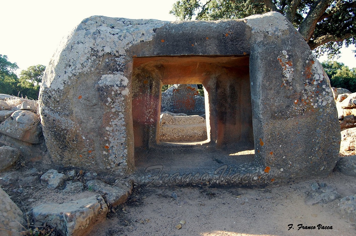 I sepolcri sono costituiti da due o tre anelli concentrici di pietre, talvolta con paramento gradonato per sostenere il tumulo. Al centro, la camera funeraria, alla quale accederai tramite un corridoio formato da lastroni ortostatici, coperti a piattabanda. Le celle interne sono circolari o allungate, in base a quante sepolture ospitassero. Le coperture erano tabulari o a pseudovolta. La grandiosa tomba II presenta ingresso, anticella e cella funeraria scavati in due distinti blocchi rocciosi accuratamente adagiati e predisposti: per fine lavorazione e disegno architettonico richiamano le sepolture a domus de Janas. Gli scavi hanno restituito vasetti miniaturistici, punte di freccia in ossidiana e vari altri oggetti, tra cui un pugnaletto in selce e un’accettina in pietra bianca. Dai manufatti si fa risalire il complesso al Neolitico recente (3200-2800 a.C) con ‘inserimenti’ tardivi sino al 2600 a.C.