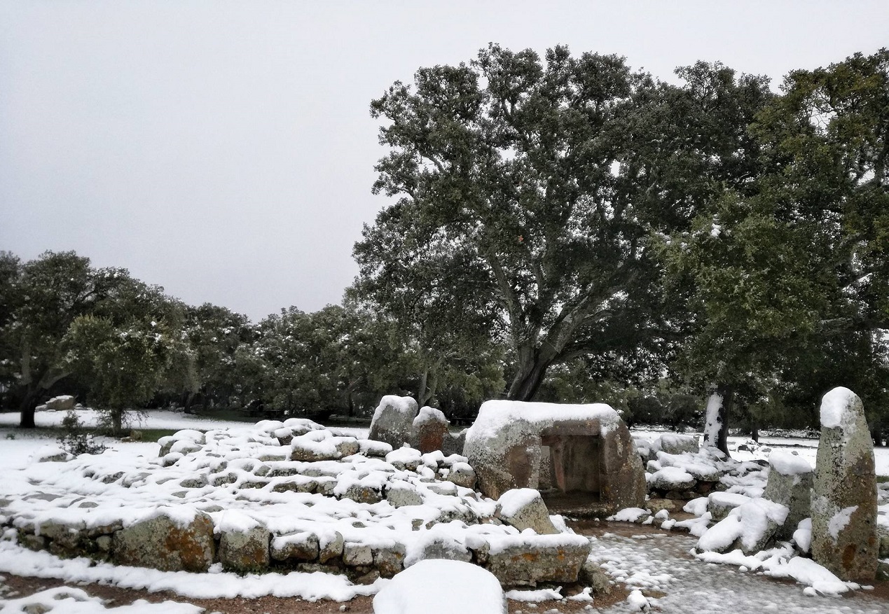 I sepolcri sono costituiti da due o tre anelli concentrici di pietre, talvolta con paramento gradonato per sostenere il tumulo. Al centro, la camera funeraria, alla quale accederai tramite un corridoio formato da lastroni ortostatici, coperti a piattabanda. Le celle interne sono circolari o allungate, in base a quante sepolture ospitassero. Le coperture erano tabulari o a pseudovolta. La grandiosa tomba II presenta ingresso, anticella e cella funeraria scavati in due distinti blocchi rocciosi accuratamente adagiati e predisposti: per fine lavorazione e disegno architettonico richiamano le sepolture a domus de Janas. Gli scavi hanno restituito vasetti miniaturistici, punte di freccia in ossidiana e vari altri oggetti, tra cui un pugnaletto in selce e un’accettina in pietra bianca. Dai manufatti si fa risalire il complesso al Neolitico recente (3200-2800 a.C) con ‘inserimenti’ tardivi sino al 2600 a.C.