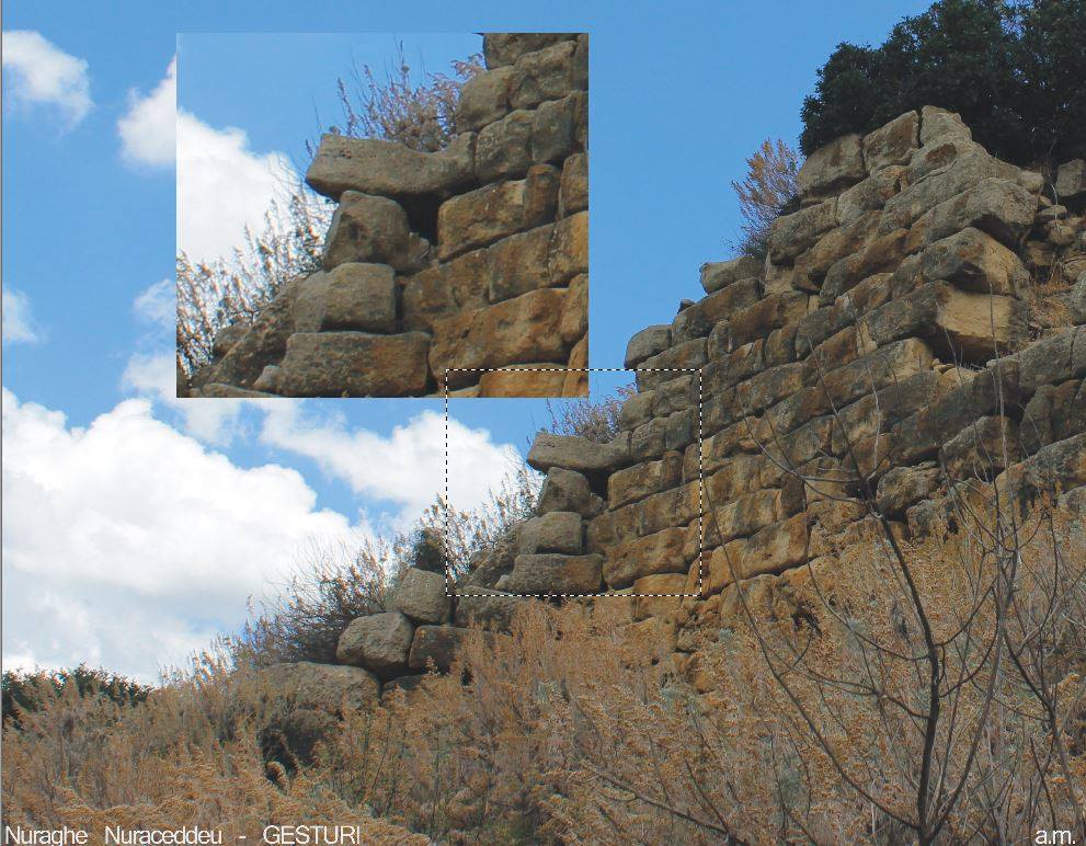 Il nuraghe Nuraceddeu, mostra una curiosa pietra lavorata e sagomata in modo tale, da realizzare il raccordo tra la parte rettilinea del bastione e una delle torri nuragiche.