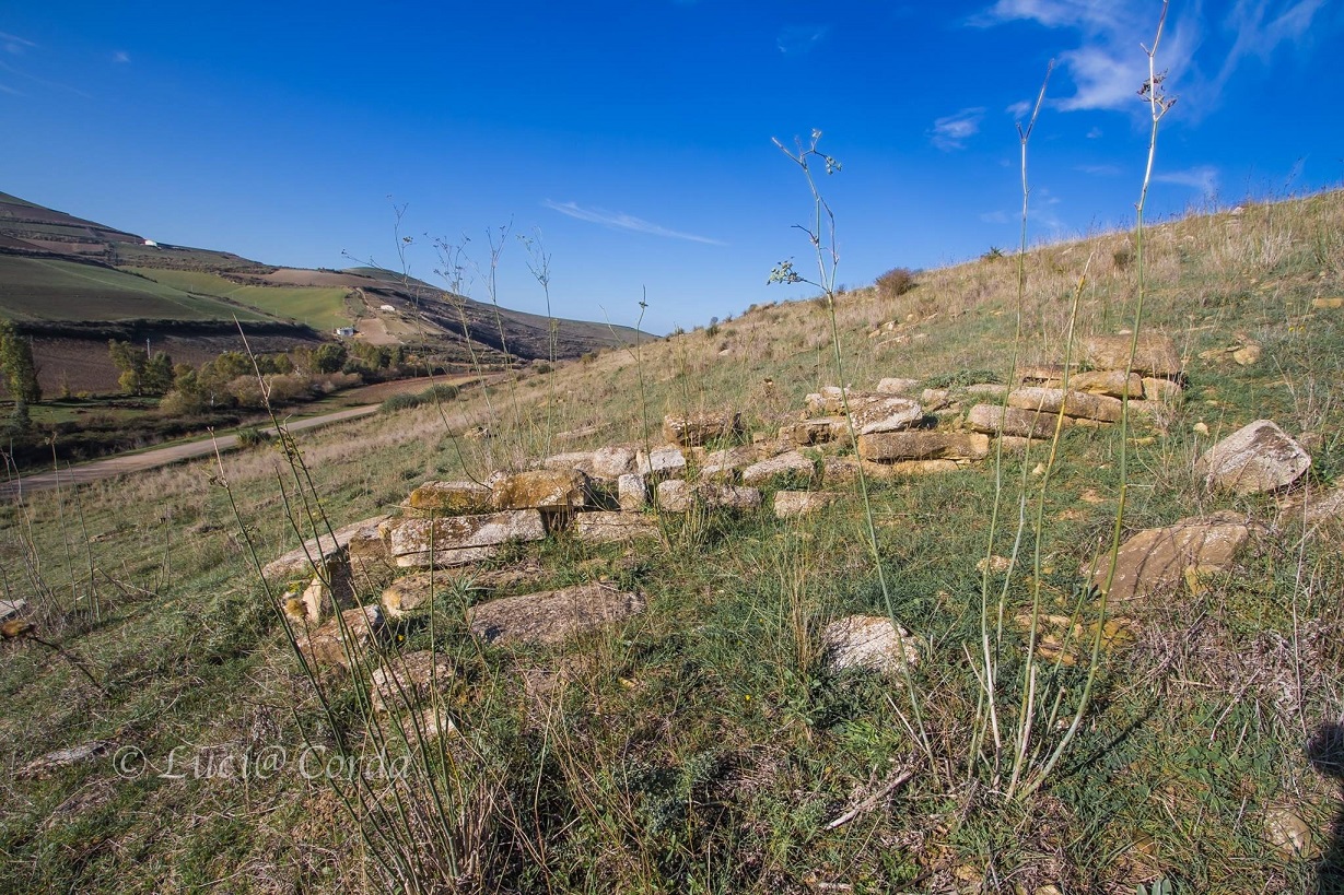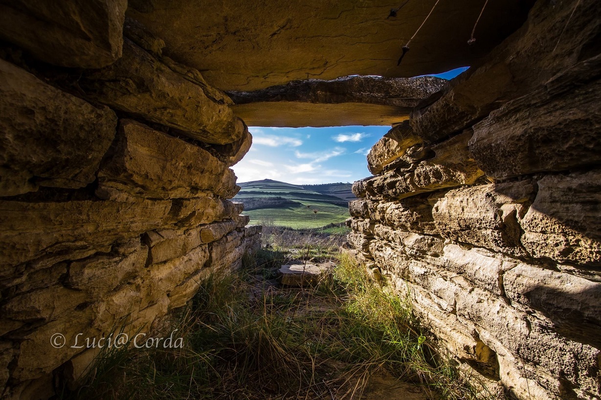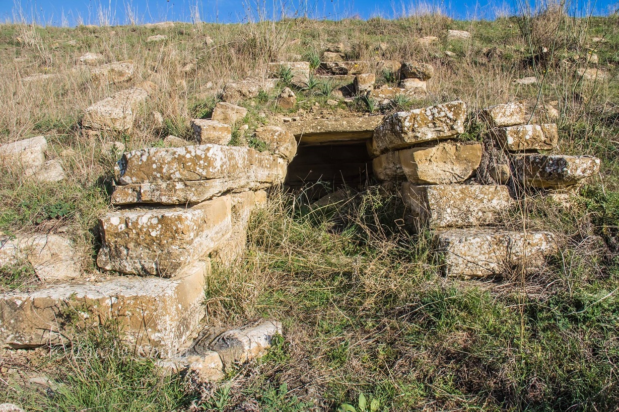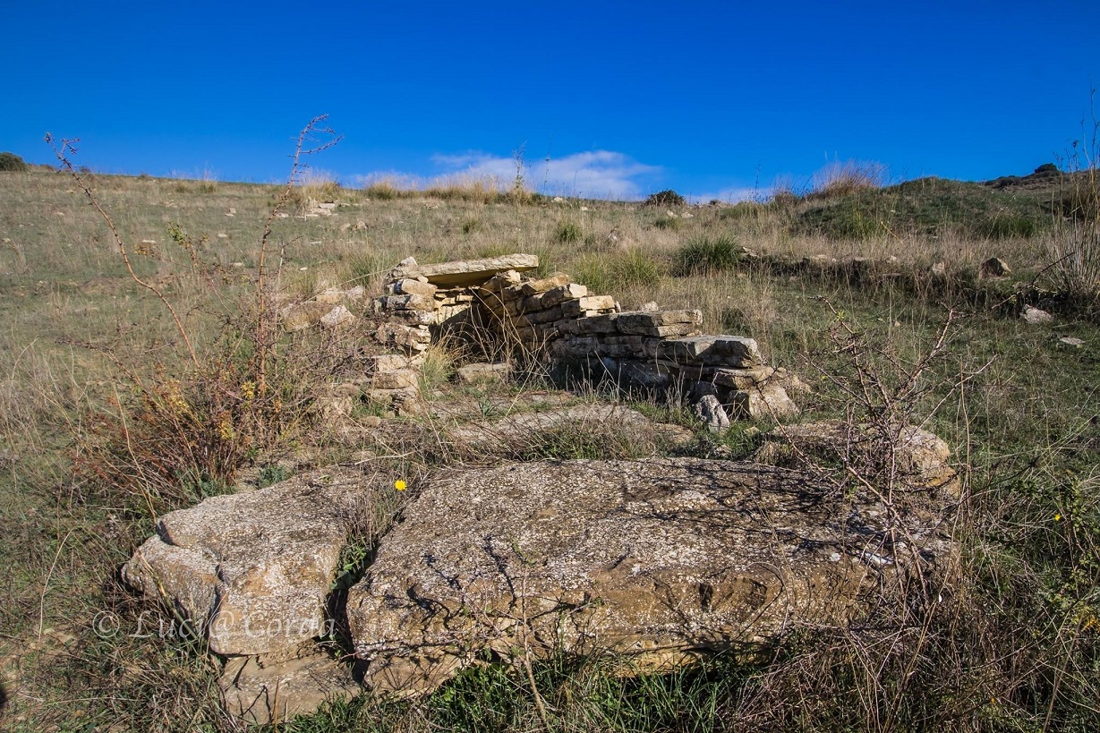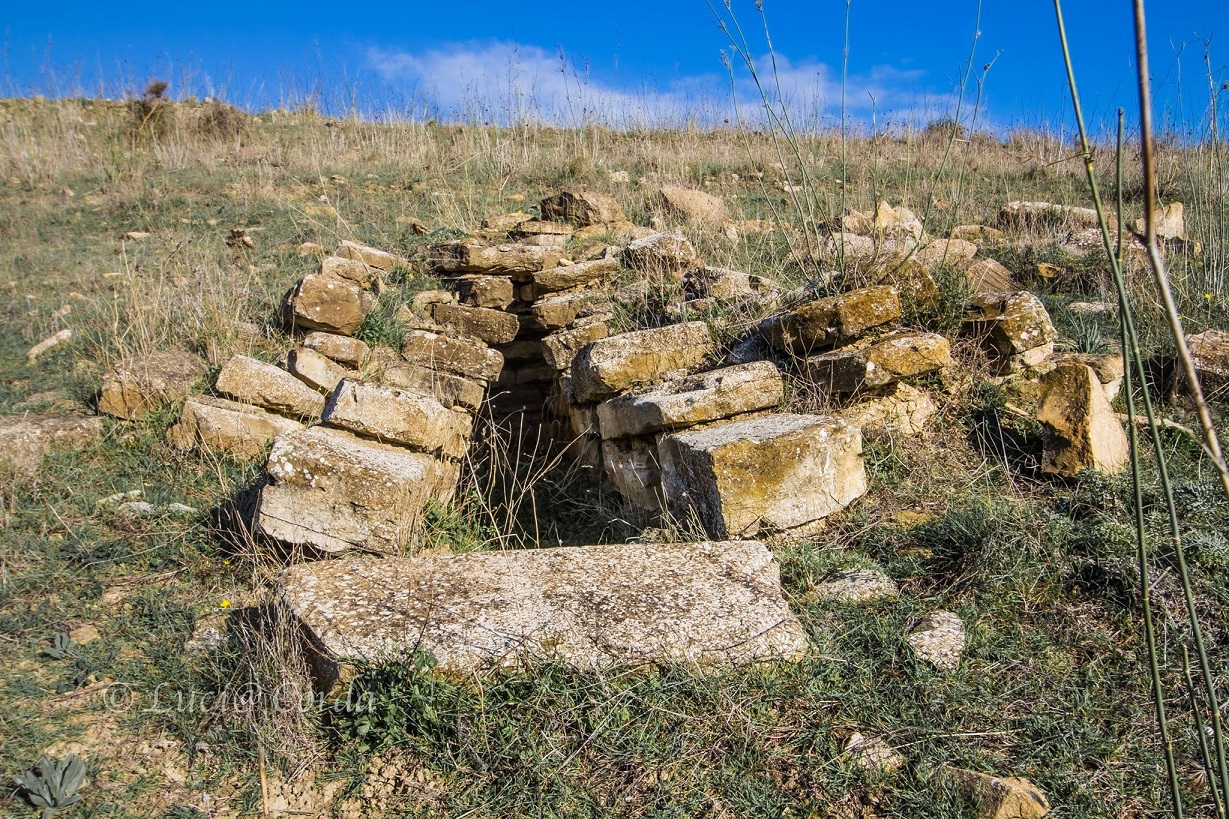 Queste grandi opere sono realizzati in lastre di calcare disposte a filari progressivamente sempre più aggettanti verso l’alto e la copertura era ottenuta mediante una serie di lastre che fungevano da architrave. Da notare la pavimentazione ottenuta con dei grandi massi squadrati con uno spessore di una decina di cm. Abbiamo riportato solo 3 delle 4 tombe presenti sulla collina. Da notare i due massi che presentano dei solchi molto evidenti.