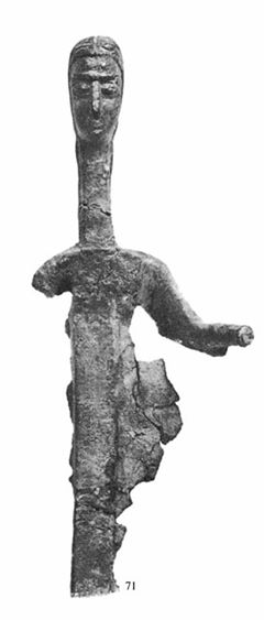 Curiosità: Lilliu sottolinea l’impressionante stilismo longilineo del collo e la forma cruciforme o spadiforme del corpo. Quest’ultima ricorda stilizzazioni del neolitico cretese, cicladico, tessalico, tracico, palestinese, etc.