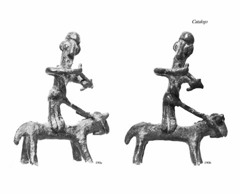 Curiosità: il personaggio é rappresentato in posizione acrobatica, sicuramente inconsueta come pratica di equitazione. Per Lilliu il bronzetto rappresenta un cavallerizzo equilibrista che si esibisce al tiro al bersaglio con l’arco, in una festa stagionale in uno dei tanti santuari nuragici. A ricordo della festa, e forse della vittoria di un torneo, il personaggio potrebbe aver lasciato nel santuario la sua immagine votiva.