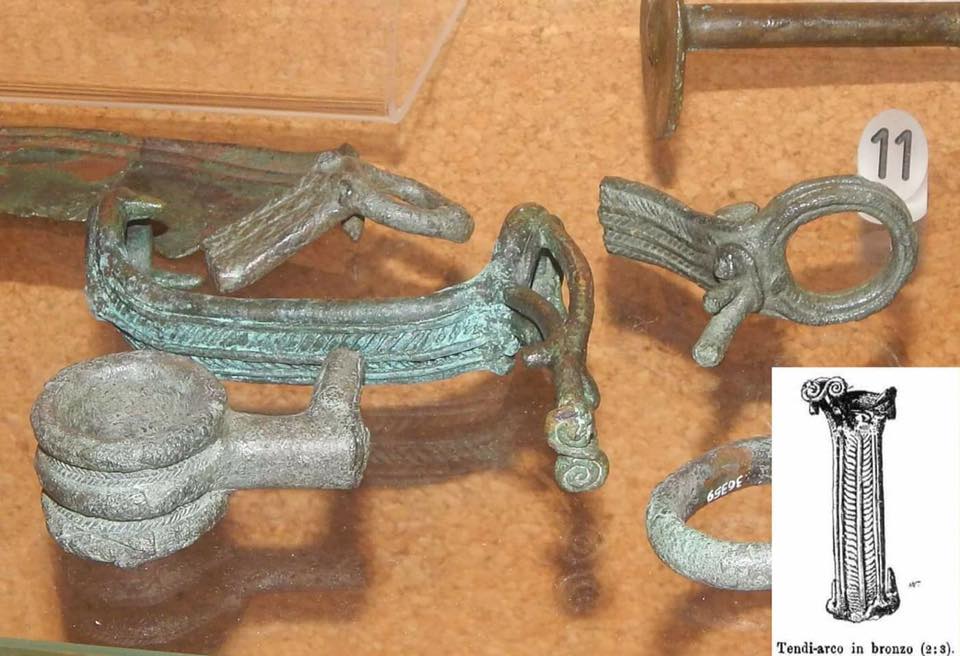 Tale forma di tendiarco non ha nulla a che fare con quei presunti tendiarco ad anelli gemini con punte,che anche lo Strobel cercò invece di definire cavezzoni di cavallo.La decorazione del nostro presunto tendiarco a doppia spirale,ricorda quelle di talune fibule della Beozia, dell’Italia Meridionale e di Hallstatt,che pure essendo una riminiscenza micenea, discendono ad epoca tarda, mostrando la persistenza di tale motivo decorativo.(…..)”