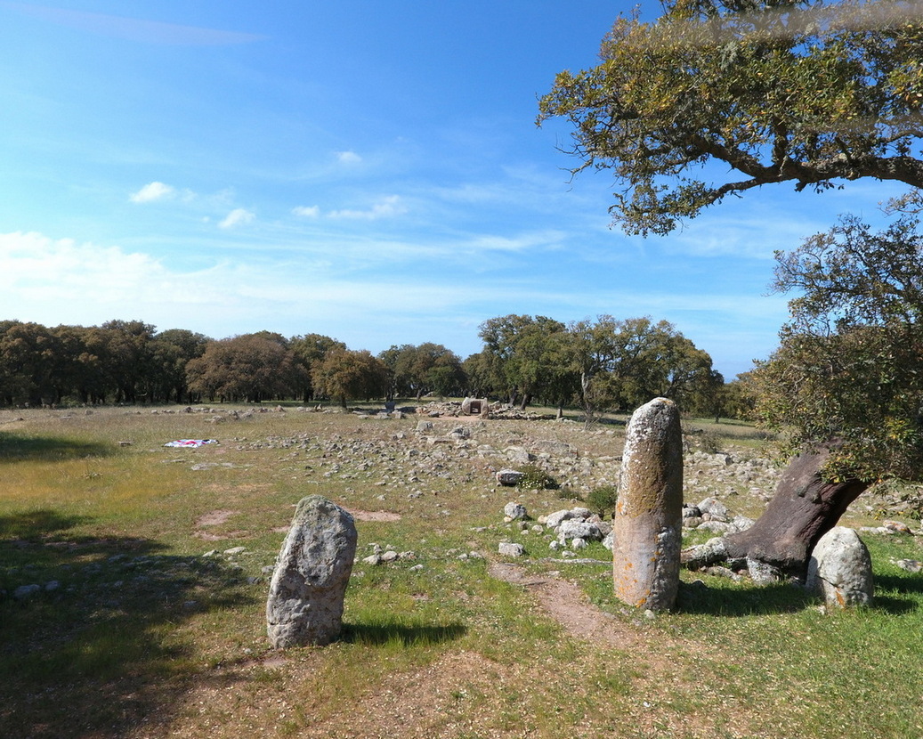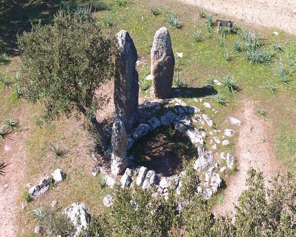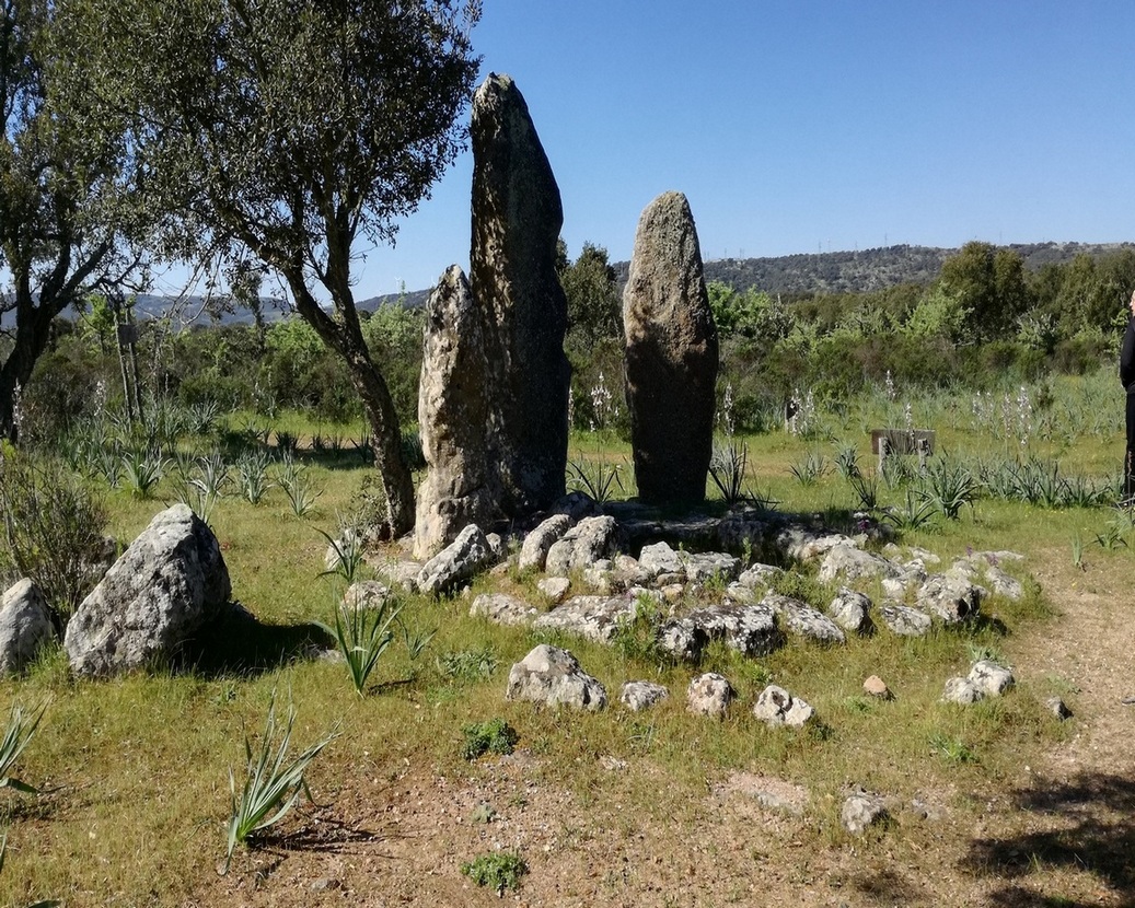 Tre menhir di altezza e dimensioni decrescenti, rappresentanti una triade o “una famiglia”. I menhhir sono installati sopra un circolo lapideo