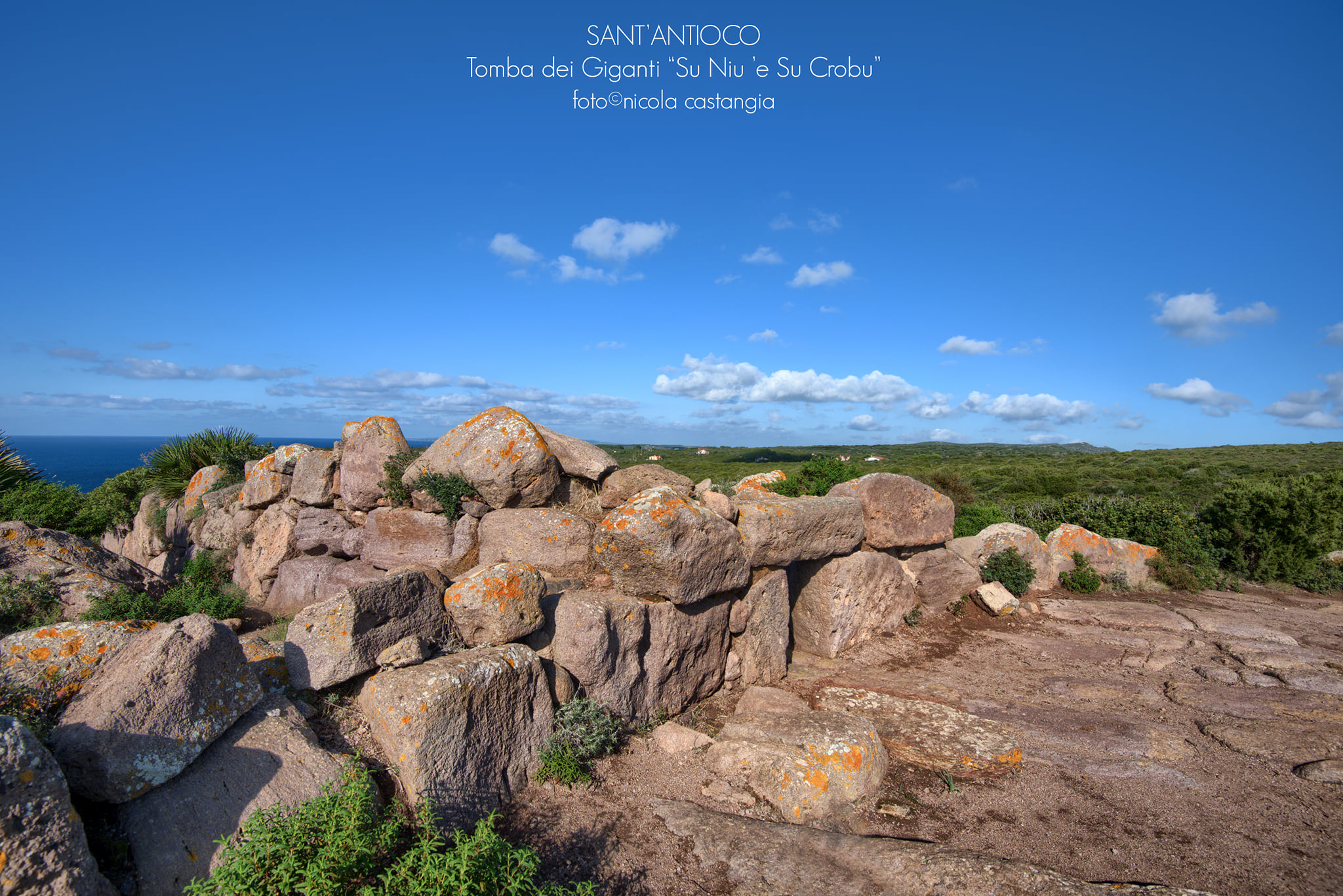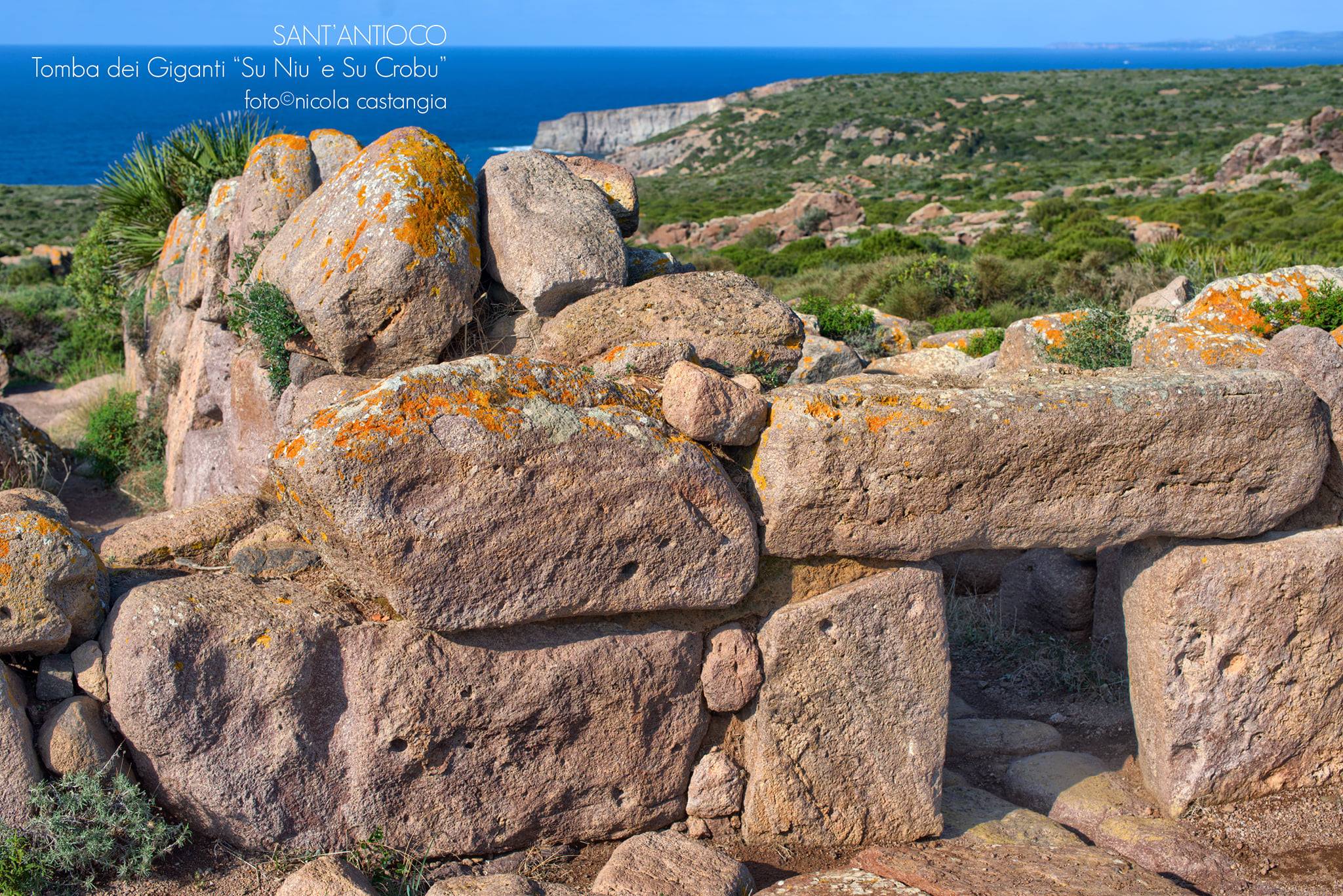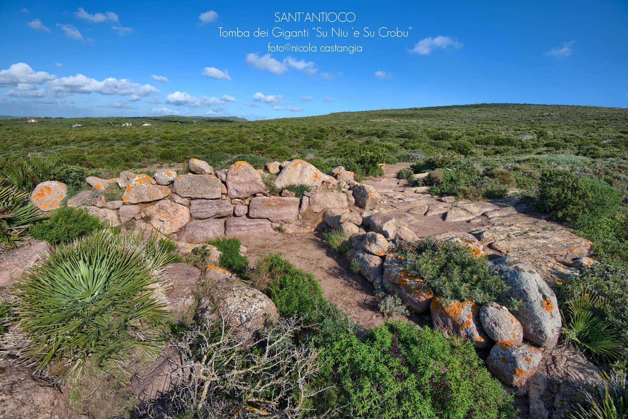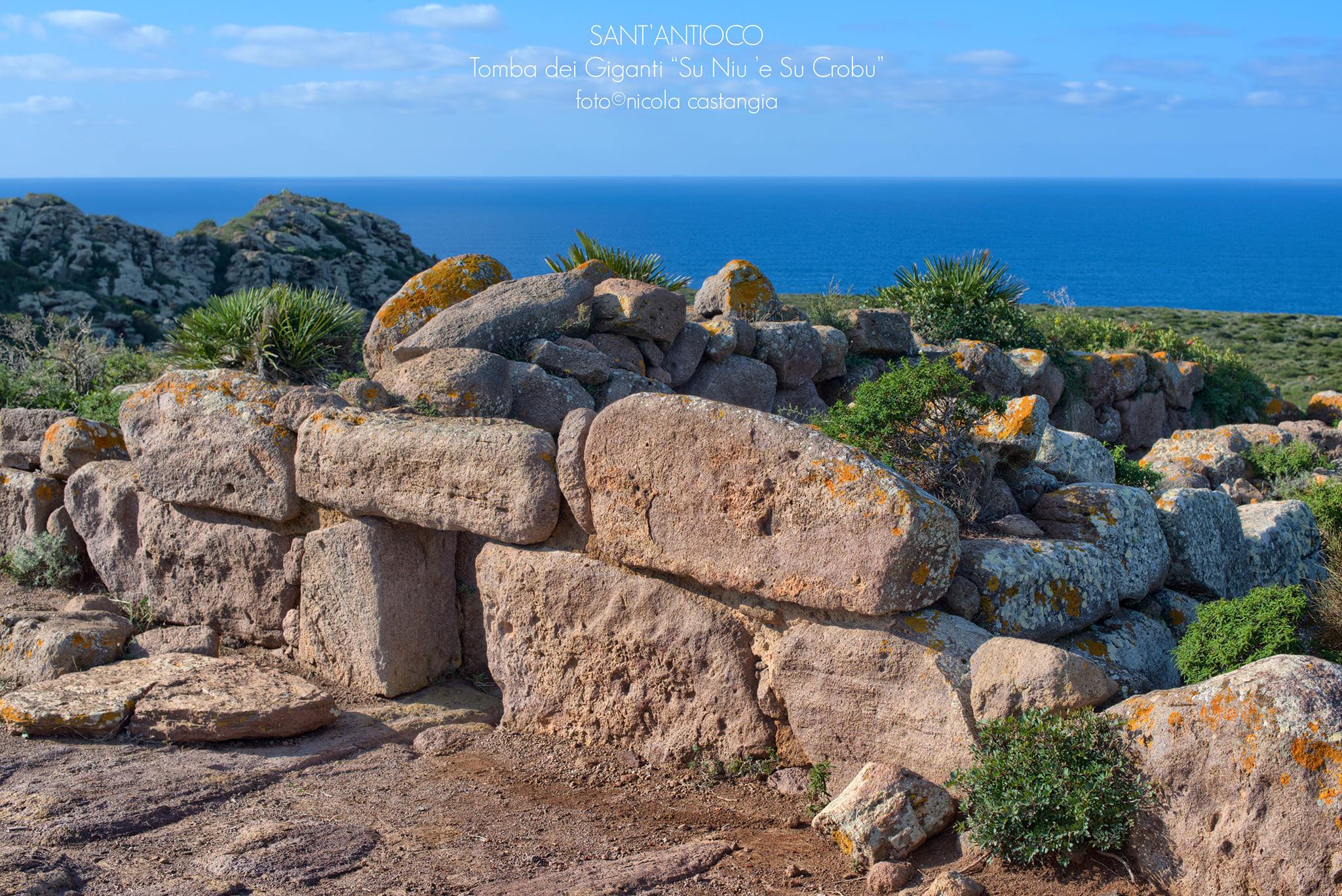 La tomba dei giganti Su Niu de su Crobu sorge su un’altura rocciosa, non lontano dal mare, in località Sa corona de su crabì. La sepoltura, del tipo “a filari”, è costituita da un corridoio funerario absidato lungo poco più di 10 m. e largo in media 1,20 m.; le pietre che lo compongono sono poco lavorate, disposte a file irregolari e consolidate con numerose zeppe.