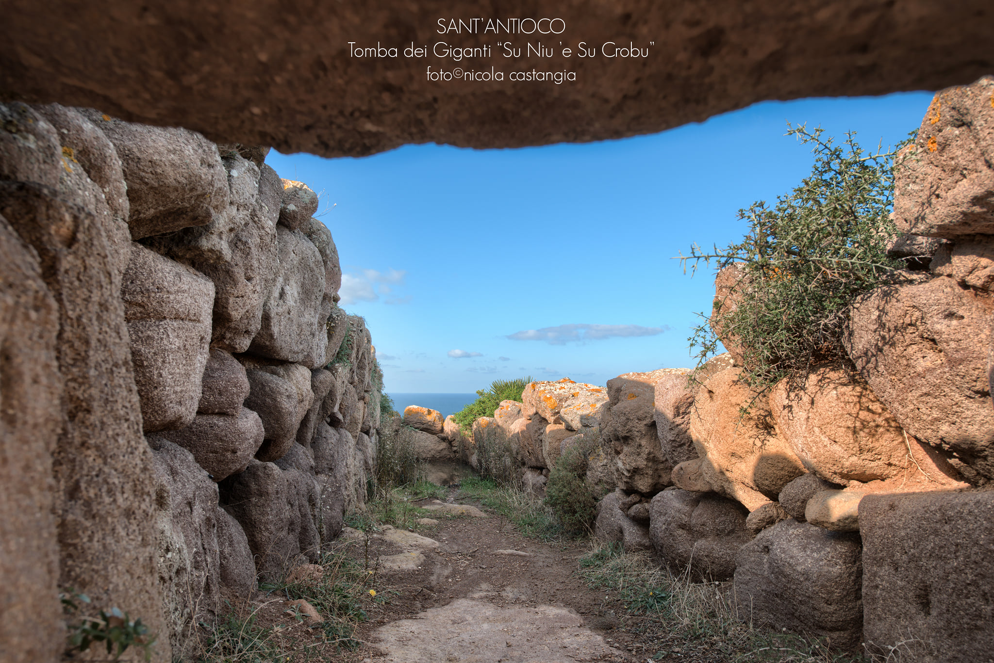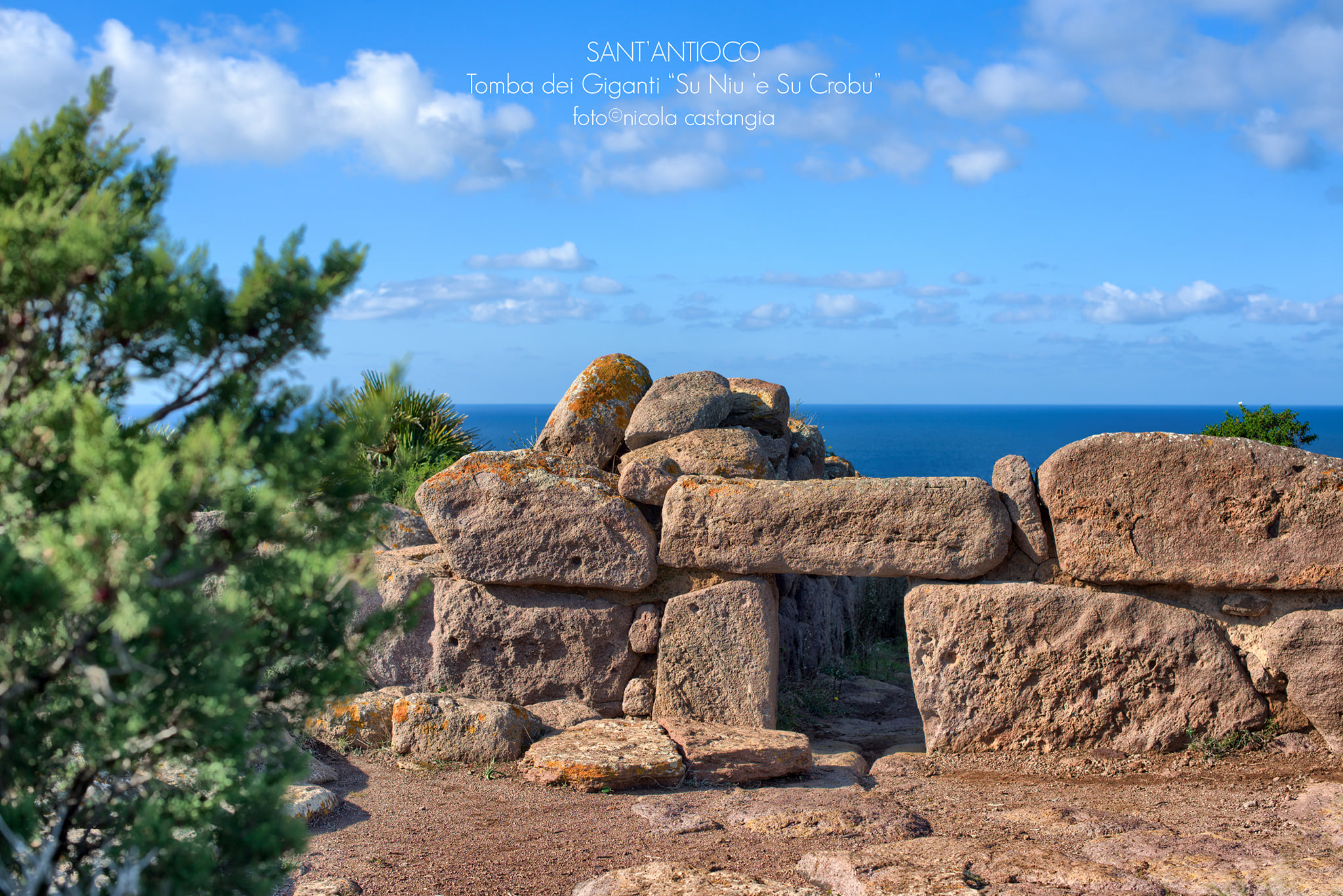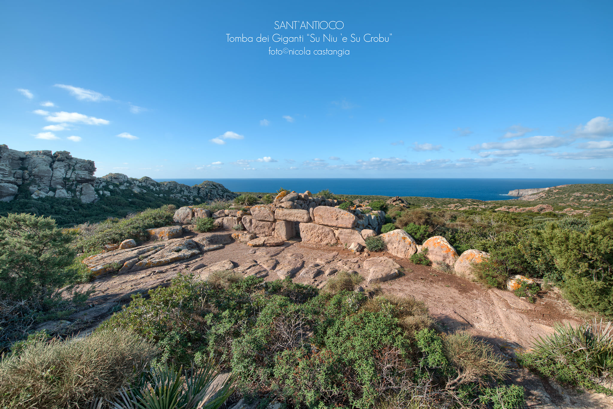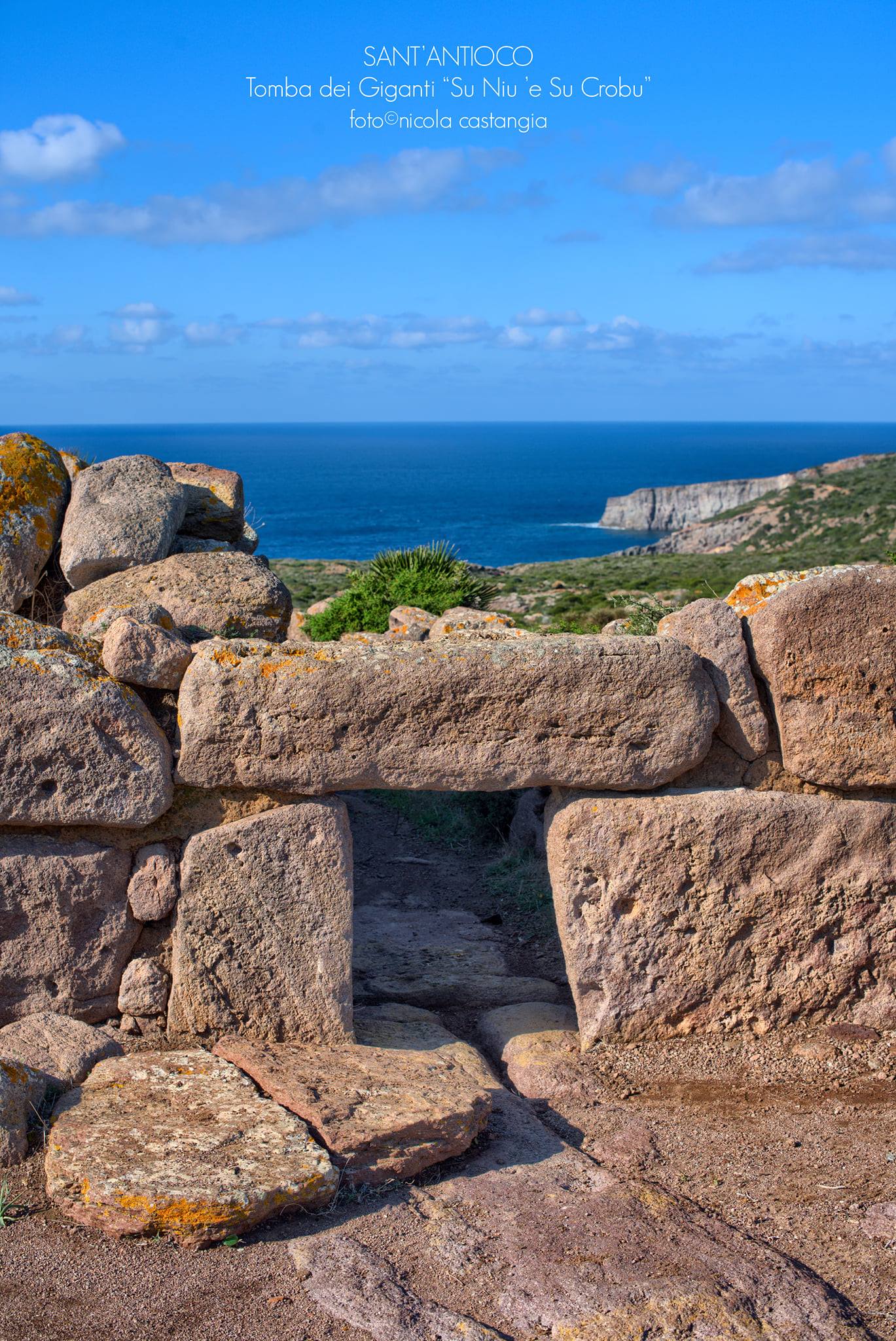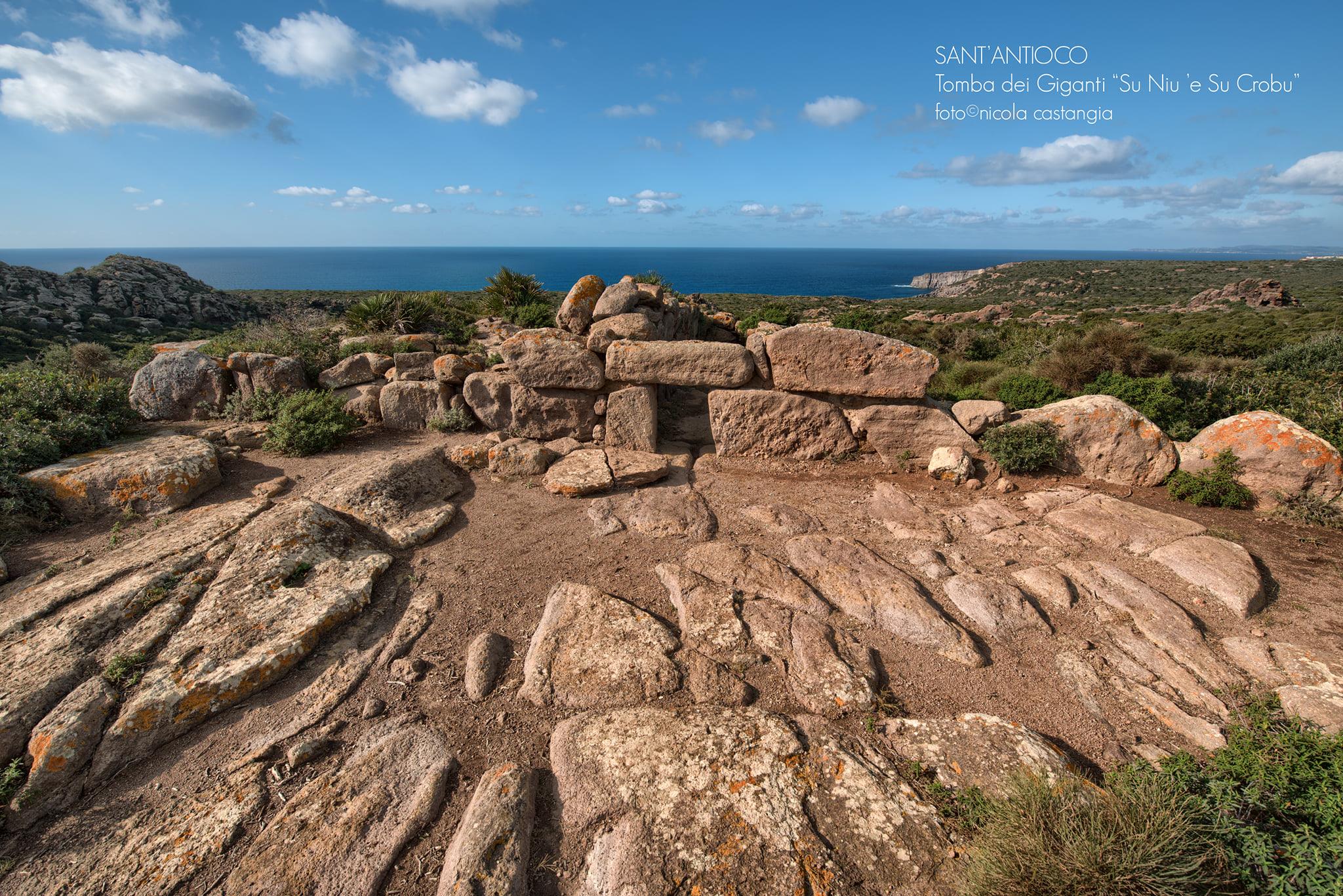 La tomba dei giganti Su Niu de su Crobu sorge su un’altura rocciosa, non lontano dal mare, in località Sa corona de su crabì. La sepoltura, del tipo “a filari”, è costituita da un corridoio funerario absidato lungo poco più di 10 m. e largo in media 1,20 m.; le pietre che lo compongono sono poco lavorate, disposte a file irregolari e consolidate con numerose zeppe.