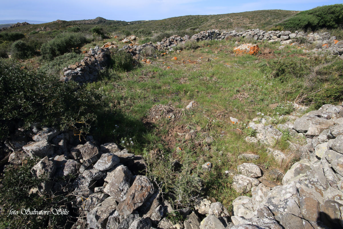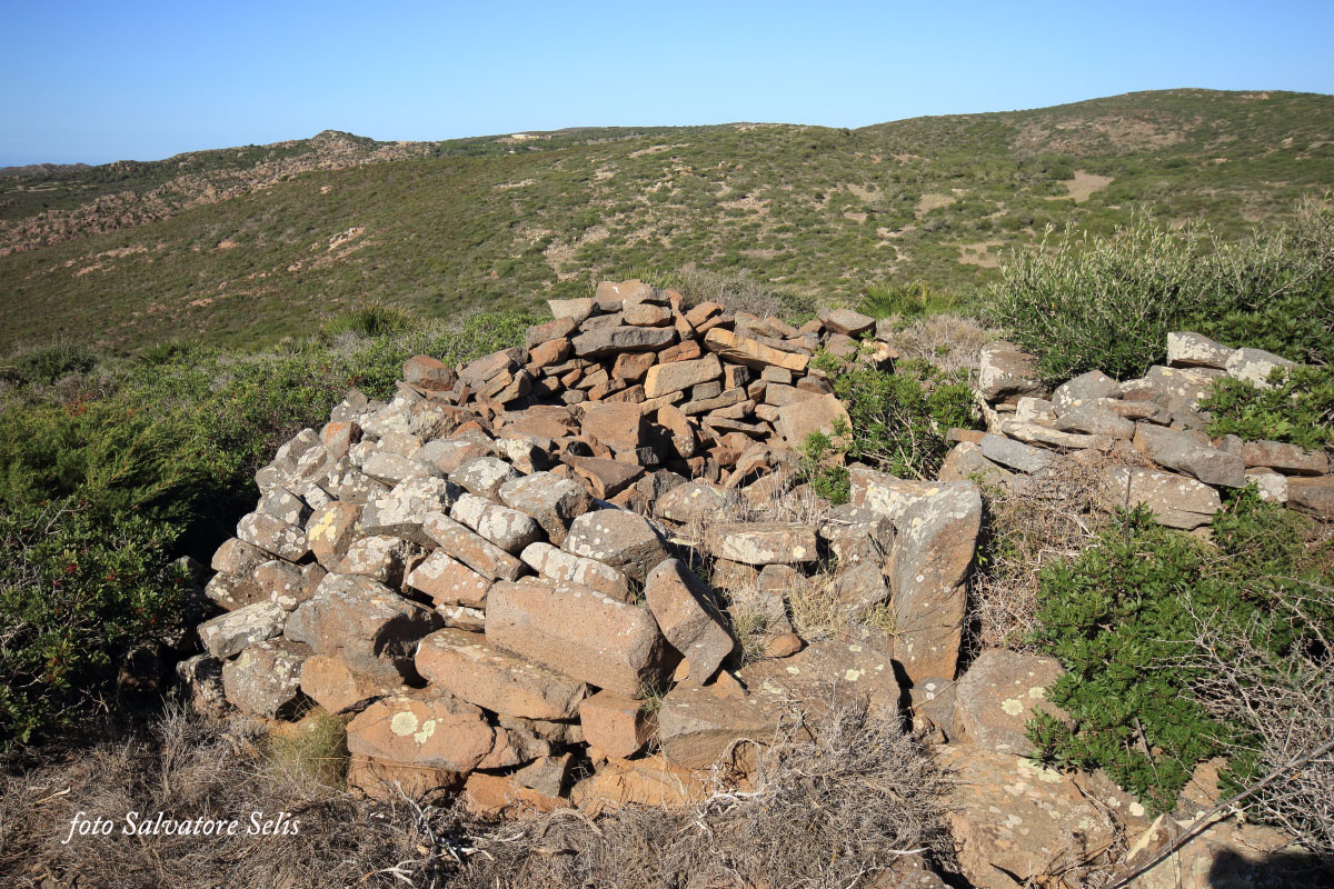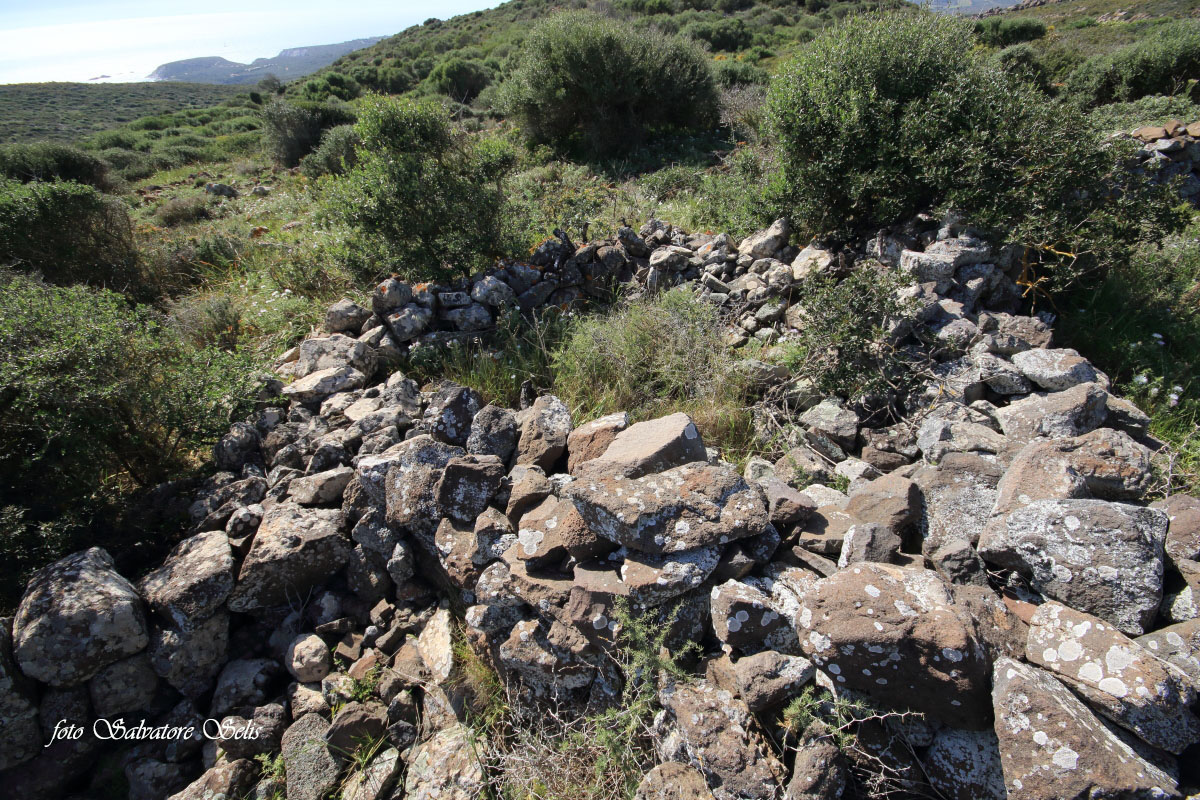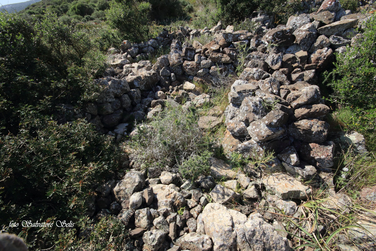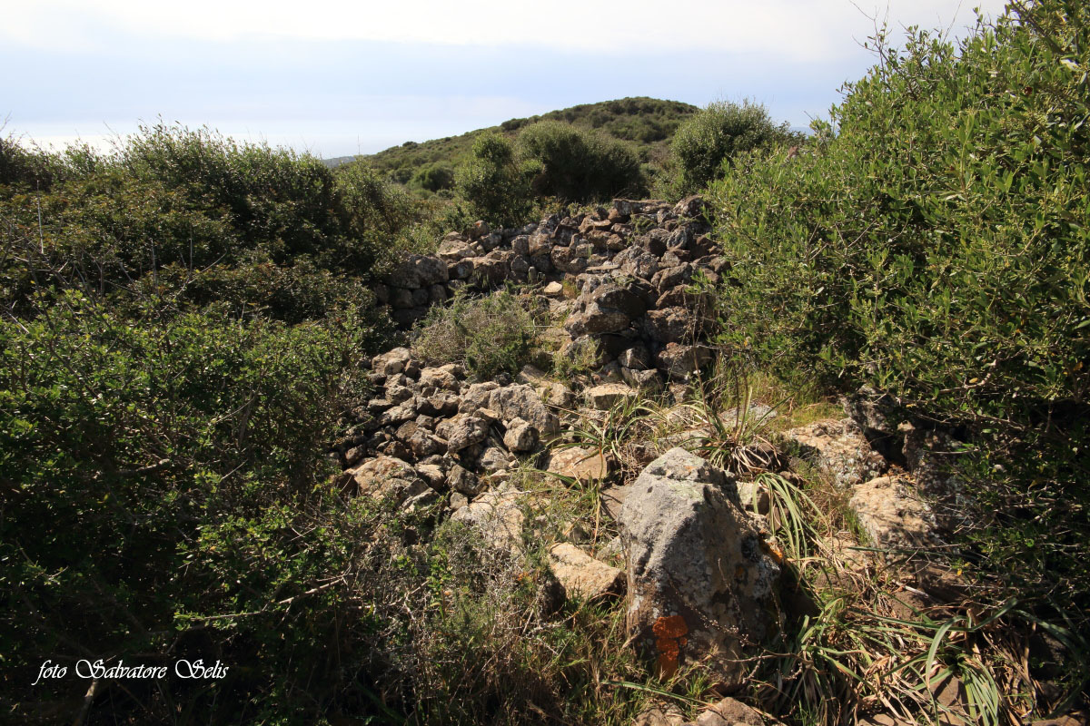 Capanna nuragica. Si presenta di forma circolare, realizzata con pietre piatte di varie dimensioni, sovrapposte l’una all’altra in filari aggettanti verso il centro. Il muro ha forma conica: alla base ha una larghezza di 150 cm ca., al vertice una larghezza di 70 cm ca e un’altezza residua di 130 cm ca. Il muro si interrompe per circa 100 cm nella parte sud est (forse l’ingresso), per un crollo della struttura, probabilmente causata da alberi di olivastro e lentisco.