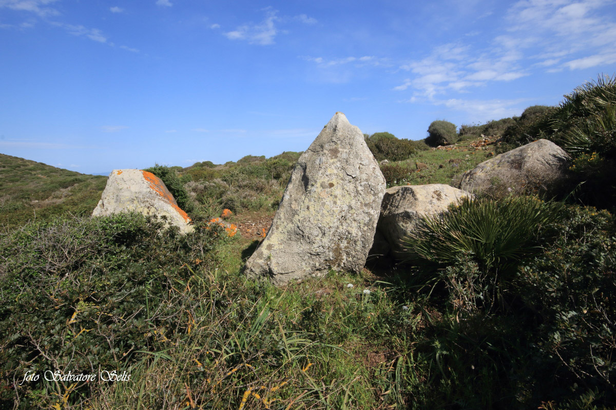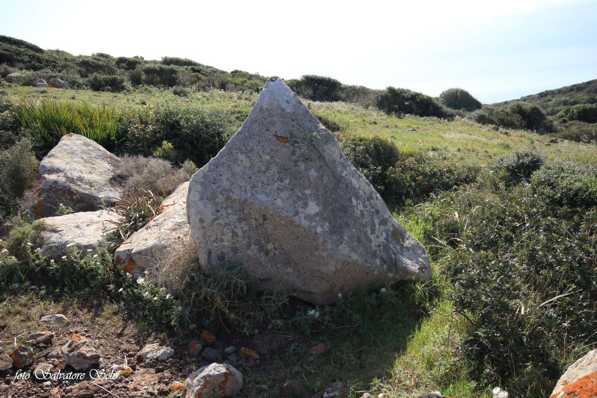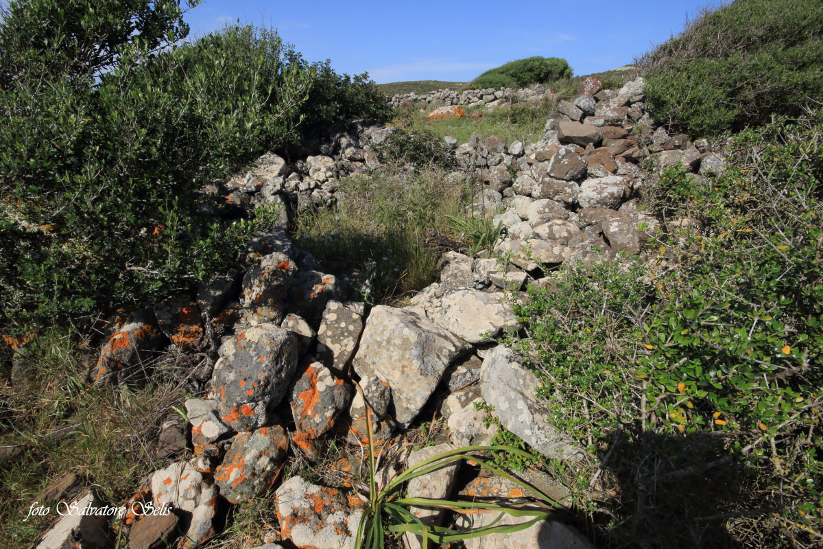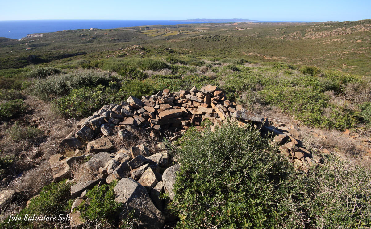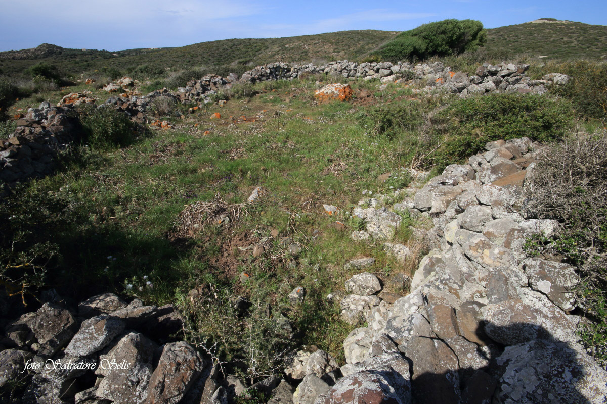 Capanna nuragica. Si presenta di forma circolare, realizzata con pietre piatte di varie dimensioni, sovrapposte l’una all’altra in filari aggettanti verso il centro. Il muro ha forma conica: alla base ha una larghezza di 150 cm ca., al vertice una larghezza di 70 cm ca e un’altezza residua di 130 cm ca. Il muro si interrompe per circa 100 cm nella parte sud est (forse l’ingresso), per un crollo della struttura, probabilmente causata da alberi di olivastro e lentisco.