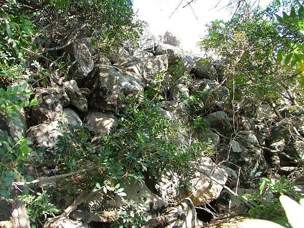 Nuraghe diroccato, avvolto dagli arbusti e non leggibile