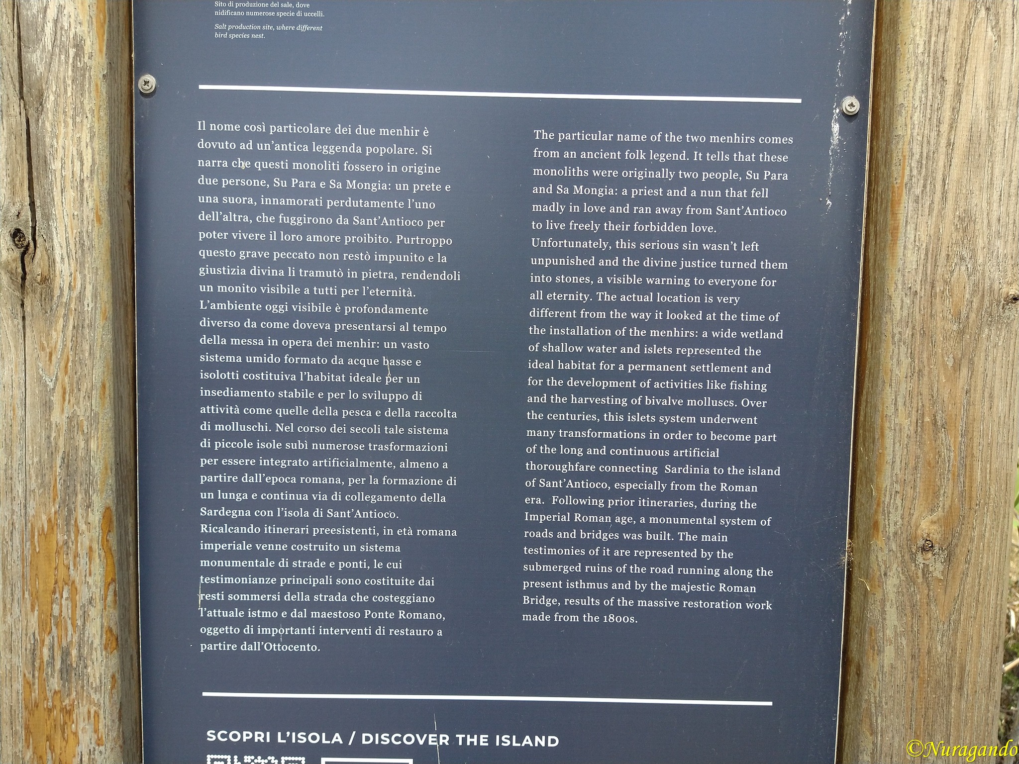 Percorrendo l’istmo (S.S 126) che dall’isola madre porta a Sant’Antioco, sulla nostra sinistra possiamo scorgere due pietre fitte (menhirs aniconici) di roccia trachitica denominati “su para e sa mongia” (il frate e la suora), che, la leggenda vuole fossero due religiosi fuggiti per sottrarsi all’immancabile e severo castigo dei loro giudici e quindi pietrificati da un potere divino, per poi collocarli proprio in quel punto.
