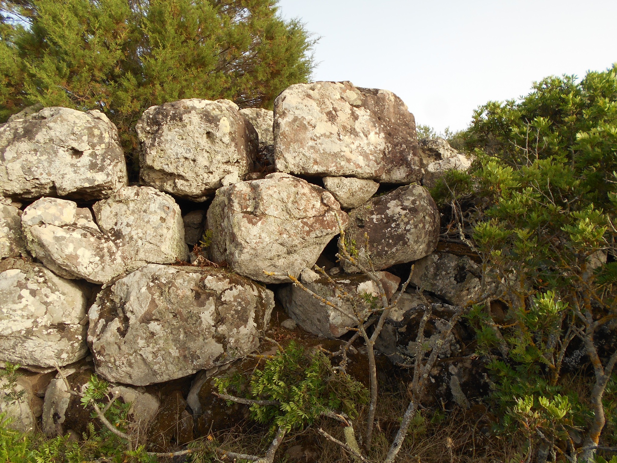 Monotorre inglobato in un bastione. Si vedono 4 filari di enormi blocchi di arenaria del muraglione, per un’altezza di quasi 2 metri. Salendo sul muraglione si vede la cima diruta della torre