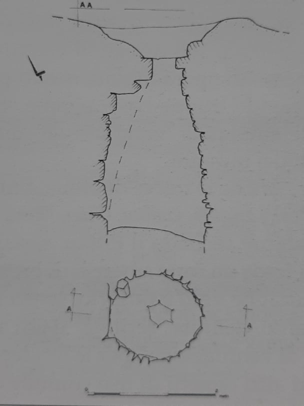 Si tratta delle rovine di un edificio, costruito con grossi blocchi, completamente interrato; in superficie emergono solamente pochi resti sconvolti. Uno dei grossi massi di superficie diversi anni fa venne rimosso da un mezzo agricolo mettendo in evidenza un pertugio attraverso il quale si potè accedere dentro la struttura. Si tratta, con tutta probabilità, di un silos per approvvigionamento idrico o per viveri. La muratura di rivestimento ai fianchi è in massi di medie dimensioni disposti in filari sovrapposti ed aggettanti verso l’imboccatura. La forma è tronco-conica con rigonfiamento inferiore. Diametro alla base m. 1,55; altezza m. 2,73.