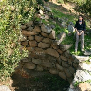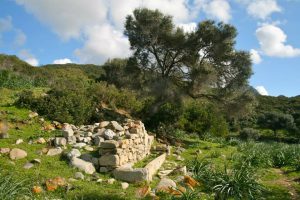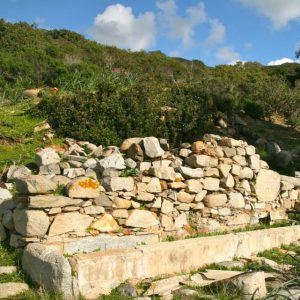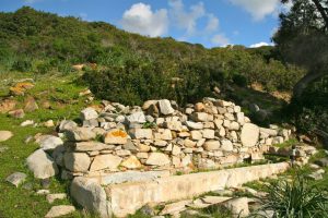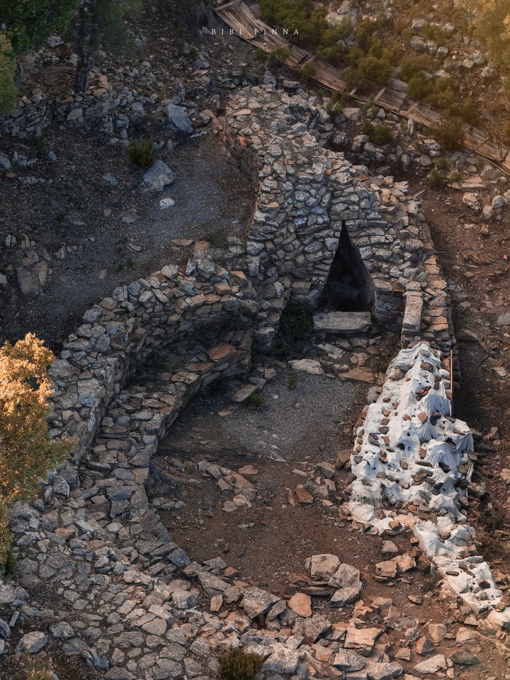 Il villaggio è costituito da tre pozzi sacri e una serie di capanne circolari. Il pozzo meglio conservato si trova nel settore settentrionale dell”area. Costruito con blocchi di scisto locale, si addossa a sud-ovest a una parete rocciosa naturale di modeste dimensioni. L”accesso al vano è decentrato rispetto all”asse della tholos. Quest”ultima è franata nella parte settentrionale. L”area antistante il vano d”ingresso al pozzo è delimitata da una serie di muri curvilinei a diverse quote.