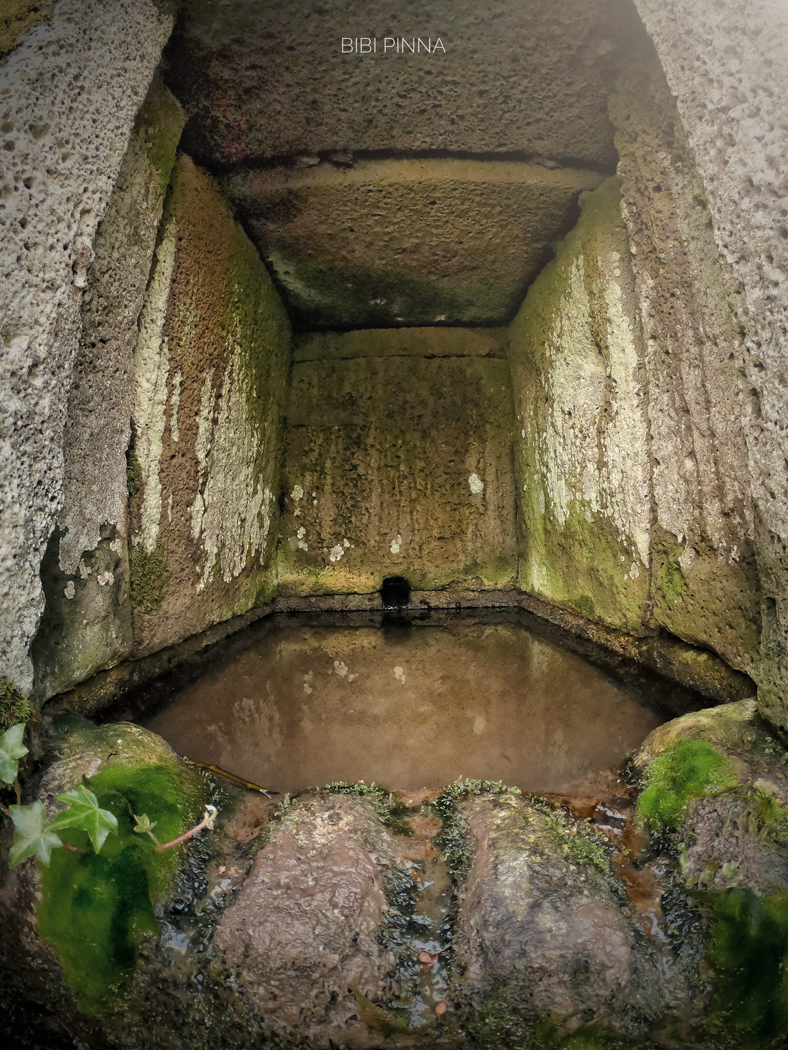 Ha una caratteristica mai descritta prima:è costruita a “tutto tondo”: l’acqua si raccoglie in un corpo retrostante absidato: ” Il corpo di fabbrica, realizzato in opera isodoma con l’impiego di conci in pietra basaltica e trachitica, si conserva per una cospicua porzione di base (Fig. 1), che ne restituisce l’impianto planimetrico oblungo, articolato in un avancorpo rettilineo d’ingresso e in un corpo retrostante absidato, contenente la cella di raccolta dell’acqua sorgiva.