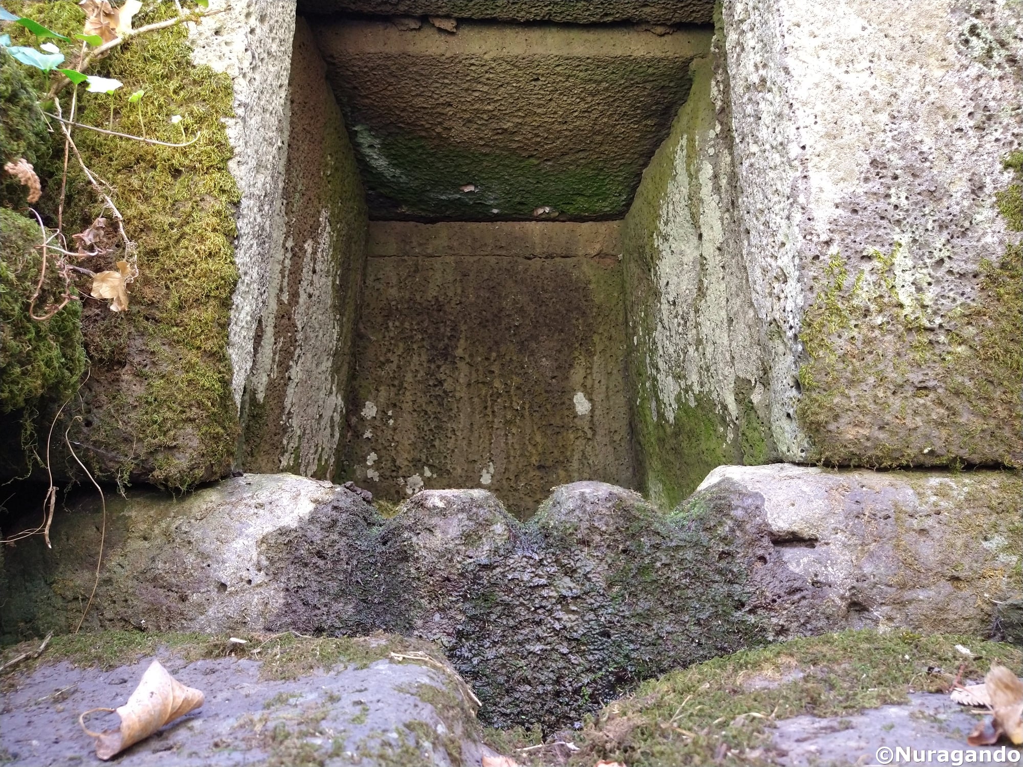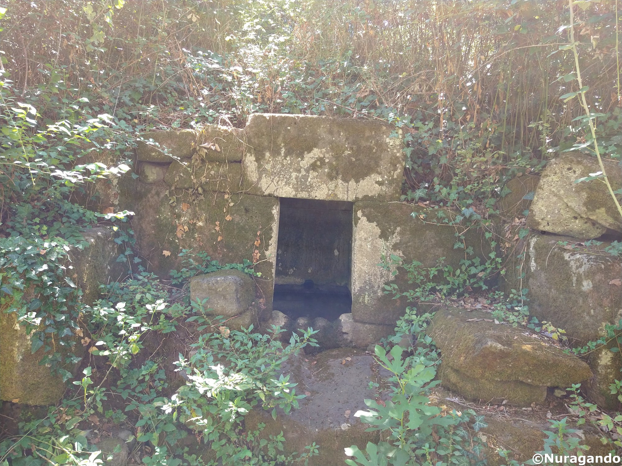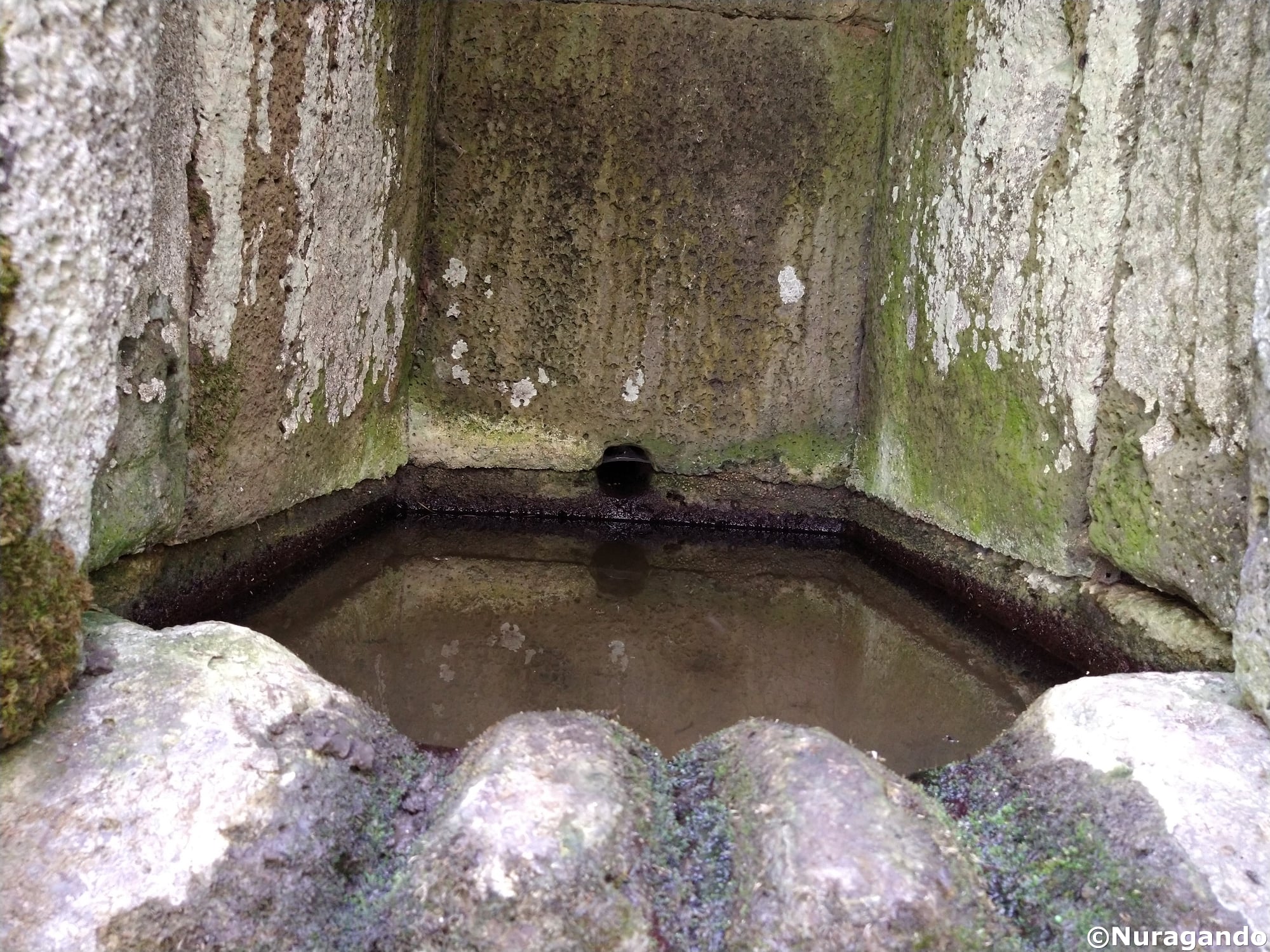 Ha una caratteristica mai descritta prima: è costruita a “TUTTO TONDO”: l’acqua si raccoglie in un corpo retrostante absidato: ” Il corpo di fabbrica, realizzato in opera isodoma con l’impiego di conci in pietra basaltica e trachitica, si conserva per una cospicua porzione di base che ne restituisce l’impianto planimetrico oblungo, articolato in un avancorpo rettilineo d’ingresso e in un corpo retrostante absidato, contenente la cella di raccolta dell’acqua sorgiva.