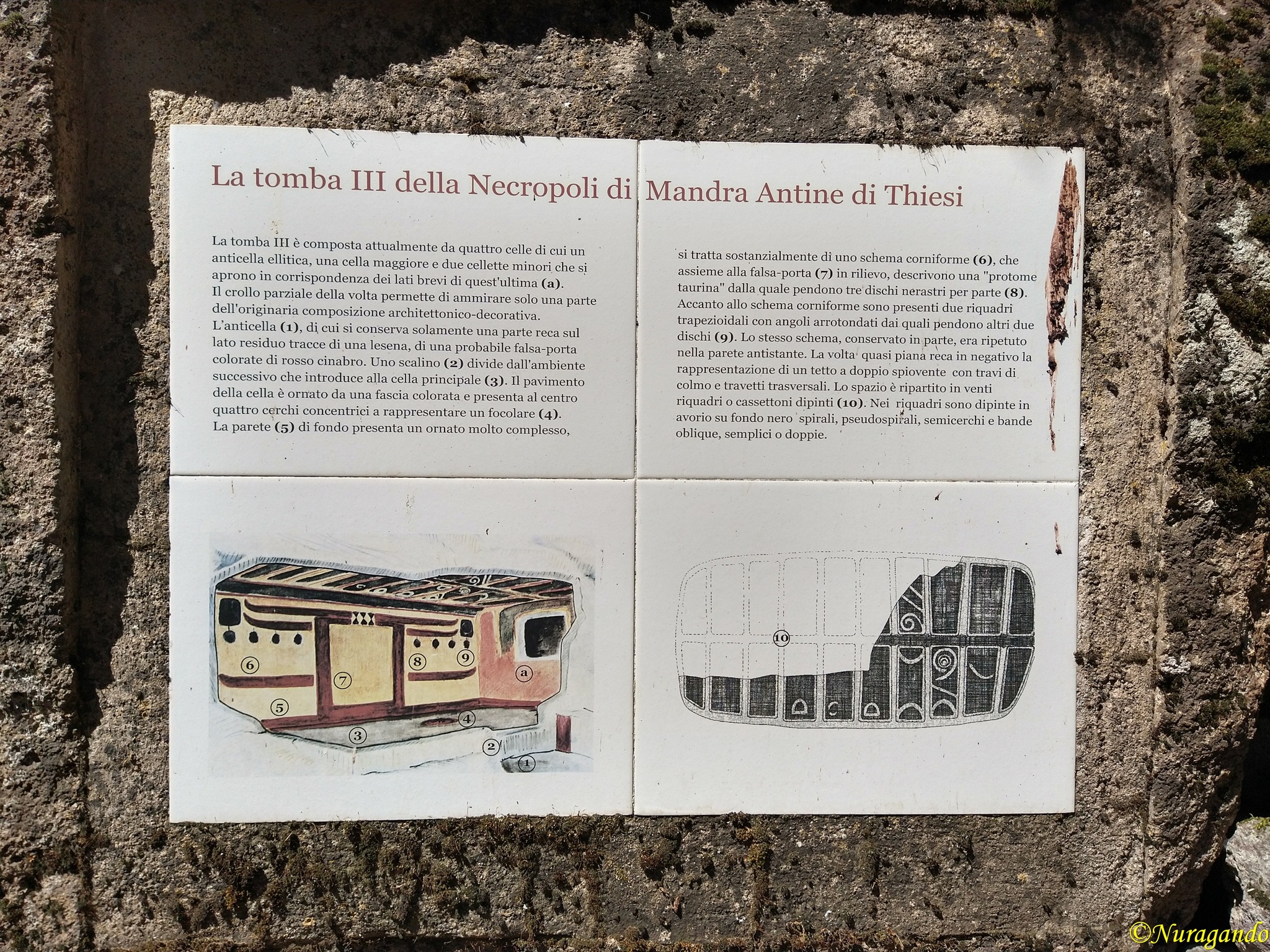 Il complesso è costituito da quattro domus de janas. Tra le sepolture spicca la tomba III o “tomba dipinta”, nota per la raffinatezza dei motivi simbolici e architettonici che decorano con effetto policromatico la cella maggiore. La domus è composta da quattro vani disposti a “T”: una piccola anticella ellittica (largh. m 1,00. prof. m 1,50) introduce nell’ampia camera rettangolare (largh. m 3,60. prof. m 1,60), sulle cui pareti laterali si aprono gli ingressi di due vani ellittici (largh. m 1,10. prof. m 1,66). Sul lato di fondo dell’ambiente maggiore è presente una complessa composizione a tutta parete, costituita da una falsa porta centralizzata, inquadrata da una fascia dipinta in rosso, sovrastata ed affiancata da cinque bande orizzontali dipinte. La banda superiore, a contatto col soffitto, è dipinta in color antracite. la seconda banda è di color rosso cinabro. Al di sotto, si dispongono, sopra e ai lati della falsa porta, tre bande con vertici ricurvi verso l’alto, dipinte in rosso.