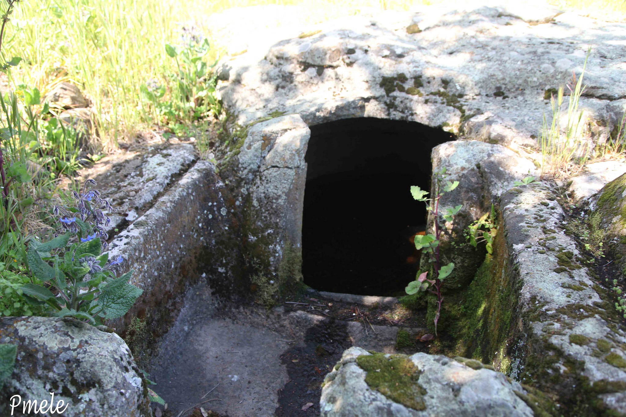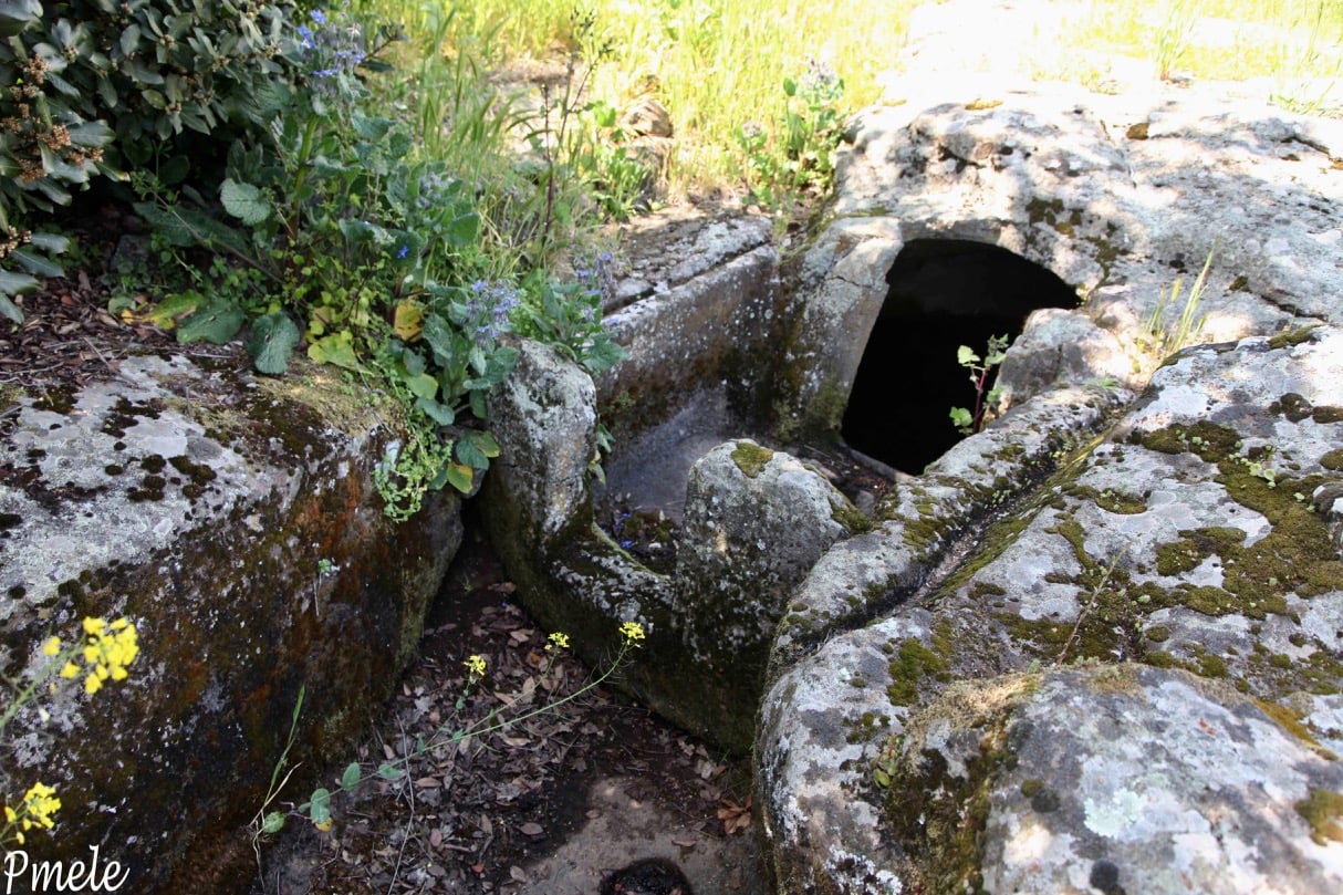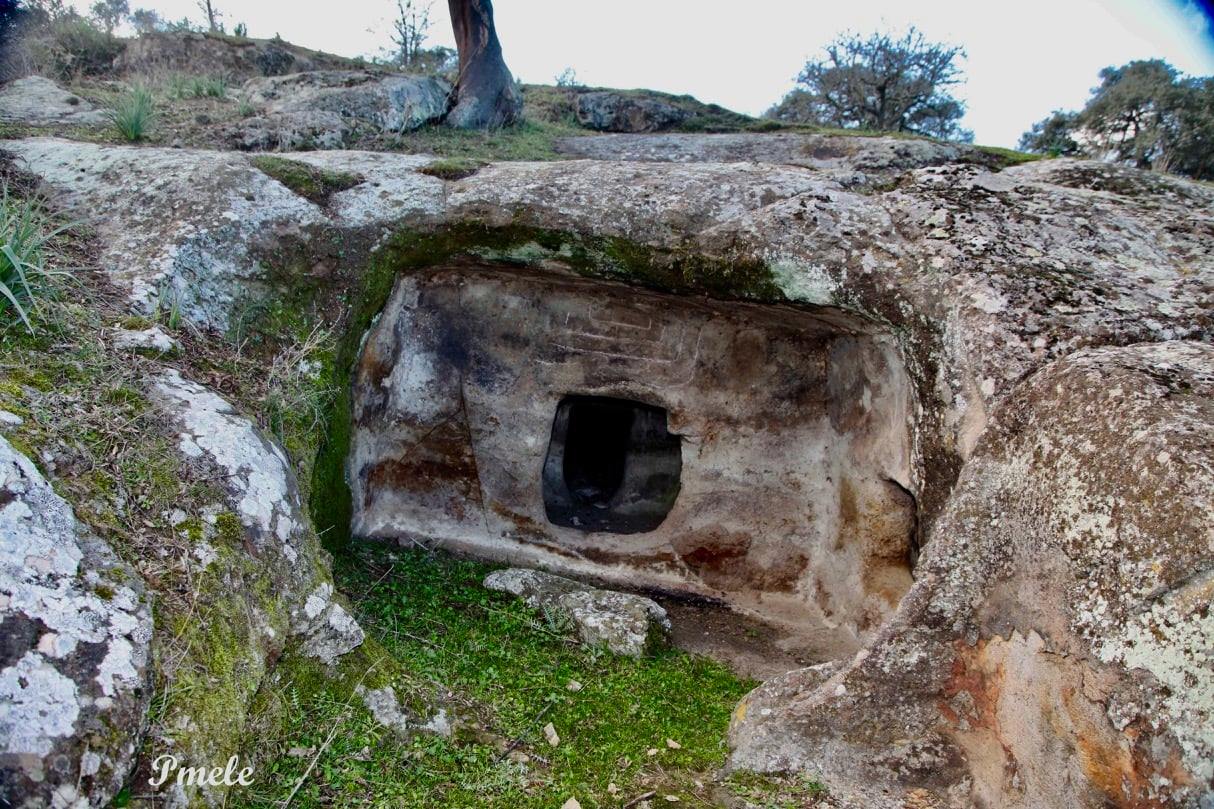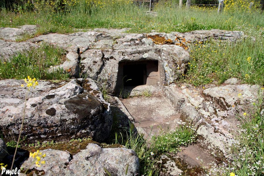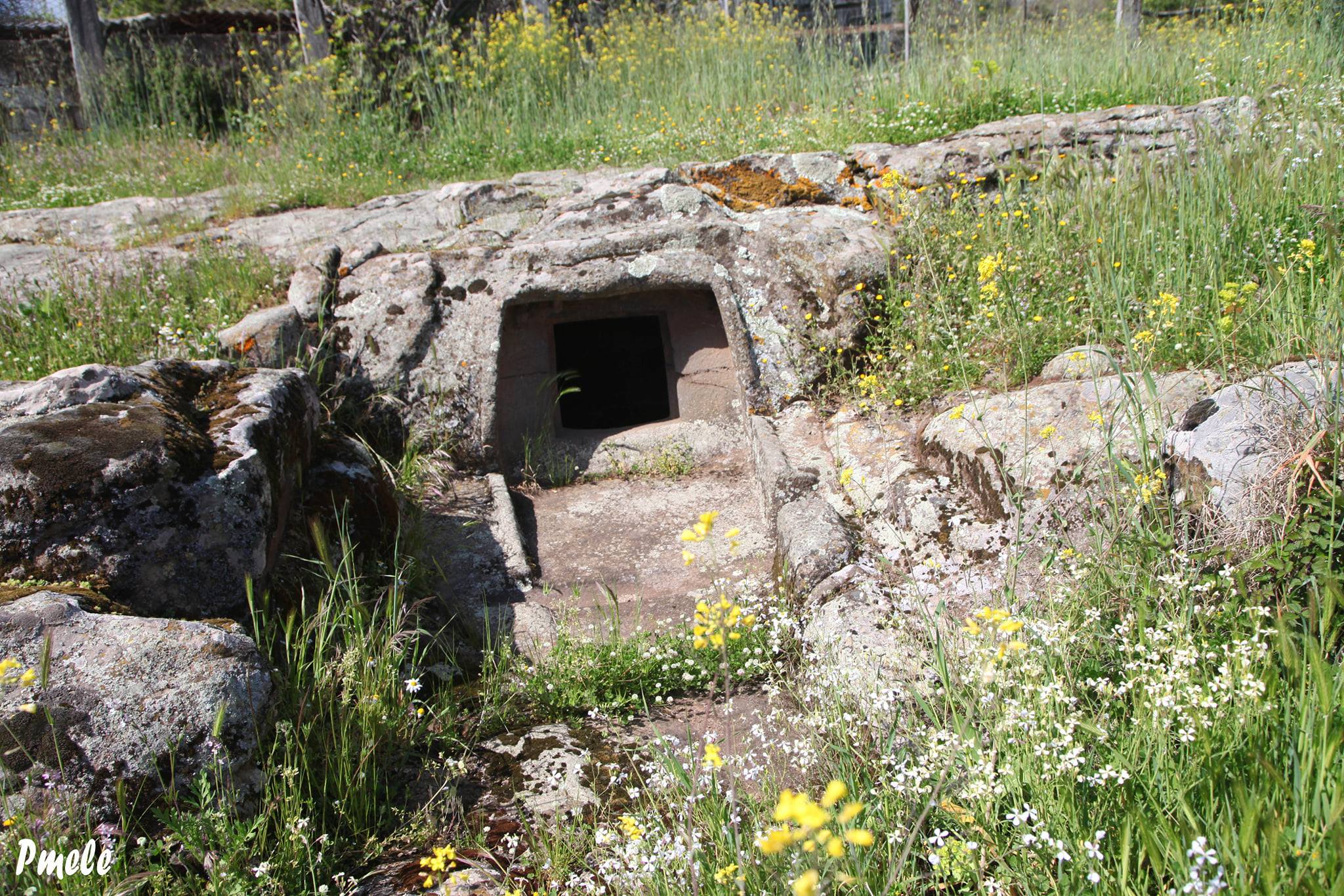 Gruppo di tre Domus de Janas di particolare suggestione. Con portello scolpito nella roccia basaltica ed esedra rettangolare sotto il livello del terreno