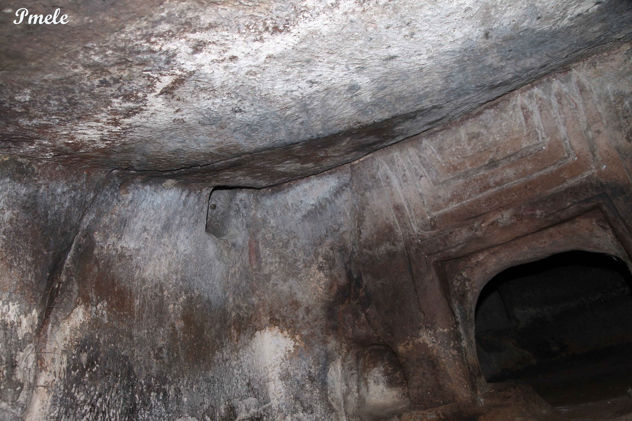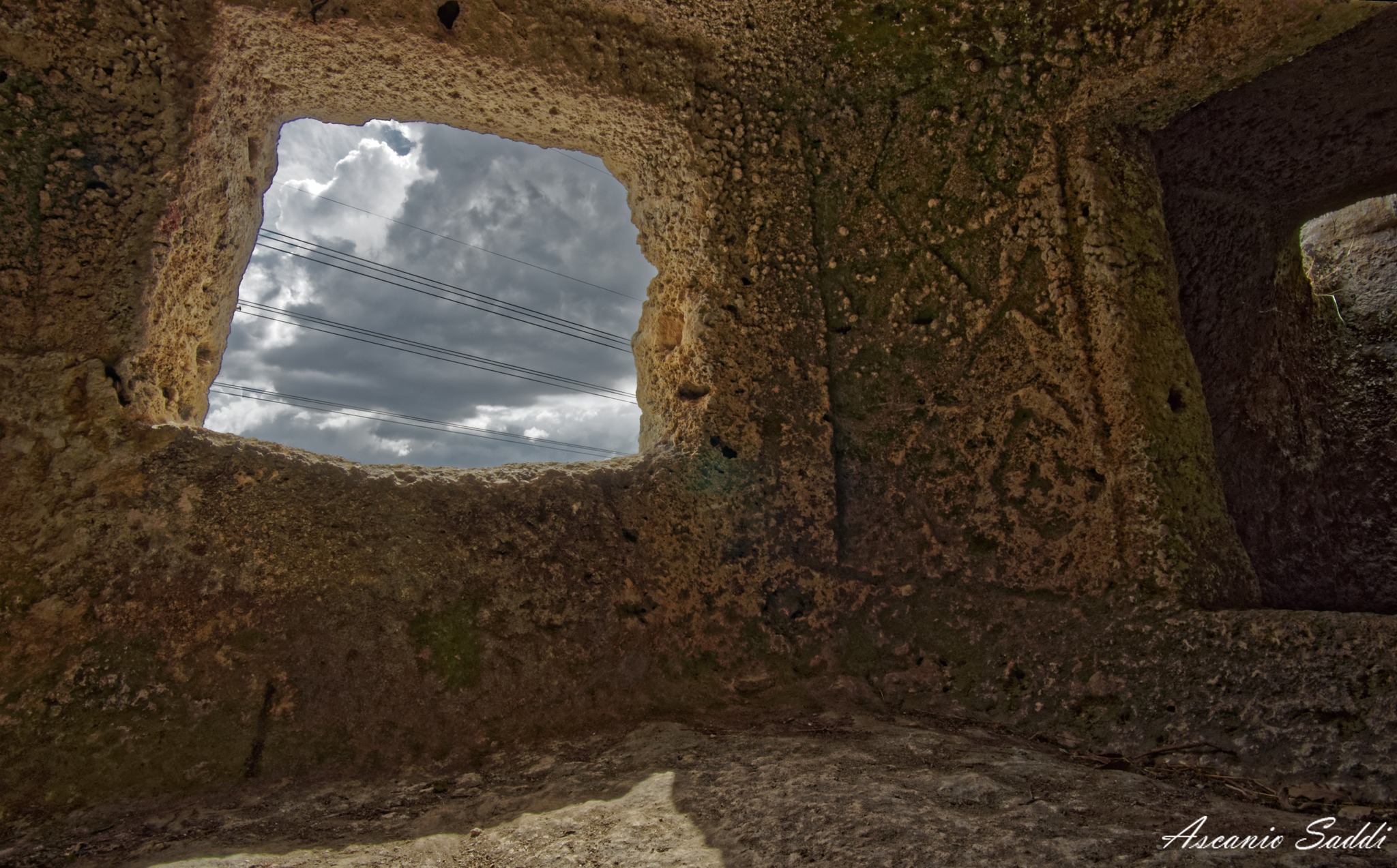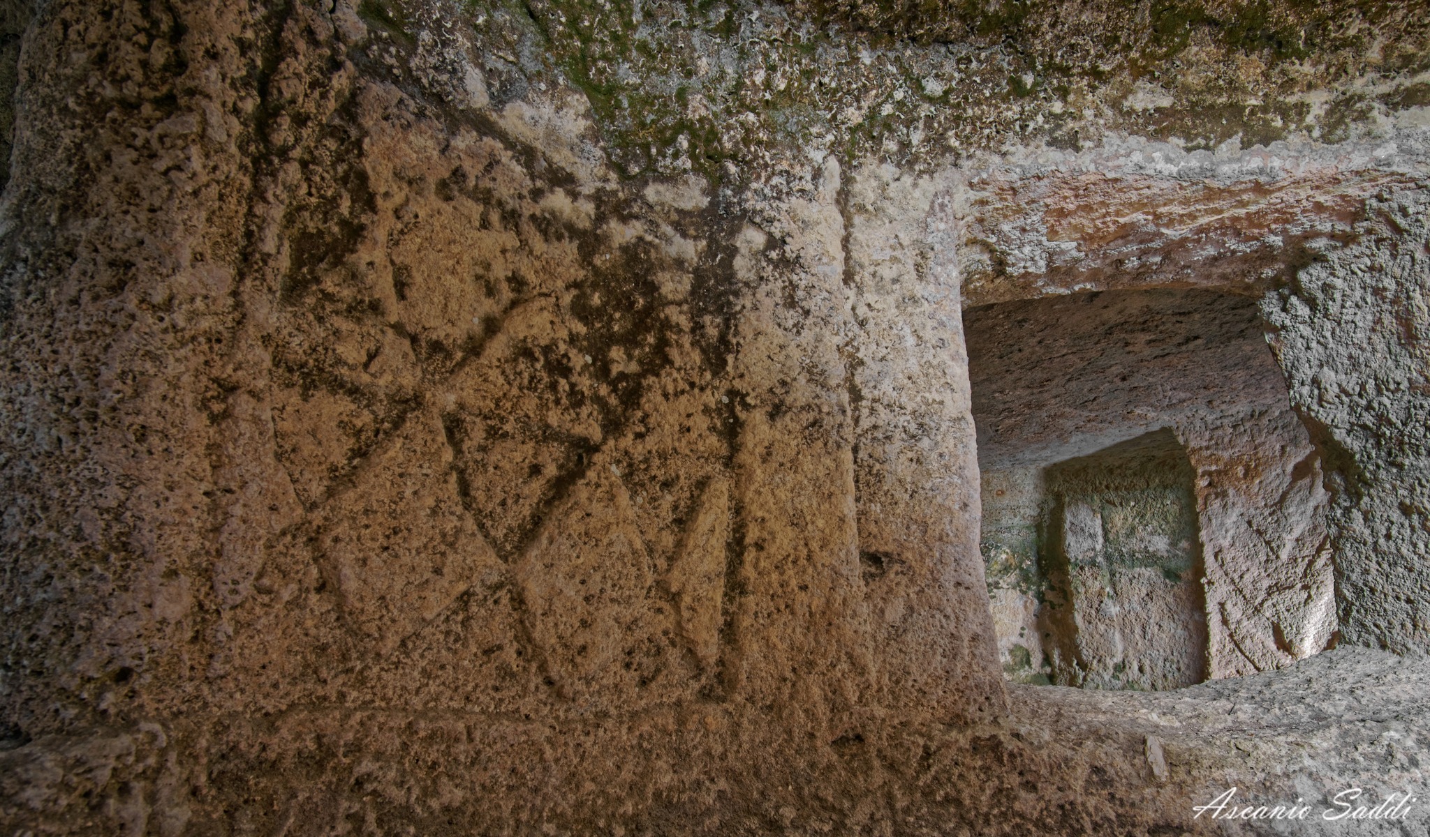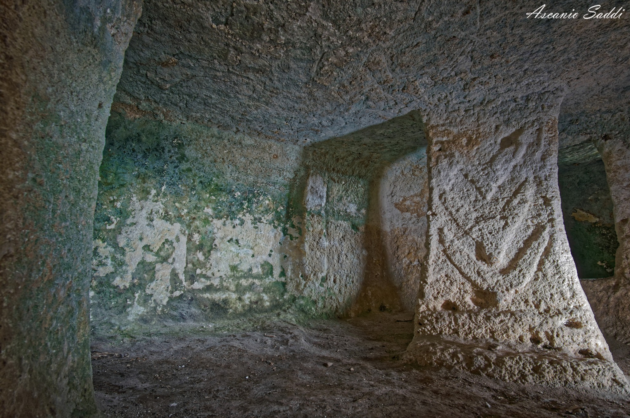 Gruppo di tre Domus de Janas di particolare suggestione. Con portello scolpito nella roccia basaltica ed esedra rettangolare sotto il livello del terreno