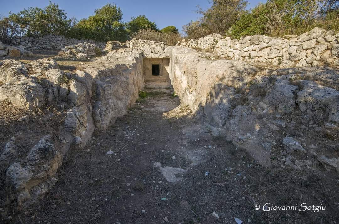 Area con piccolo nuraghe monotorre attorno è presente una piccola necropoli di quattro domus de janas, in cui sono presenti delle decorazioni a protome taurina scolpite