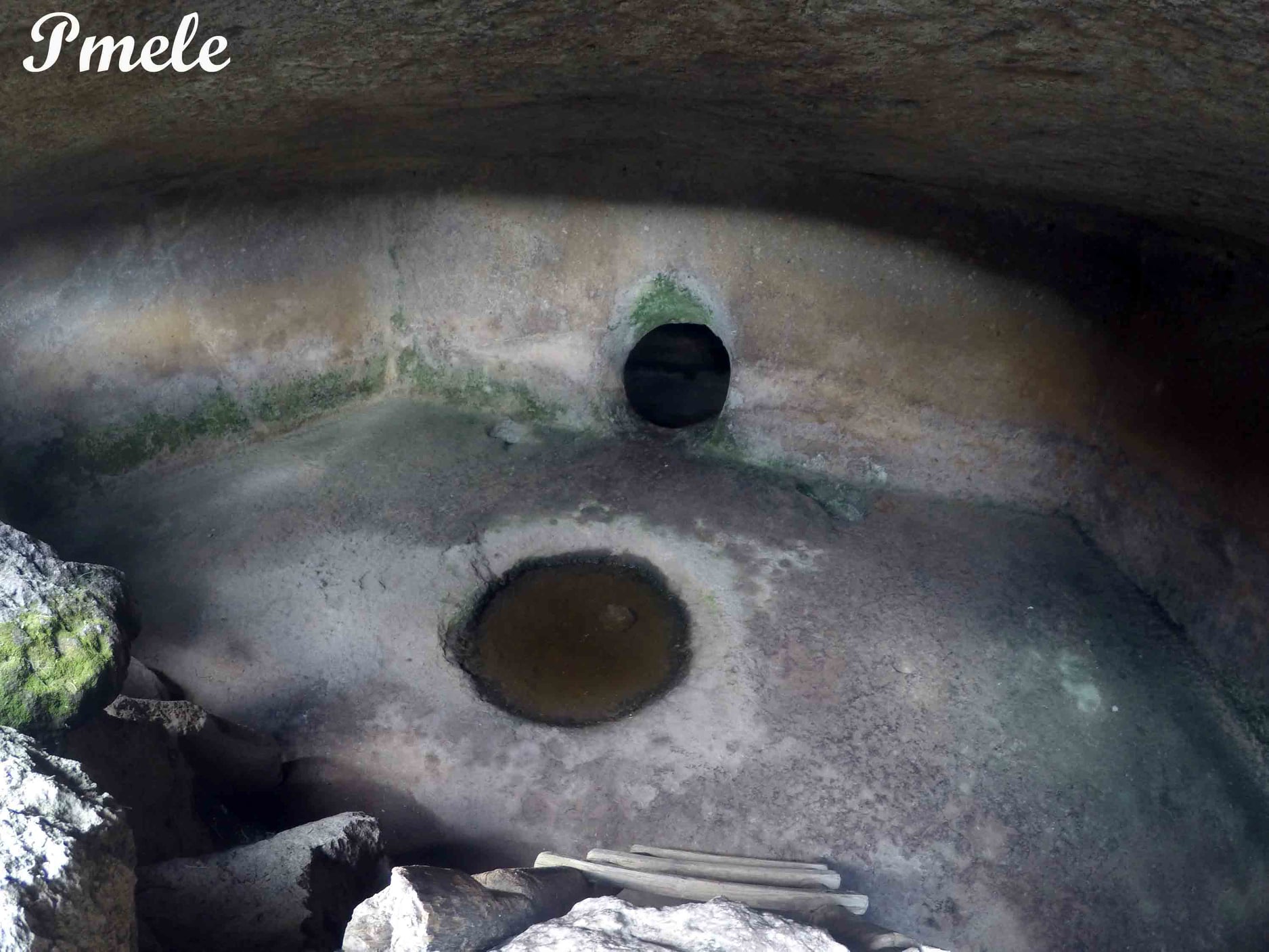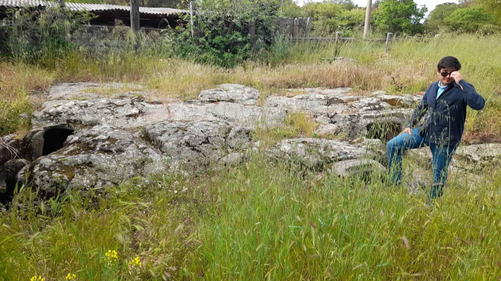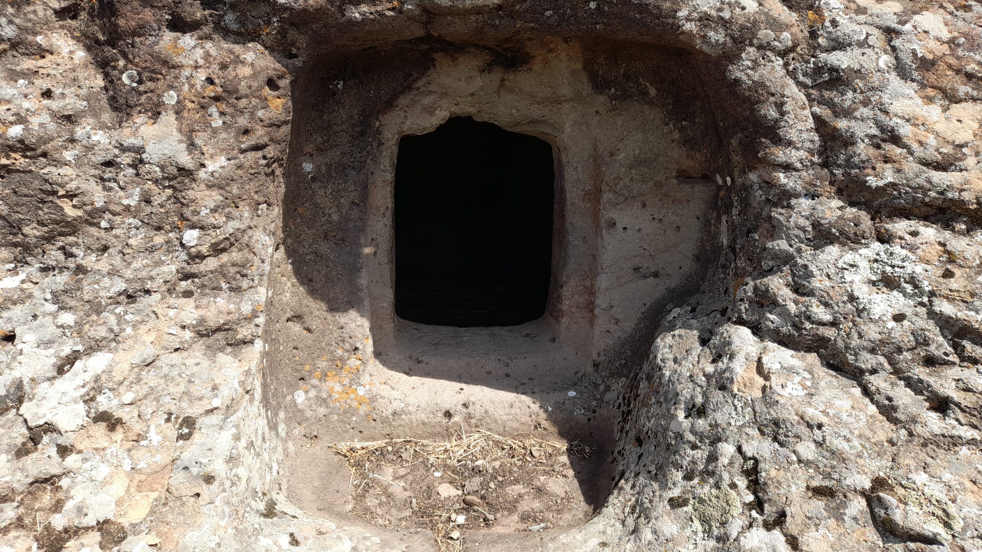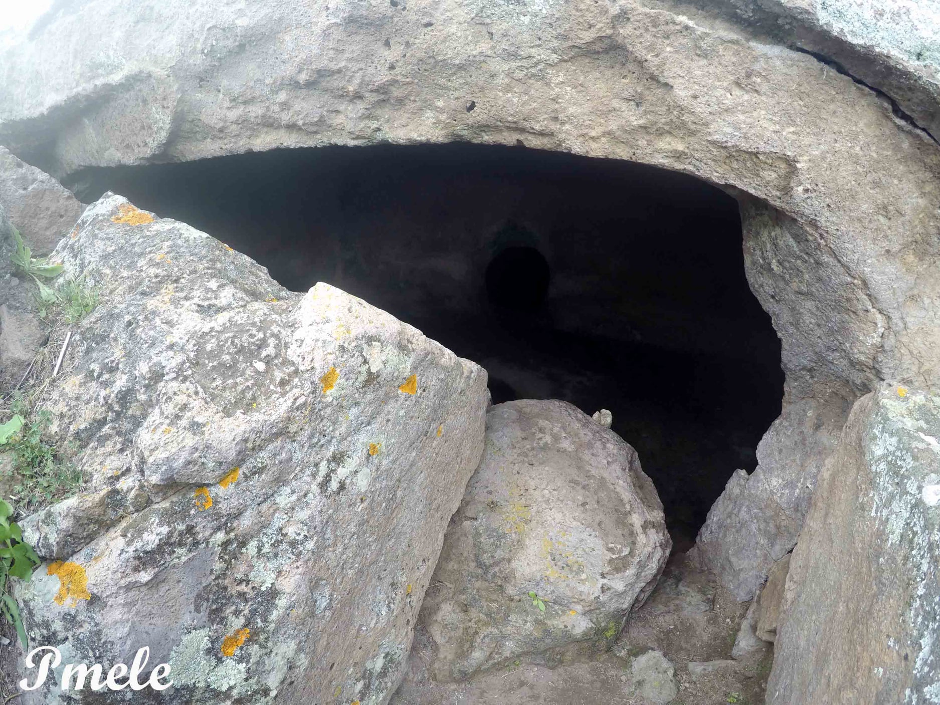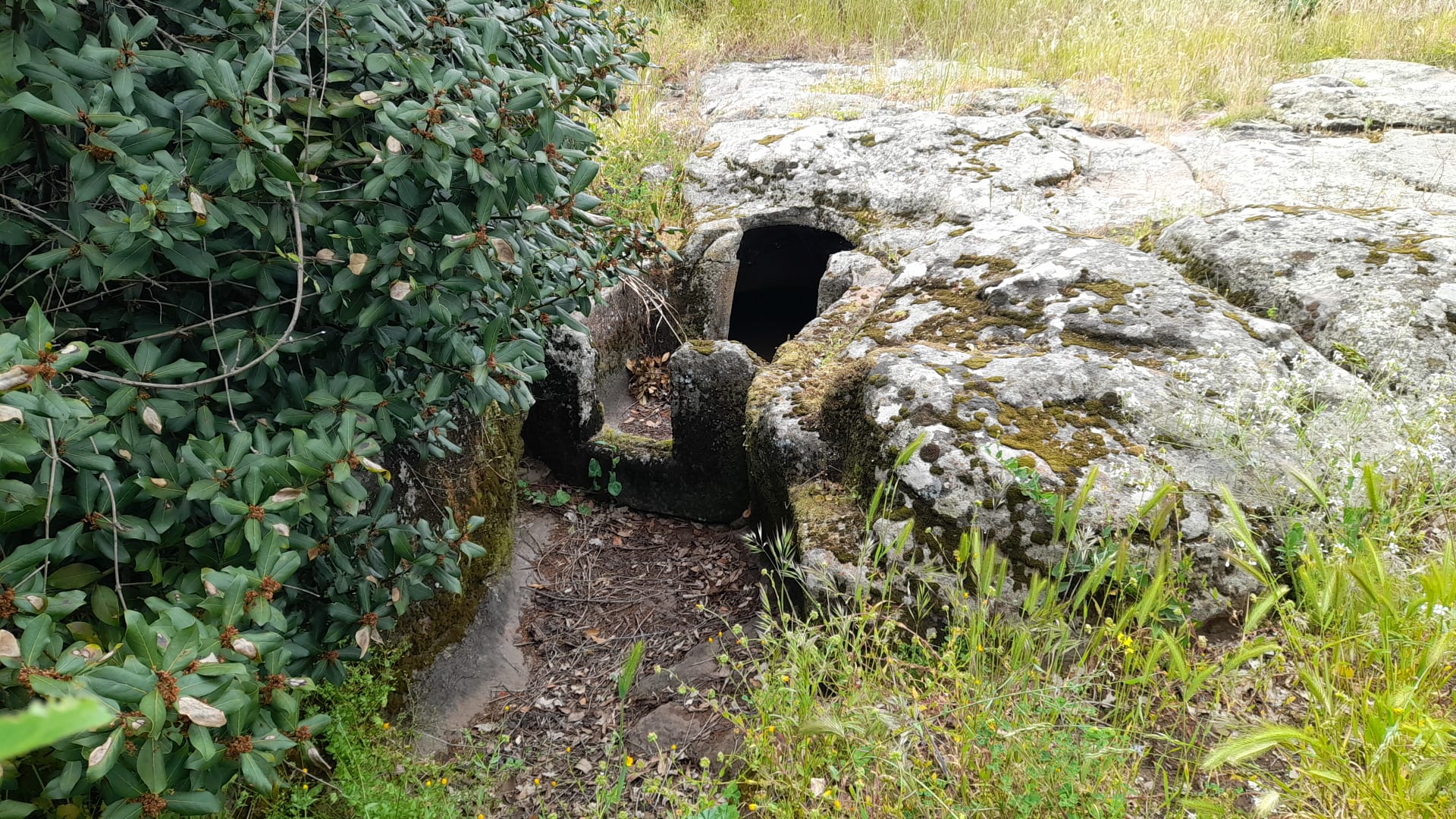 Gruppo di tre Domus de Janas di particolare suggestione. Con portello scolpito nella roccia basaltica ed esedra rettangolare sotto il livello del terreno