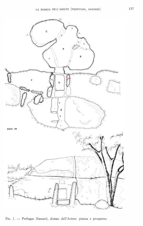 Questa domus de janas prende il nome dalla scultura in bassorilievo di una “presunta” protome d’ariete scolpita su una delle pareti interni. L’altra specificità consiste nel corridoio dolmenico presente davanti all’imboccatura.