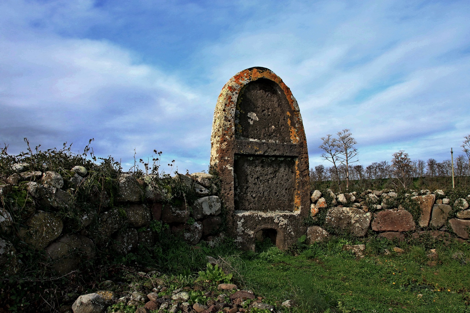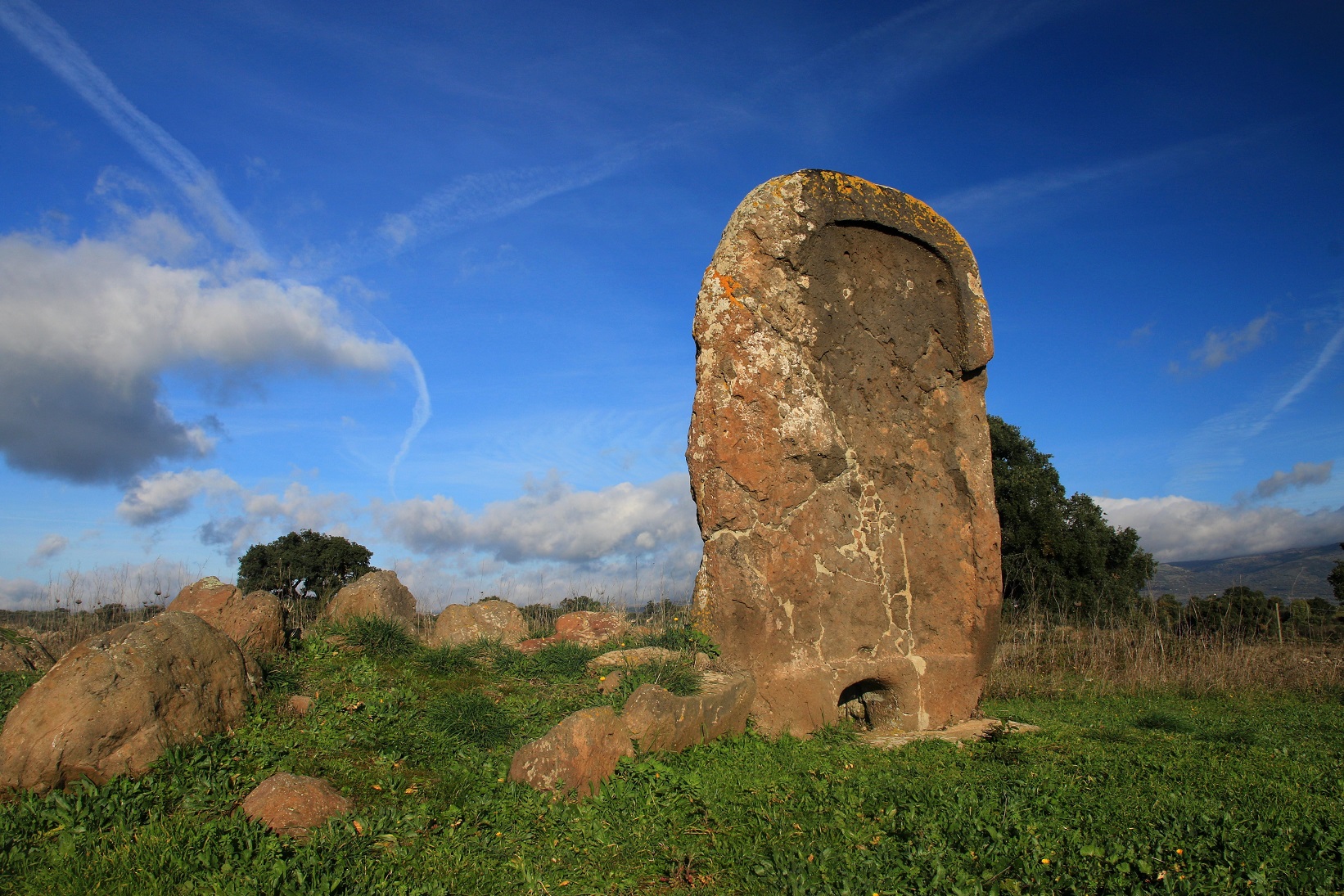 Illustrata dal Lamarmora e dal Mackenzie che l’avevano vista quasi intatta, almeno nel profilo di pianta e definita dal Pinza “il prospetto del più bel sepolcro di giganti che si conosce in Sardegna”, la tomba di giganti di Imbertighe è ormai ridotta alla sola stele centinata e alle ali dell’esedra costituite da tre file di pietre. (Sardegna Cultura)