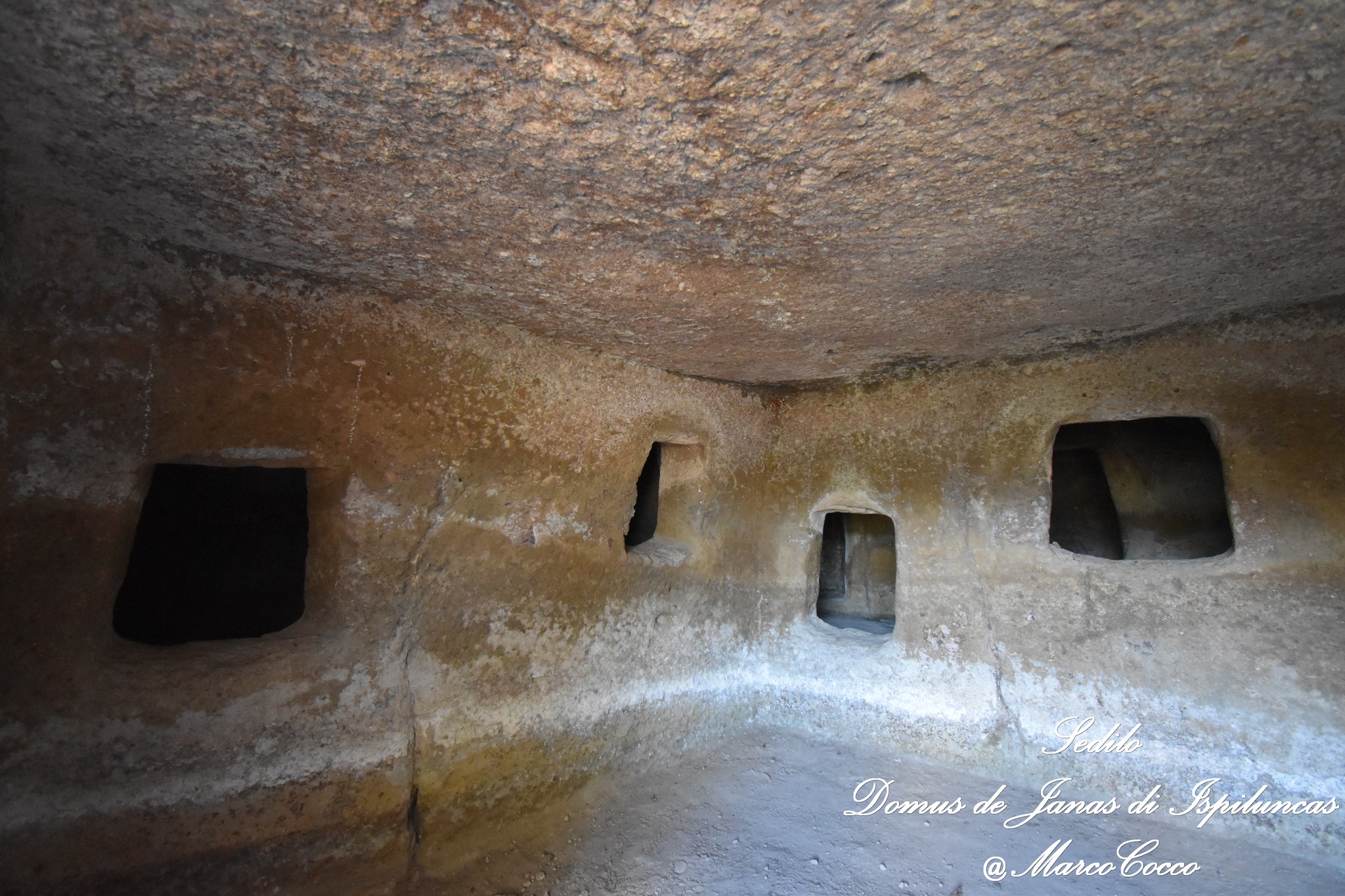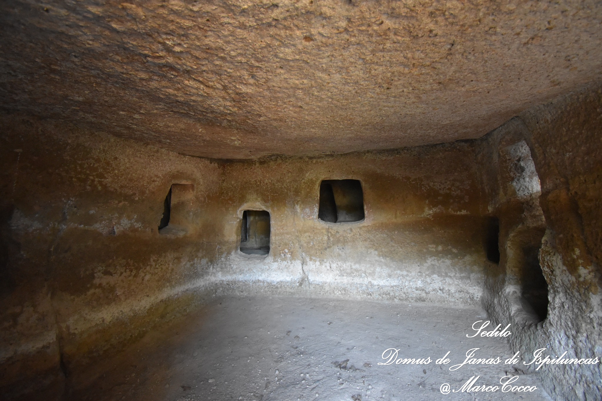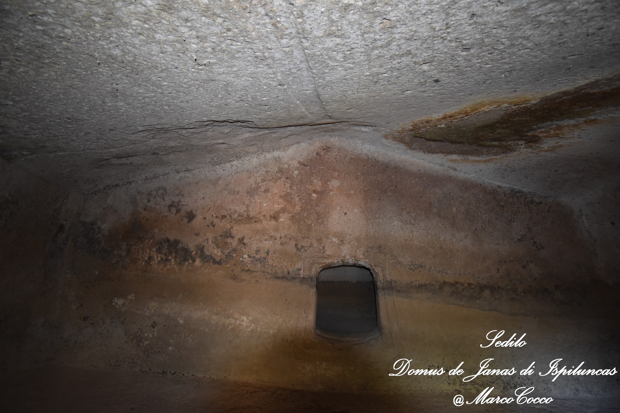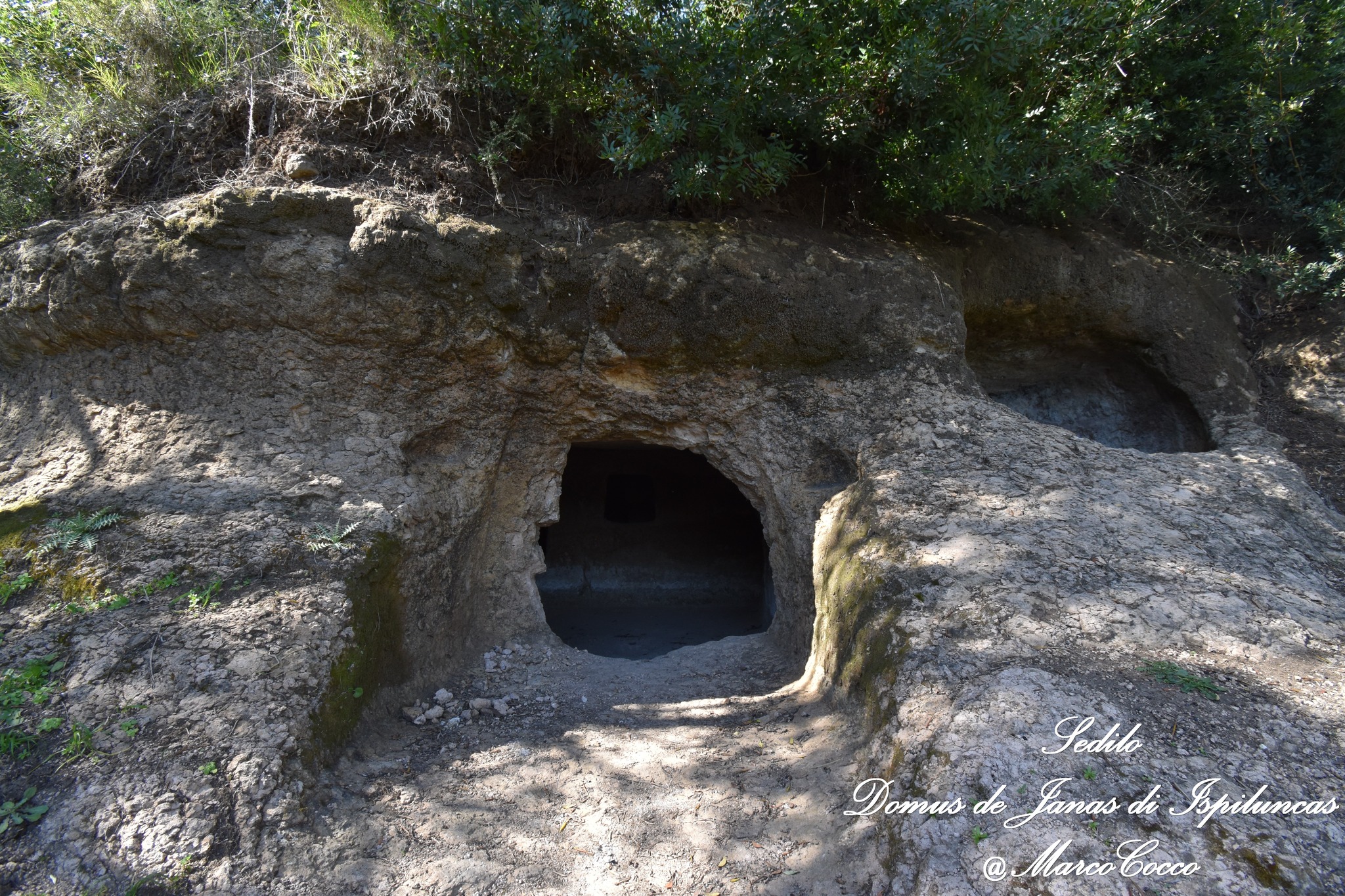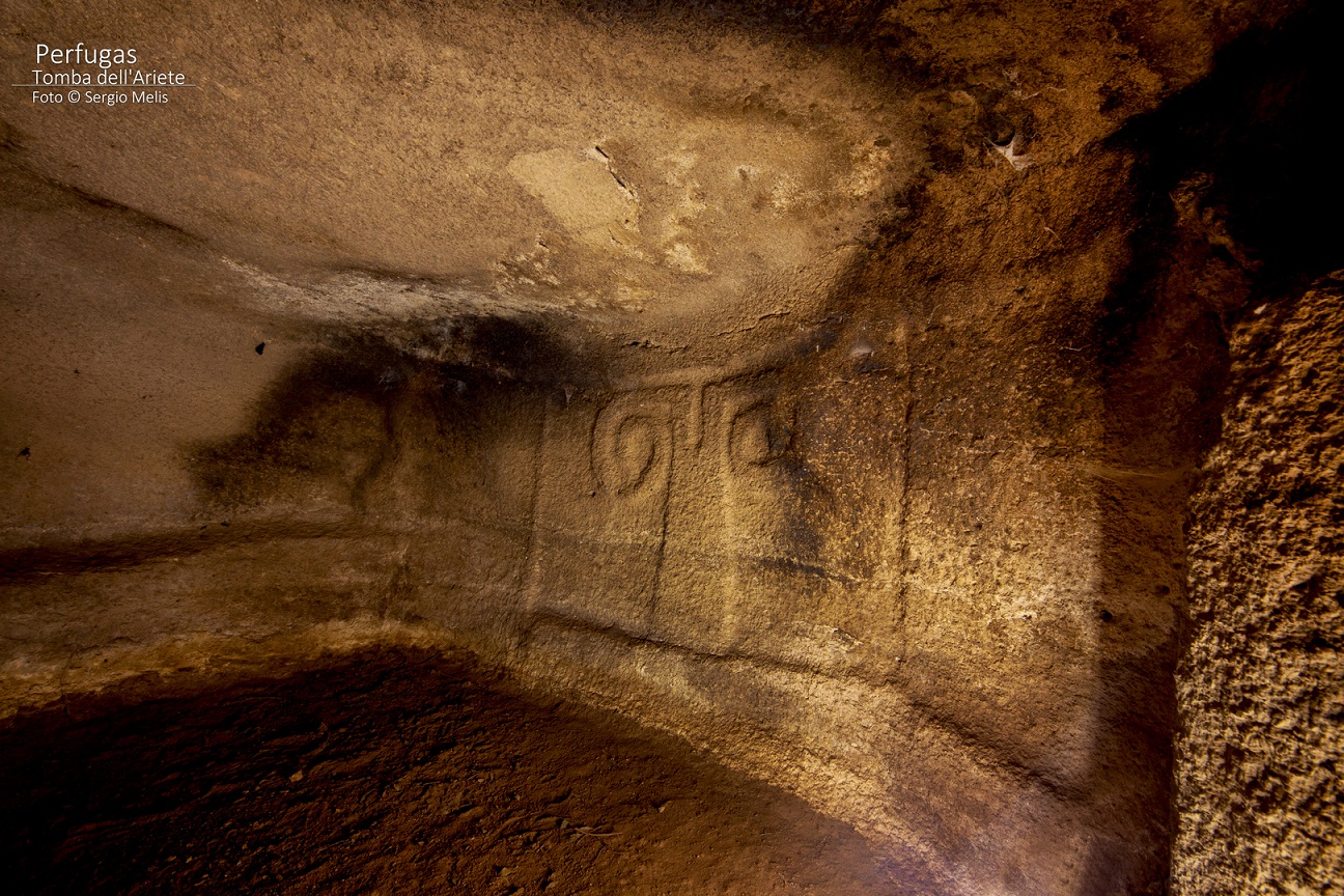 Questa domus de janas prende il nome dalla scultura in bassorilievo di una “presunta” protome d’ariete scolpita su una delle pareti interni. L’altra specificità consiste nel corridoio dolmenico presente davanti all’imboccatura.