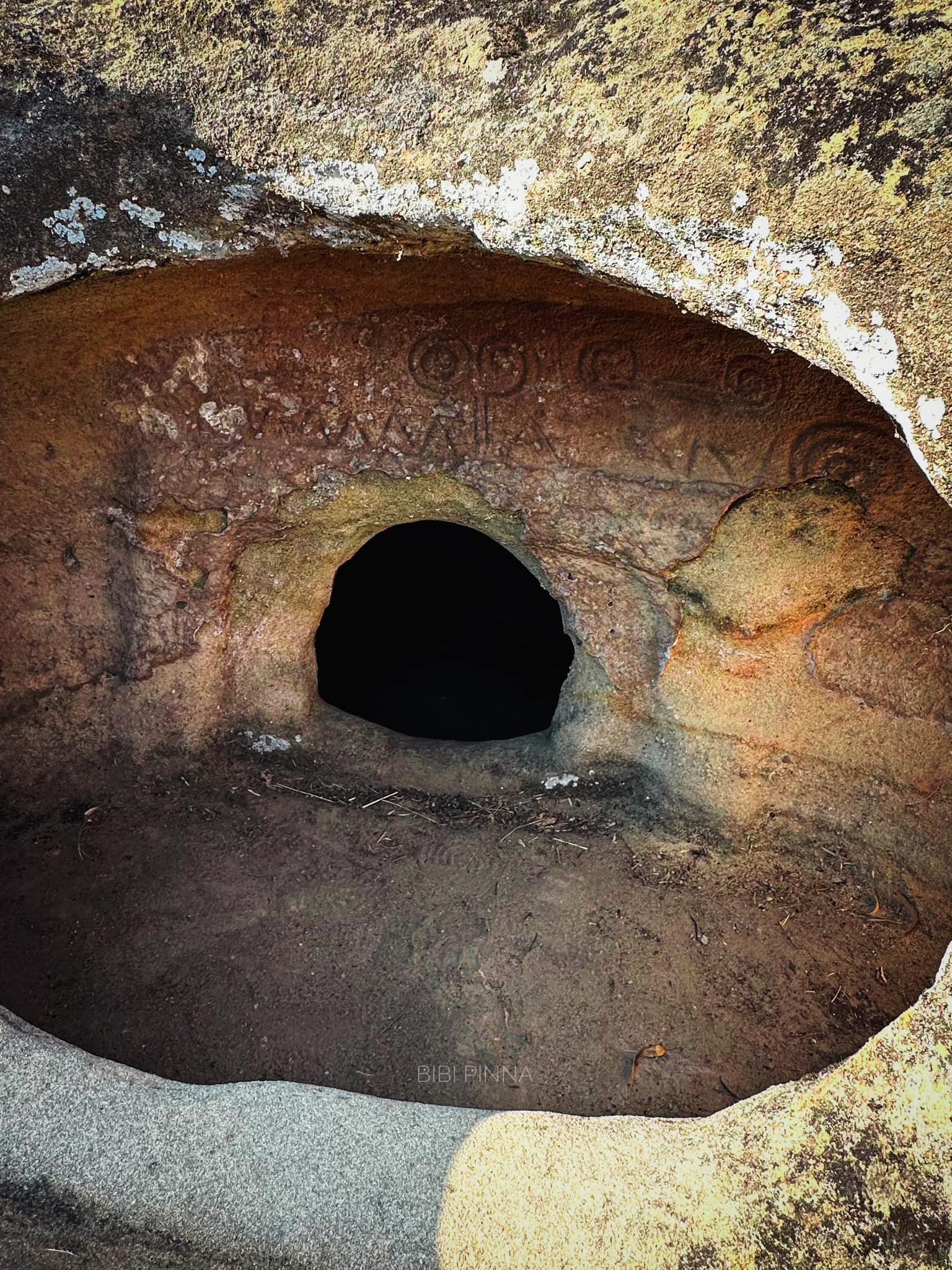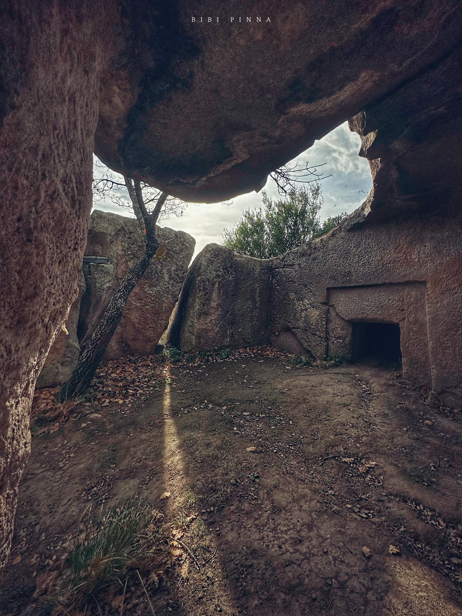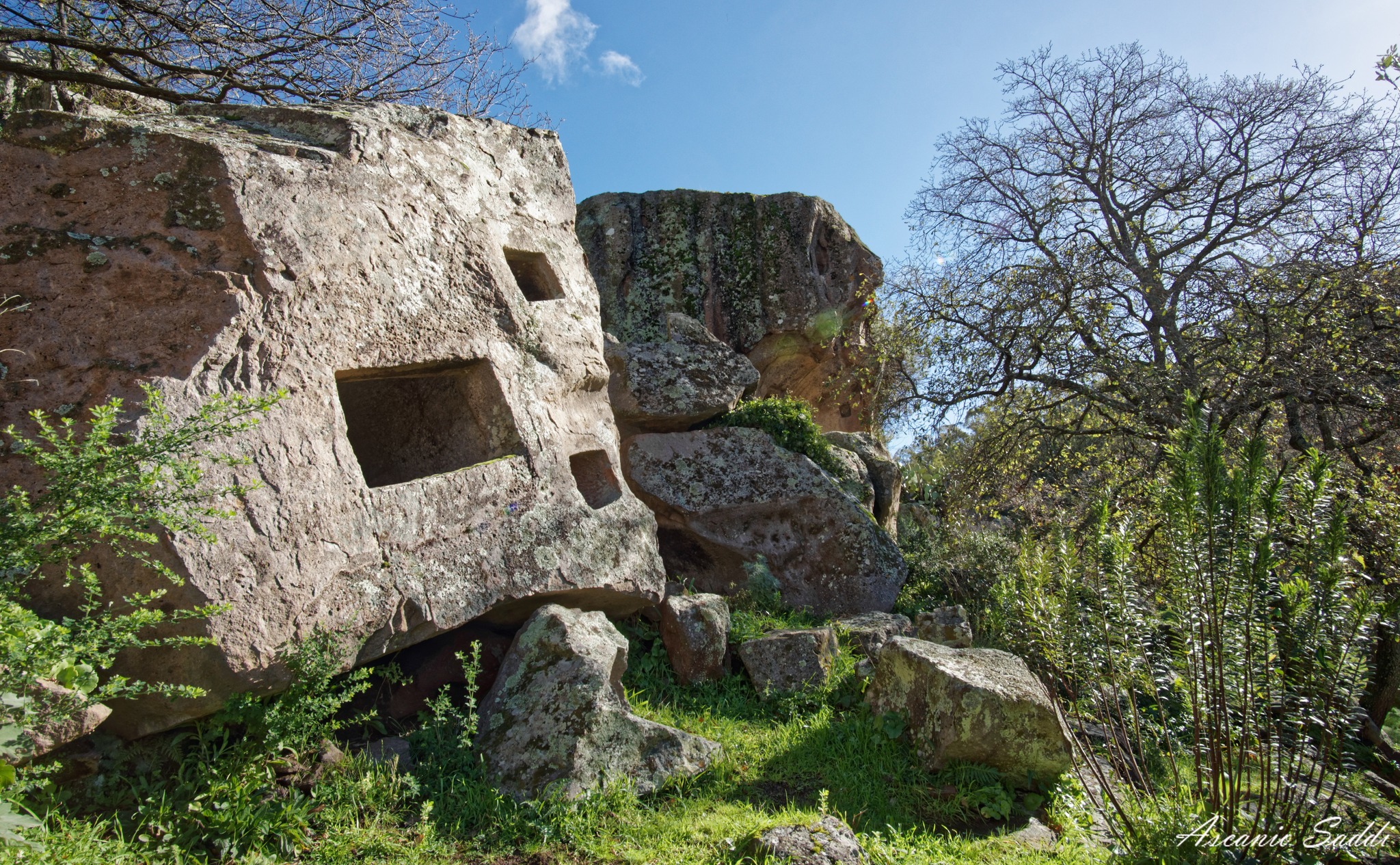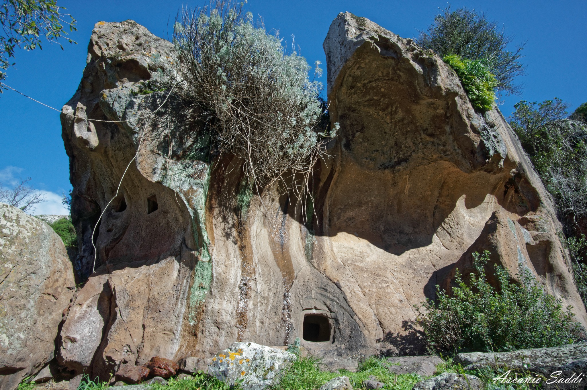 Questa domus de janas prende il nome dalla scultura in bassorilievo di una “presunta” protome d’ariete scolpita su una delle pareti interni. L’altra specificità consiste nel corridoio dolmenico presente davanti all’imboccatura.