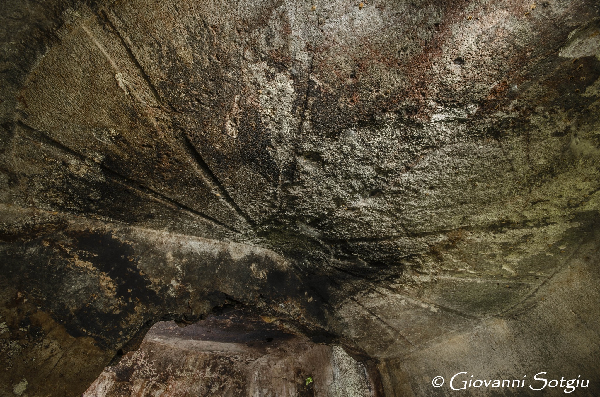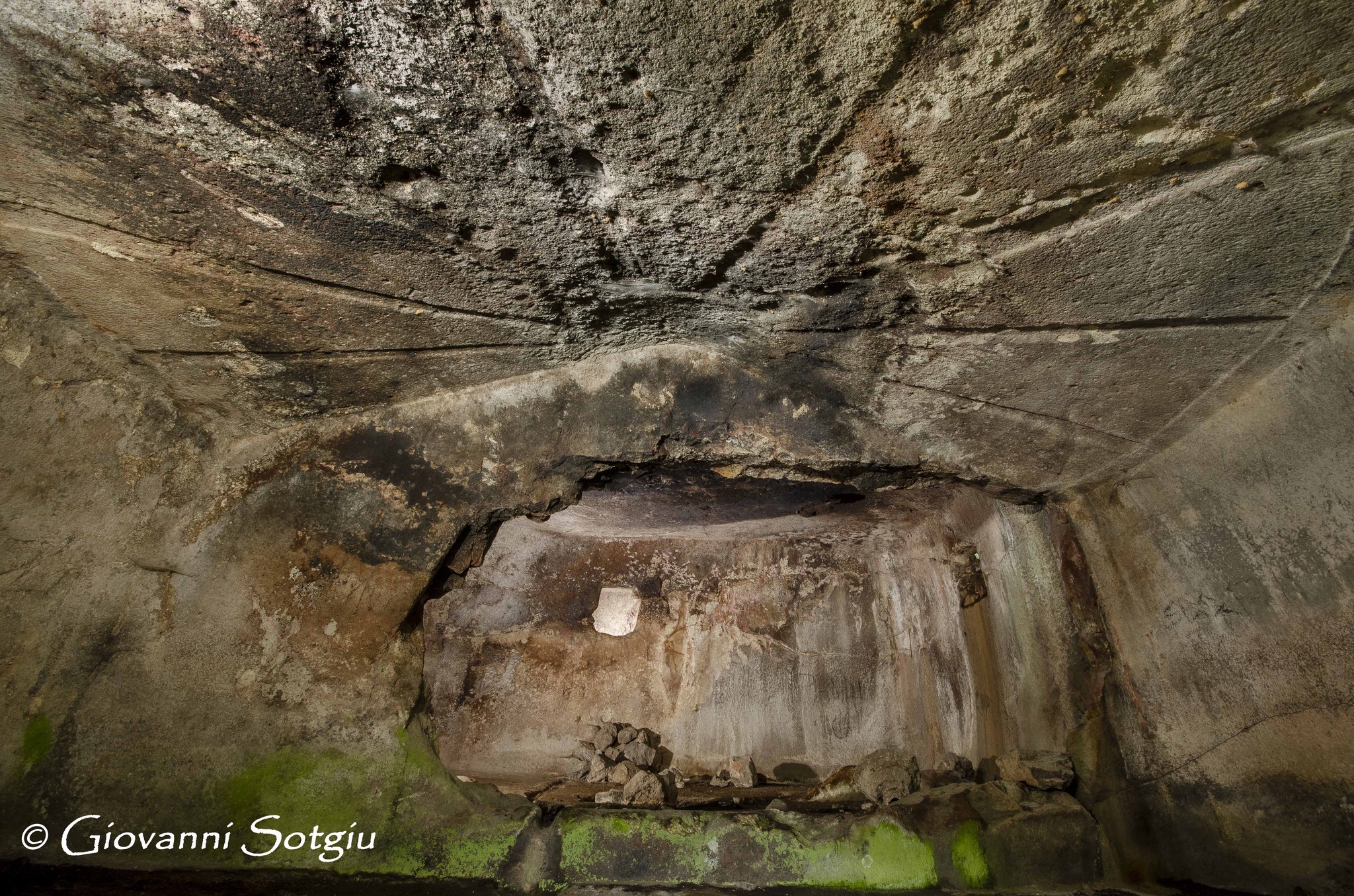 L’accesso è dato da un lungo dromos e da un atrio,purtroppo franato che porta in un grande vano semicircolare il cui soffitto è lavorato con fasce a rilievo ad imitazione dei tetti delle capanne neolitiche.