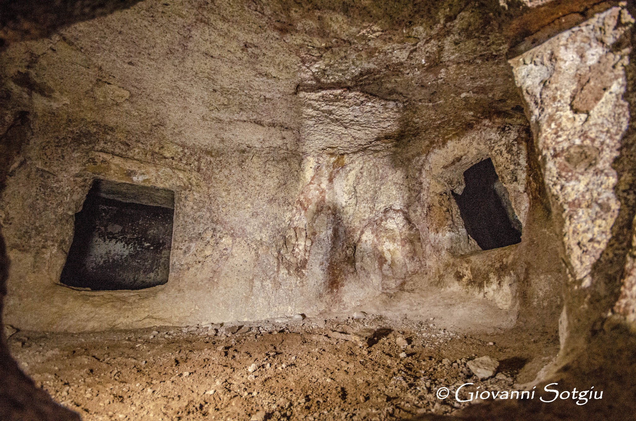 Dopo questo vano,si trova in asse un’altro vano rettangolare che in origine era separato da un muro purtroppo demolito, che presenta due grandi colonne,demolite anch’esse, da cui si accede ad una finestrella piu piccola,in alto sul lato sinistro ad altri ambienti più piccoli, per la deposizione dei defunti e che non ho potuto esplorare.
