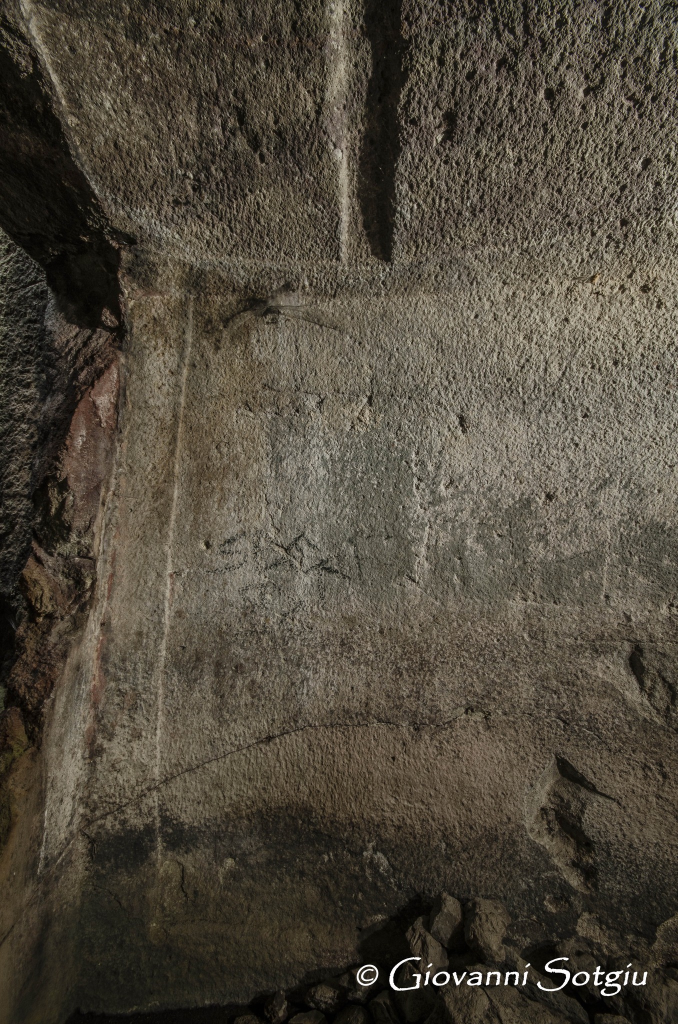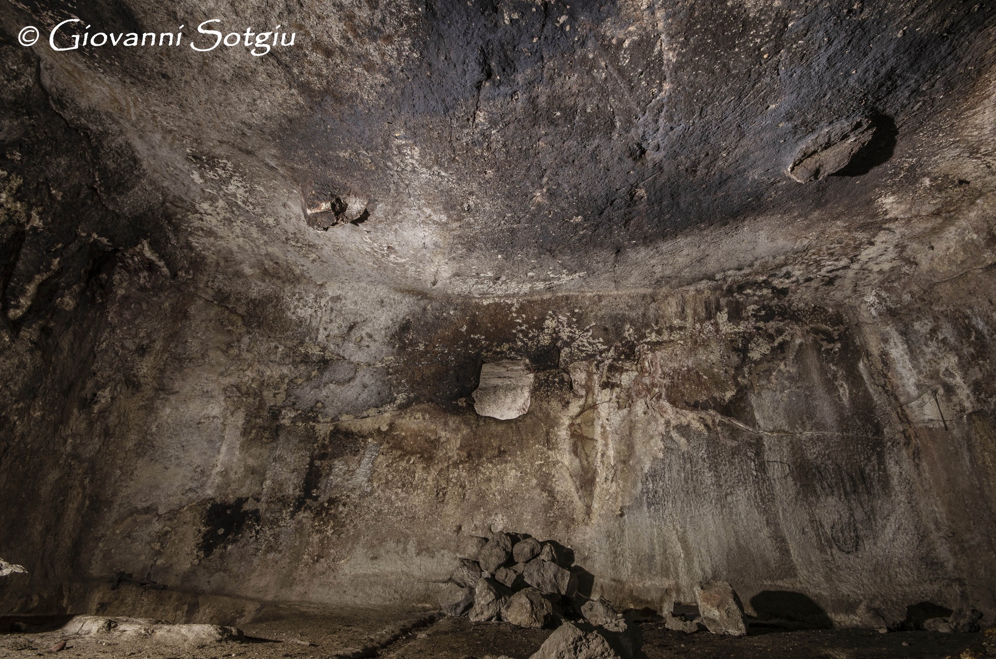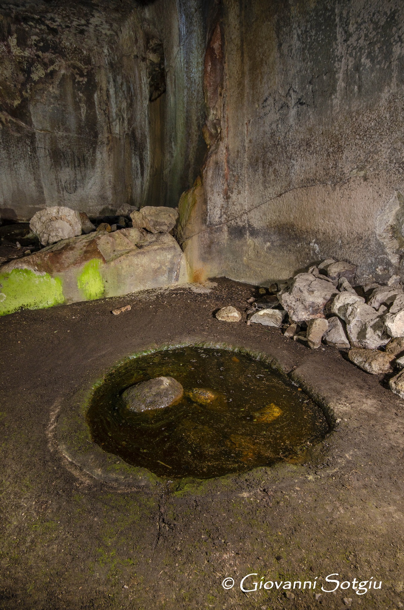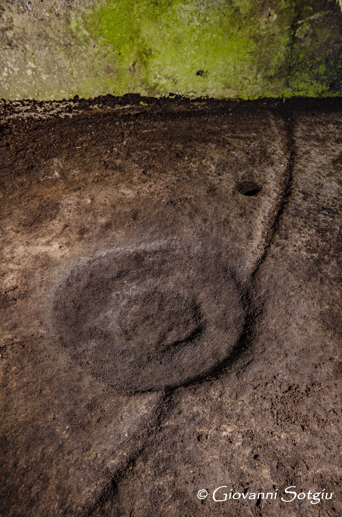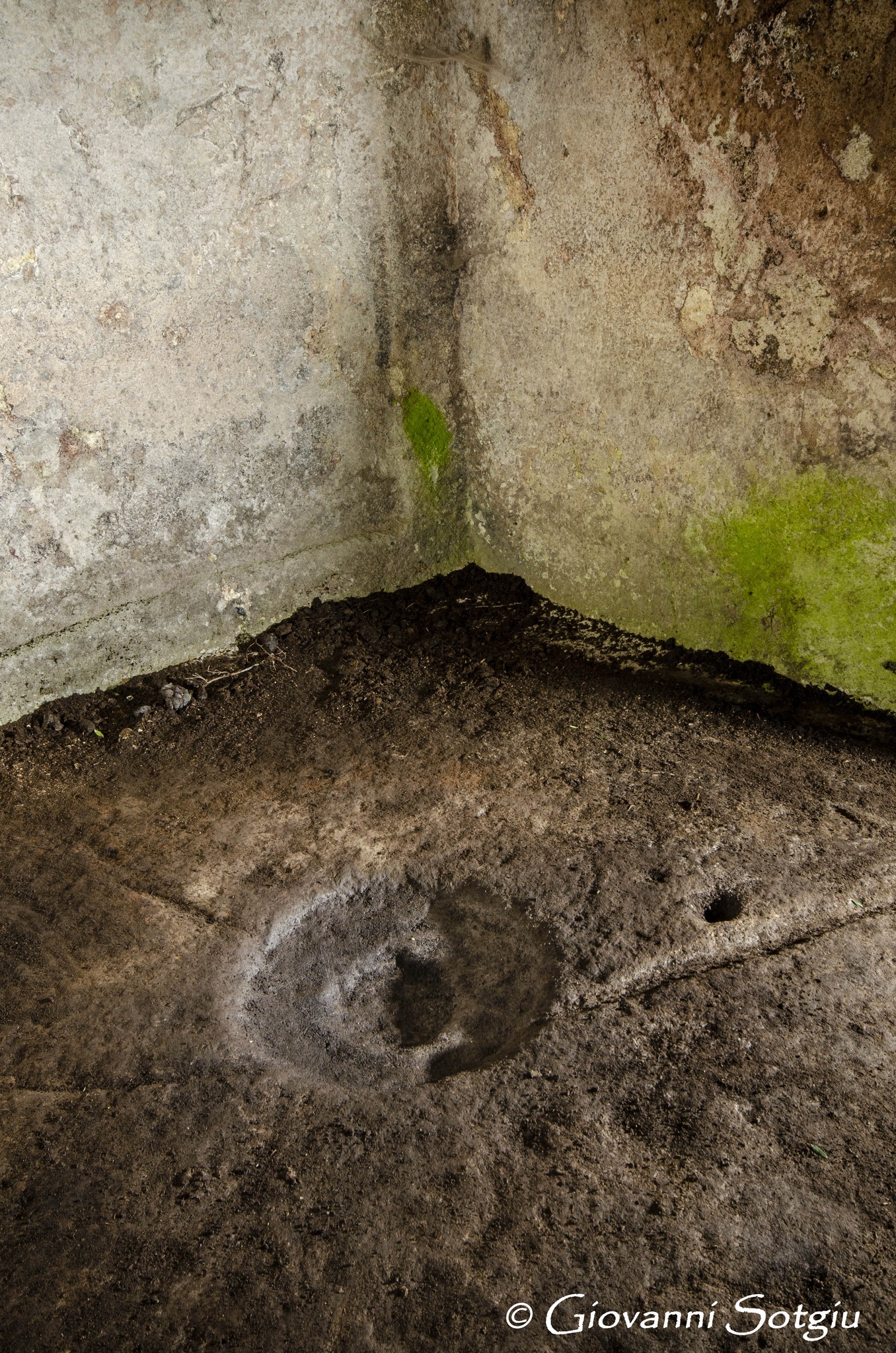 Anche il pavimento si conserva nel piano originale presentando una particolarità forse unica tra le domus de janas conosciute fino ad ora. Oltre a tante canalette che lo solcano, nello spigolo destra dell’ingresso,addossato a cio che resta della parete divisoria, si osservano i resti di un focolare manomesso, che conserva comunque il bordo in rilievo,simile al folcolare della sepoltura di Sa Lophasa ad Orgosolo. Dalla parte opposta perfettamente in asse con il primo si osserva un secondo splendido e intatto focolare a cerchi concentrici,collegato ad alcune canalette e con una piccola e bella coppella vicino. (Giovanni Sotgiu)