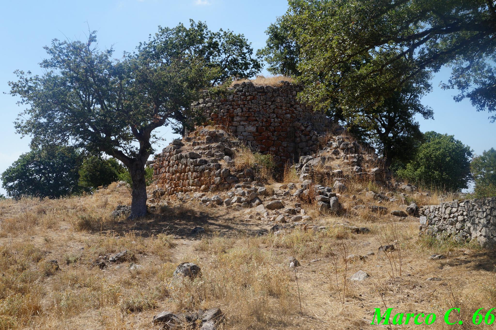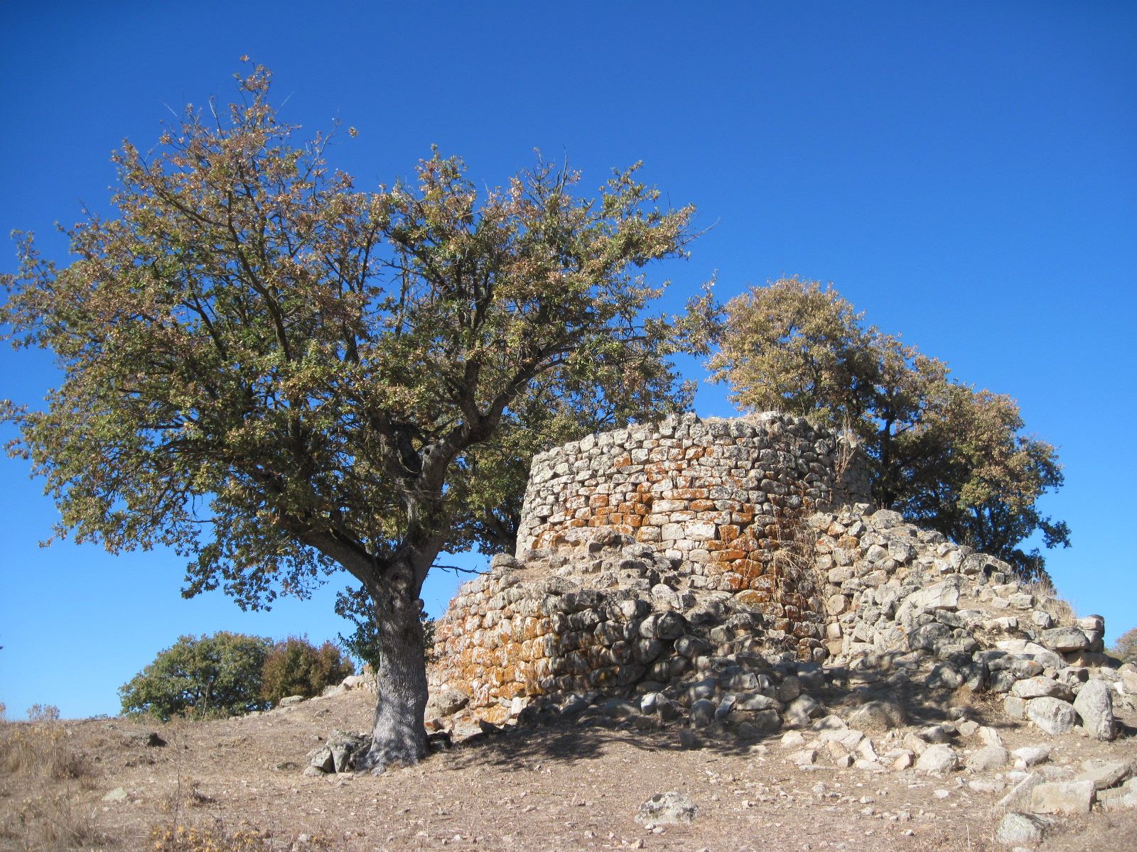 Si presenta con capanne rituali circolari, dove sono evidenziati, lungo tutta la circonferenza interna, dei sedili. Numerosissimi conci parallelepipedi di basalto e tufo trachitico a T popolano l’intero sito; essi sono perfettamente lavorati e rifiniti. In un flashback improvviso ciò mi riporta ad altri santuari sardi, come, per esempio, Gremanu (a Fonni), Serra Niedda (a Sorso) e Santa Vittoria (a Serri); appare chiaro, per l’appunto, che il tipo di pietra usata (basalto e tufo trachitico) e la foggia dei conci risulti simile in tutti i santuari nuragici sparsi nell’intera isola. Questo di Nughedu San Nicolò rimane, però, unico nel suo genere, grazie alla testimonianza scultorea giunta sino a noi dalla notte dei tempi e custodita nel locale museo. Trattasi di una elegantissima e raffinata testa bovina in trachite “nera” che, ancora una volta, ci testimonia non solo l’abile maestria degli scalpellini del passato, ma anche la devozione di questo nostro popolo al dio Toro