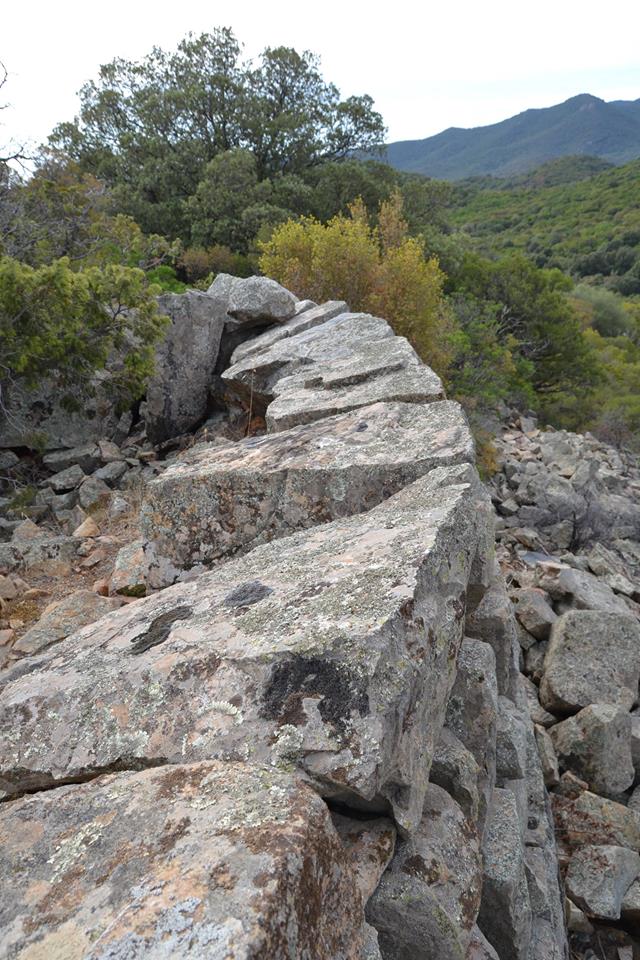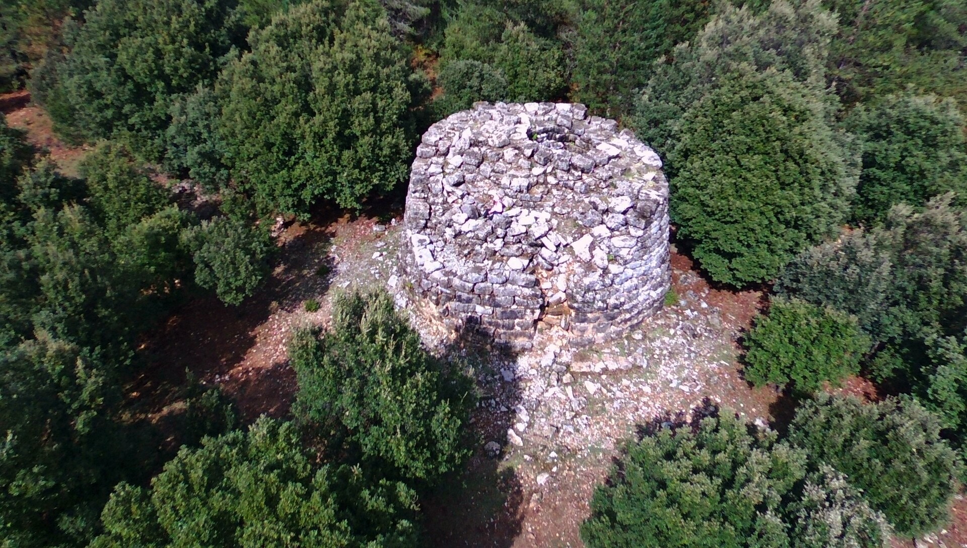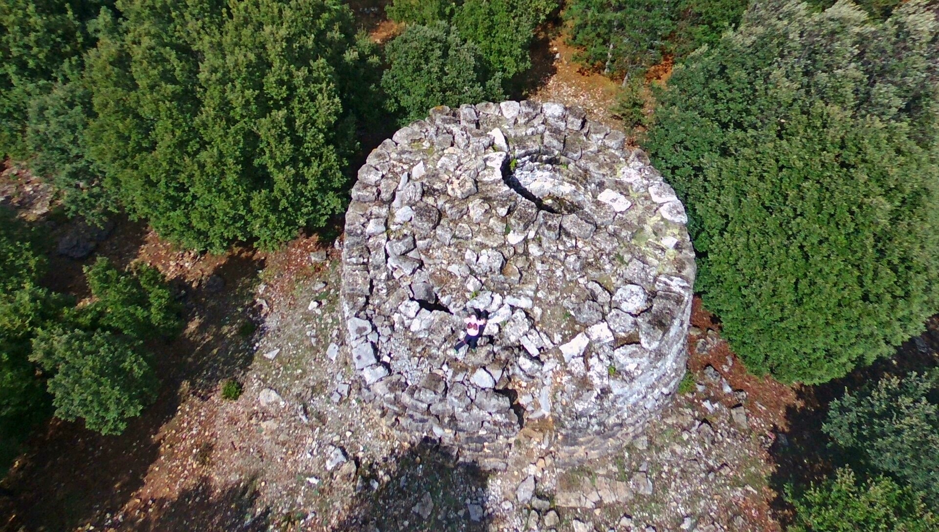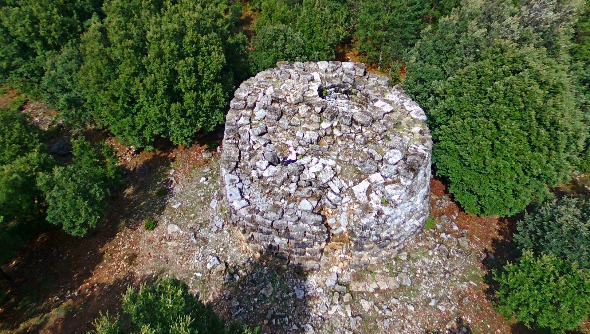 Il nuraghe in origine doveva essere piuttosto alto. Attualmente la tholos è crollata verso l’interno. Si noti la presenza di due tombe dei giganti non distanti dal nuraghe.