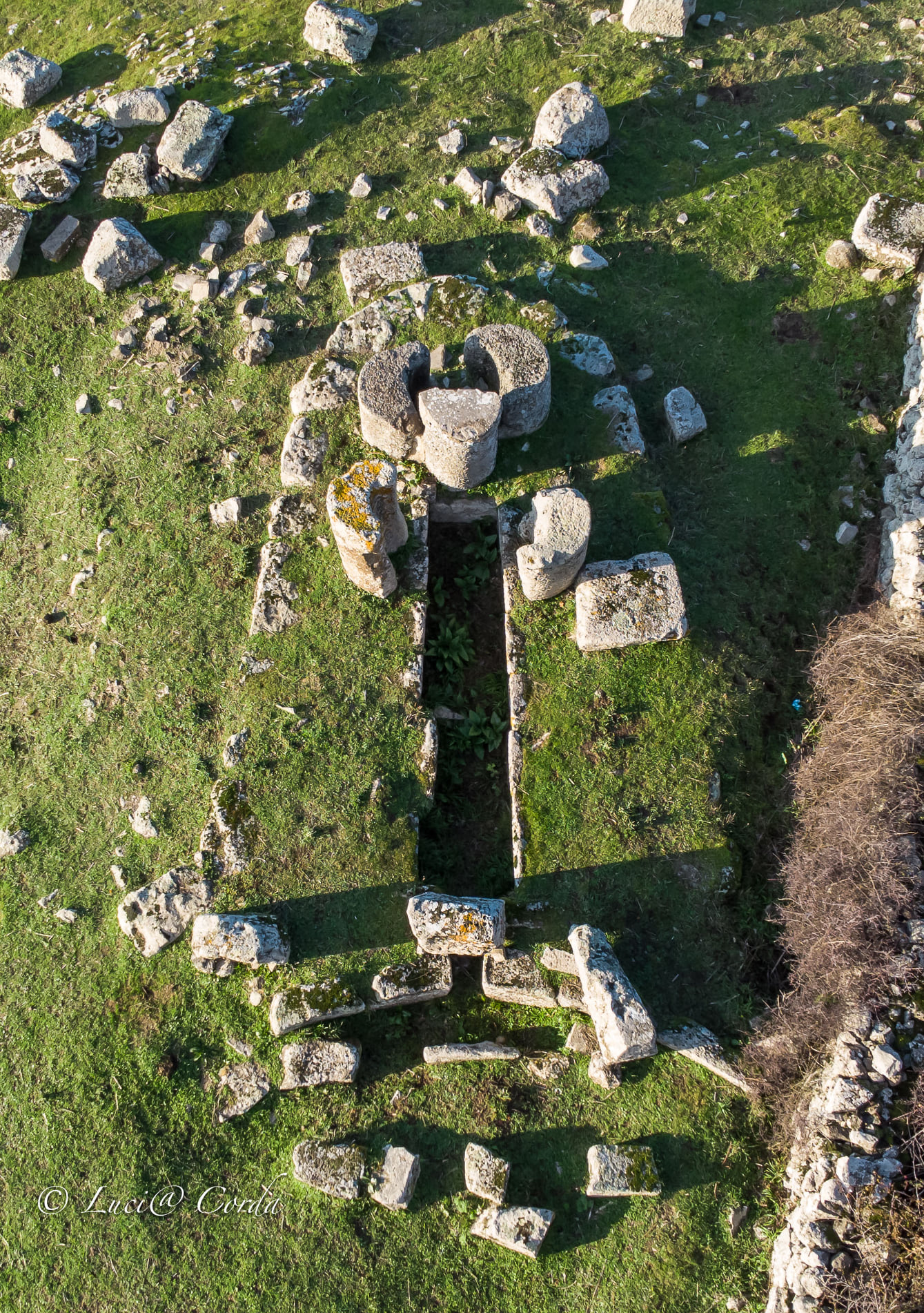 Costruito con blocchi di calcare ed arenaria è costituito da un corpo centrale con due torri, un antemurale e un villaggio di capanne. Le più antiche strutture, datate ai secoli XV-X a.C., sono la torre maggiore ed alcune capanne. La torre, con ingresso ad E-N/E, residua per m 8 di altezza. La camera interna conserva integralmente la volta a “tholos” ; nella parete di fondo si apre il vano ogivale della scala che conduceva al piano superiore ed al terrazzo.