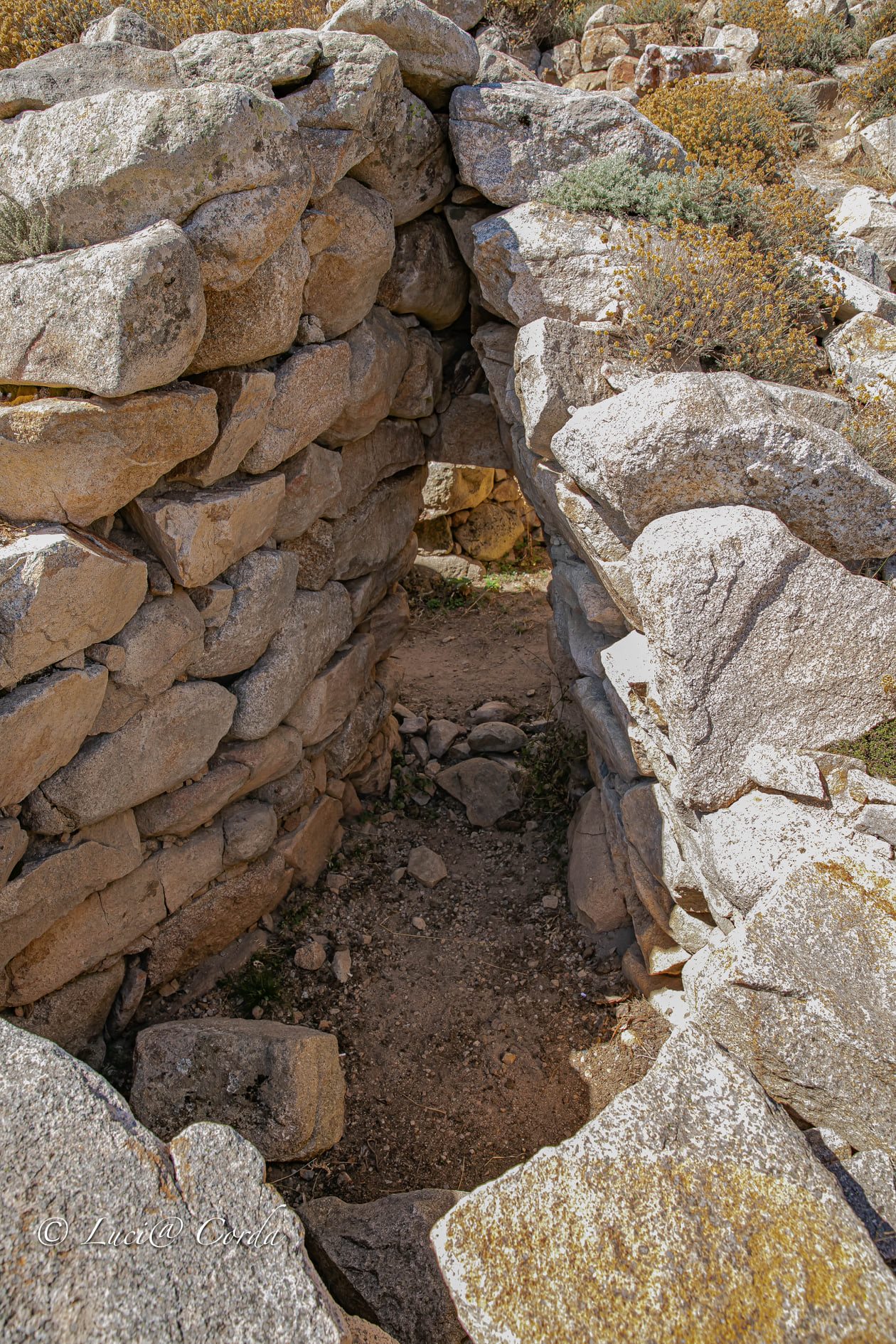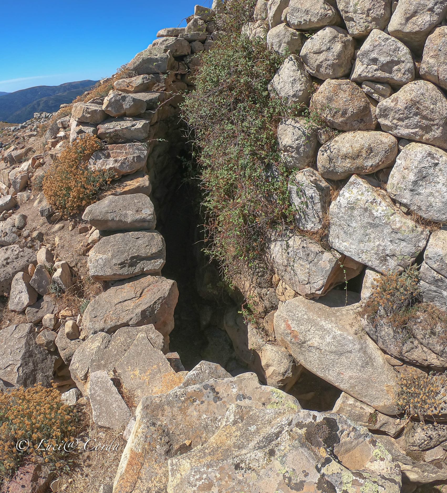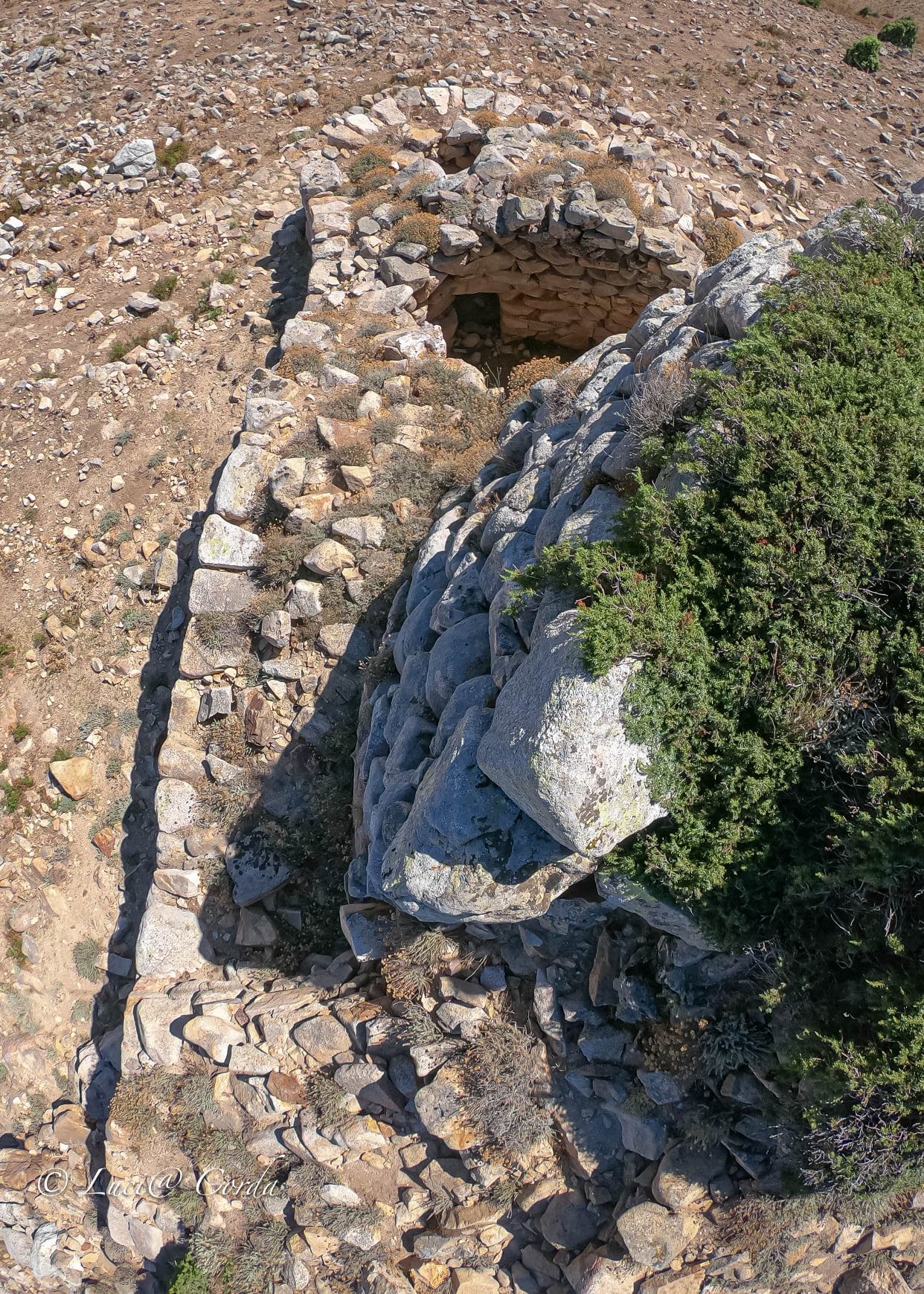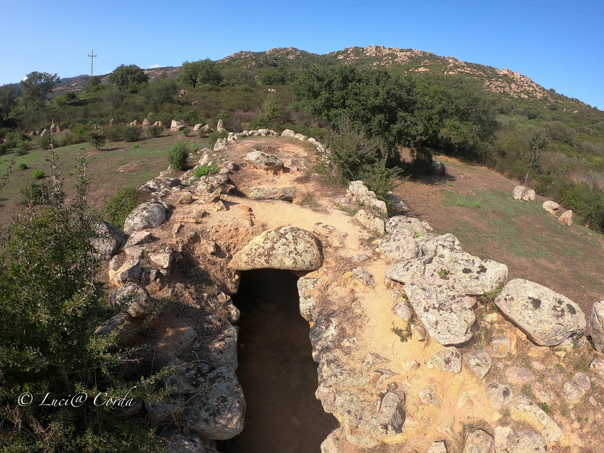 Detta anche “Sa Grutta de Santu Giuanni”, presenta il classico schema planimetrico delle tombe di giganti. Il corpo tombale (m 22,10), disposto lungo l”asse NS con ingresso a S, è delimitato all”esterno da file di blocchi di granito di diverse dimensioni. Il prospetto risulta ancora parzialmente interrato e ingombro di pietrame.
