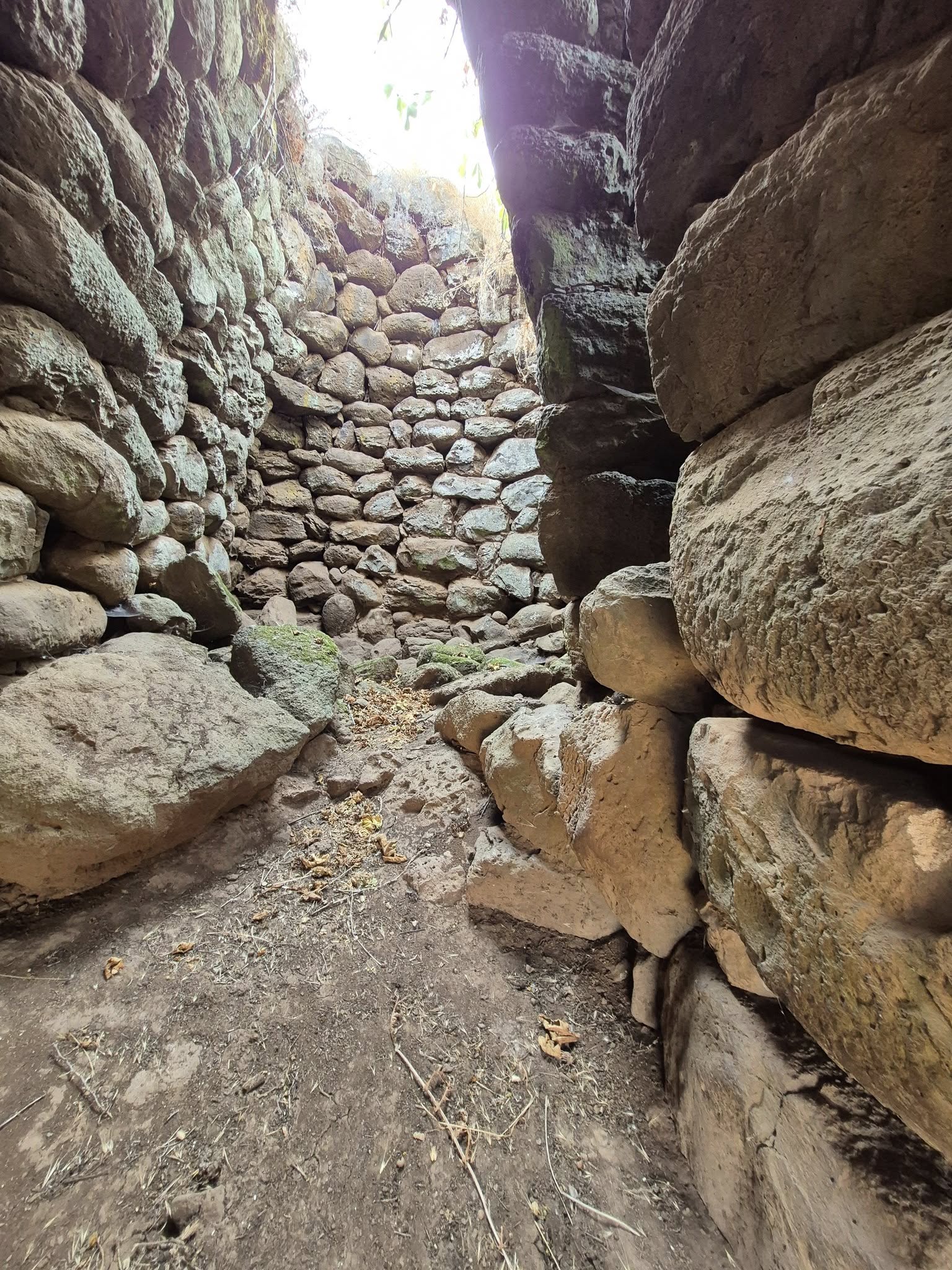 È stato edificato con conci di basalto di dimensioni varie e guardandolo verso l’entrata, posizionata a sud-est, sembrerebbe che abbia subito un cedimento. Una volta all’interno si nota l’imponente altezza del corridoio che si eleva per undici filari, oltre il piano di calpestio, chiuso da conci posizionati a piattabanda. Sulla sinistra si apre una nicchia tronco ogivale, mentre a destra si apre il varco per la scala elicoidale, attualmente crollata. Nella torre sono presenti altre due nicchie architravate. La tholos è parzialmente crollata.