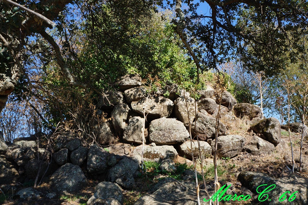 Nuraghe diroccato interrato e avvolto da vegetazione. Sembra essere un monotorre