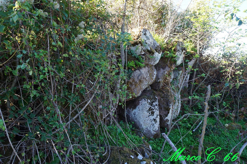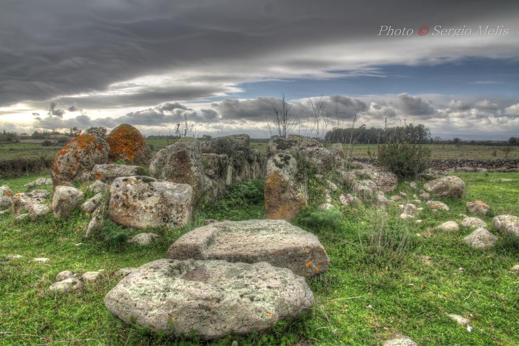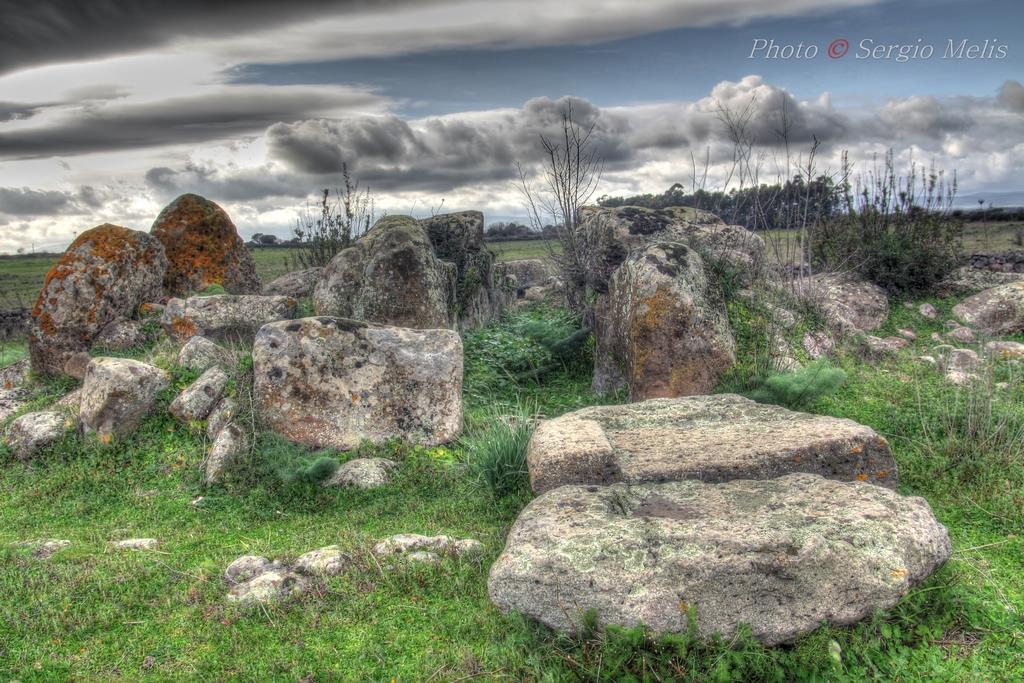 Quel che resta di una Tomba dei Giganti dolmenica completamente diroccata di cui restano soprattutto gli elementi verticali e i basamenti di contorno