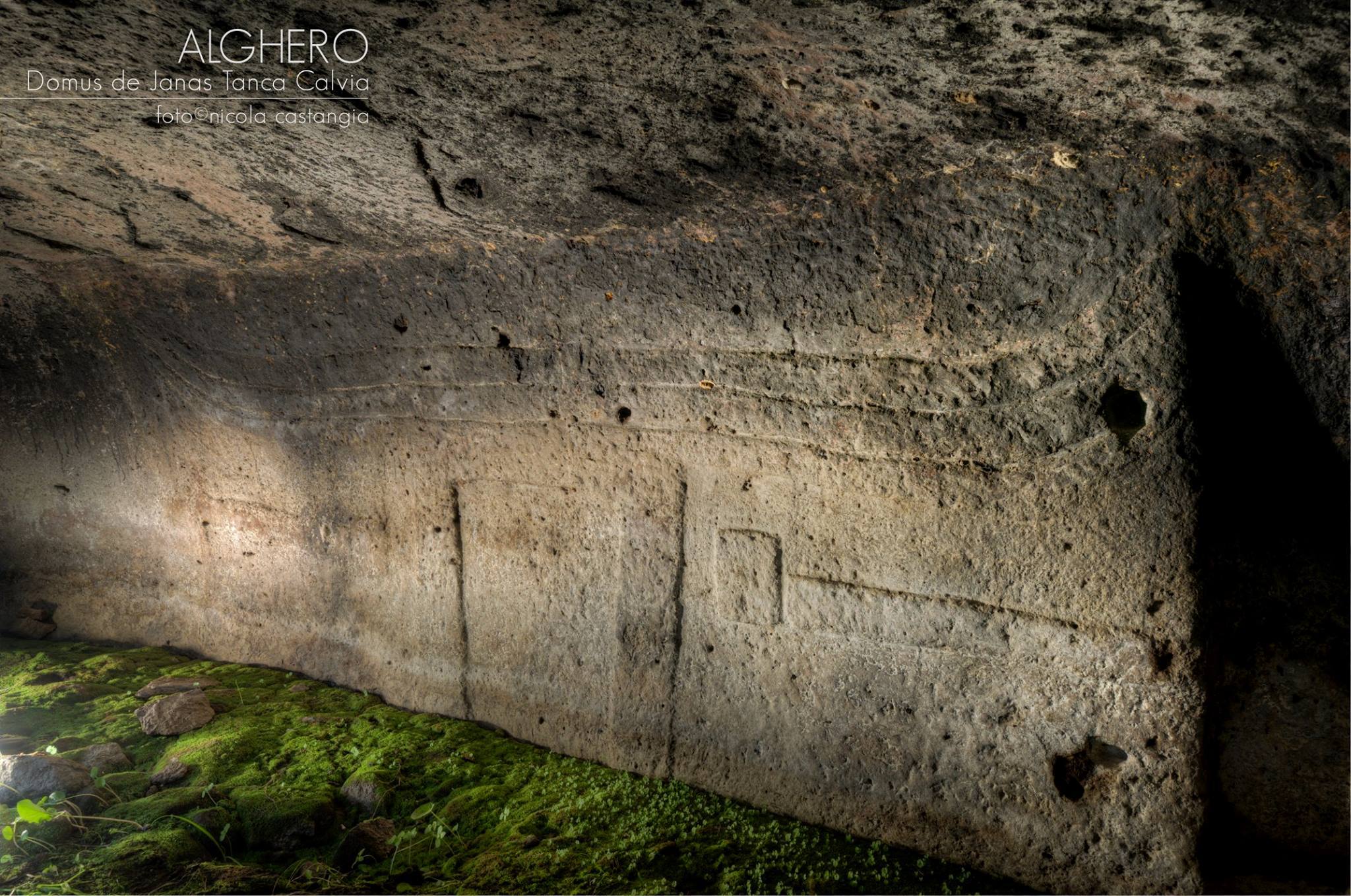 Nella cella c la traduzione su roccia della capanna rettangolare appare molto fedele. Sono, infatti, riprodotti la trave centrale, i travetti laterali poggianti su questa e su due travi orizzontali ad essa parallele; i due pilastri disposti simmetricamente;