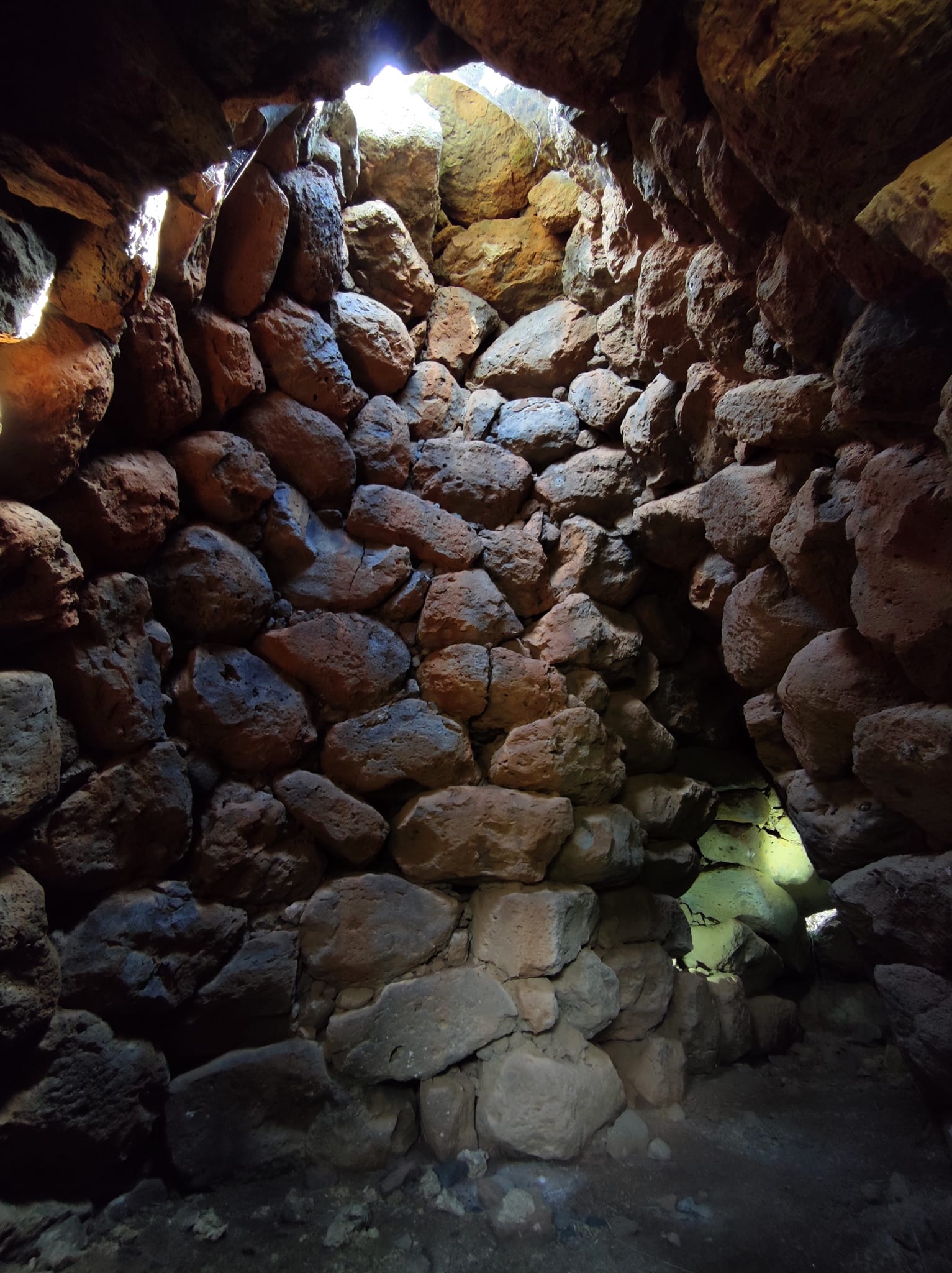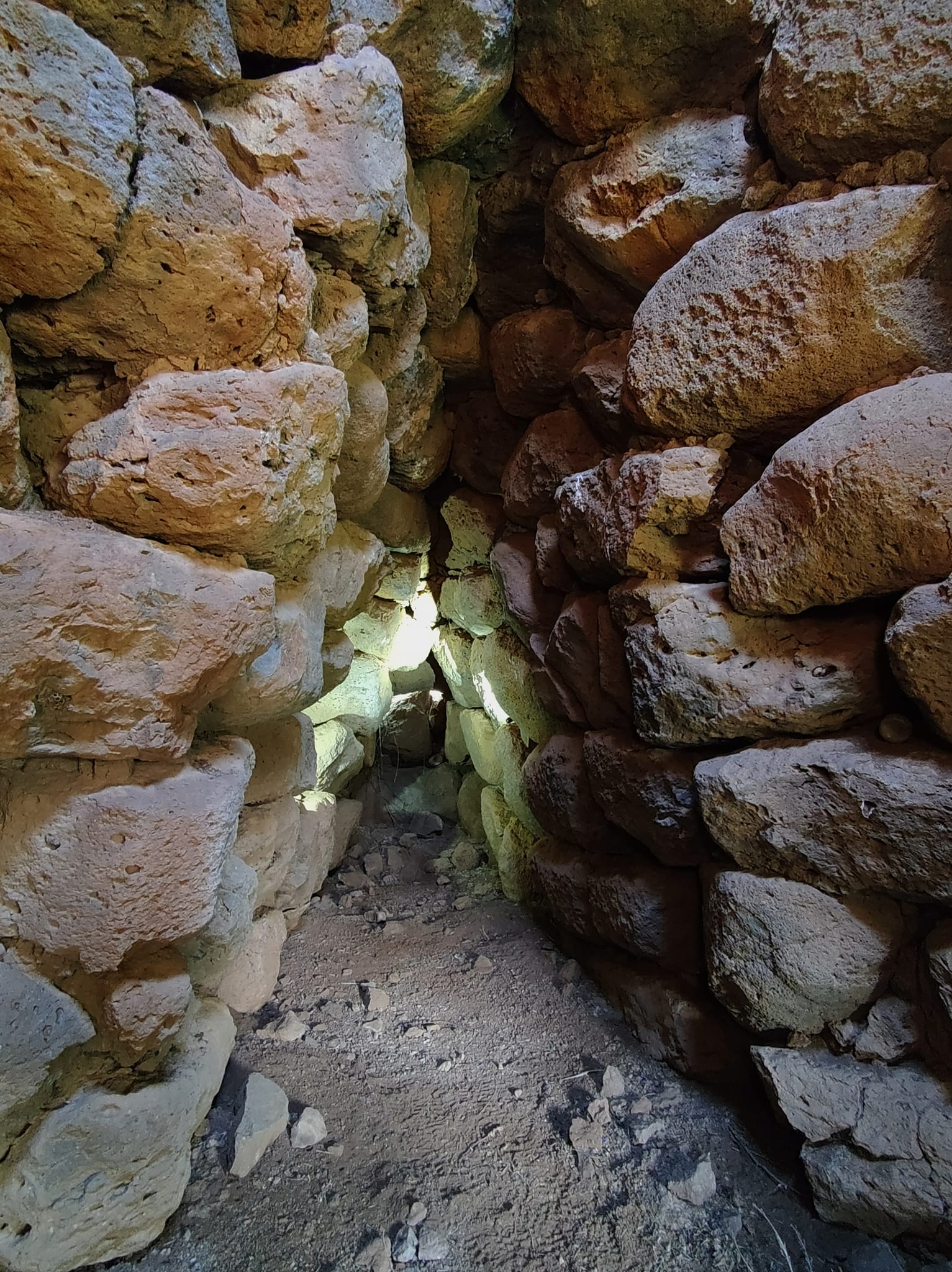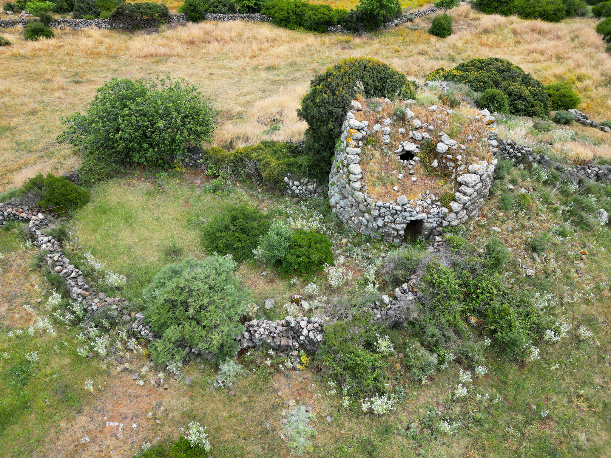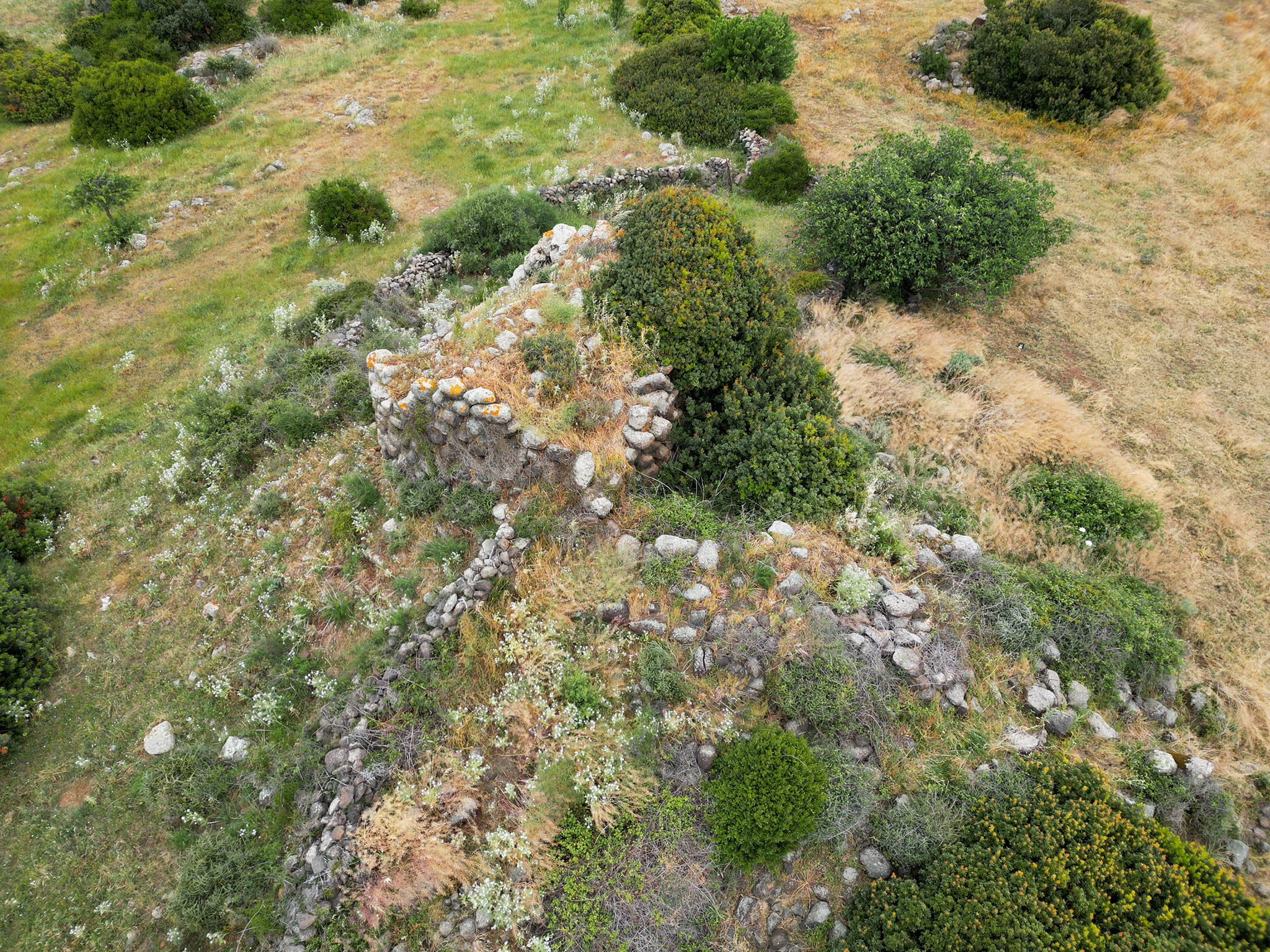 Malgrado gli arbusti incombenti si evince una planimetria di tipo a tancato. La struttura sorprende anche perché, presumibilmente, l’accesso principale è quello che si trova a nord-ovest (non usuale nei nuraghi). L’ingresso monumentale, piattabandato, è composto da una piccola camera circolare che si conserva quasi per intera. Decentrato, sulla destra, un corridoio ad ogiva. Percorrendolo si può ammirare una nicchia che, nonostante i crolli, sembrerebbe costituire l’accesso di una scala. Nella parte finale del corridoio è presente un secondo accesso più modesto.