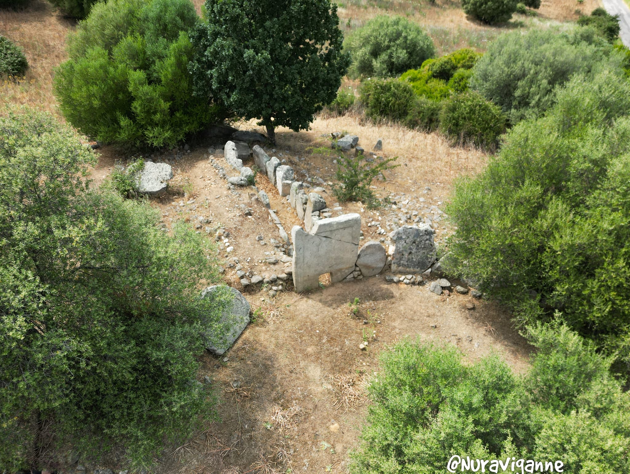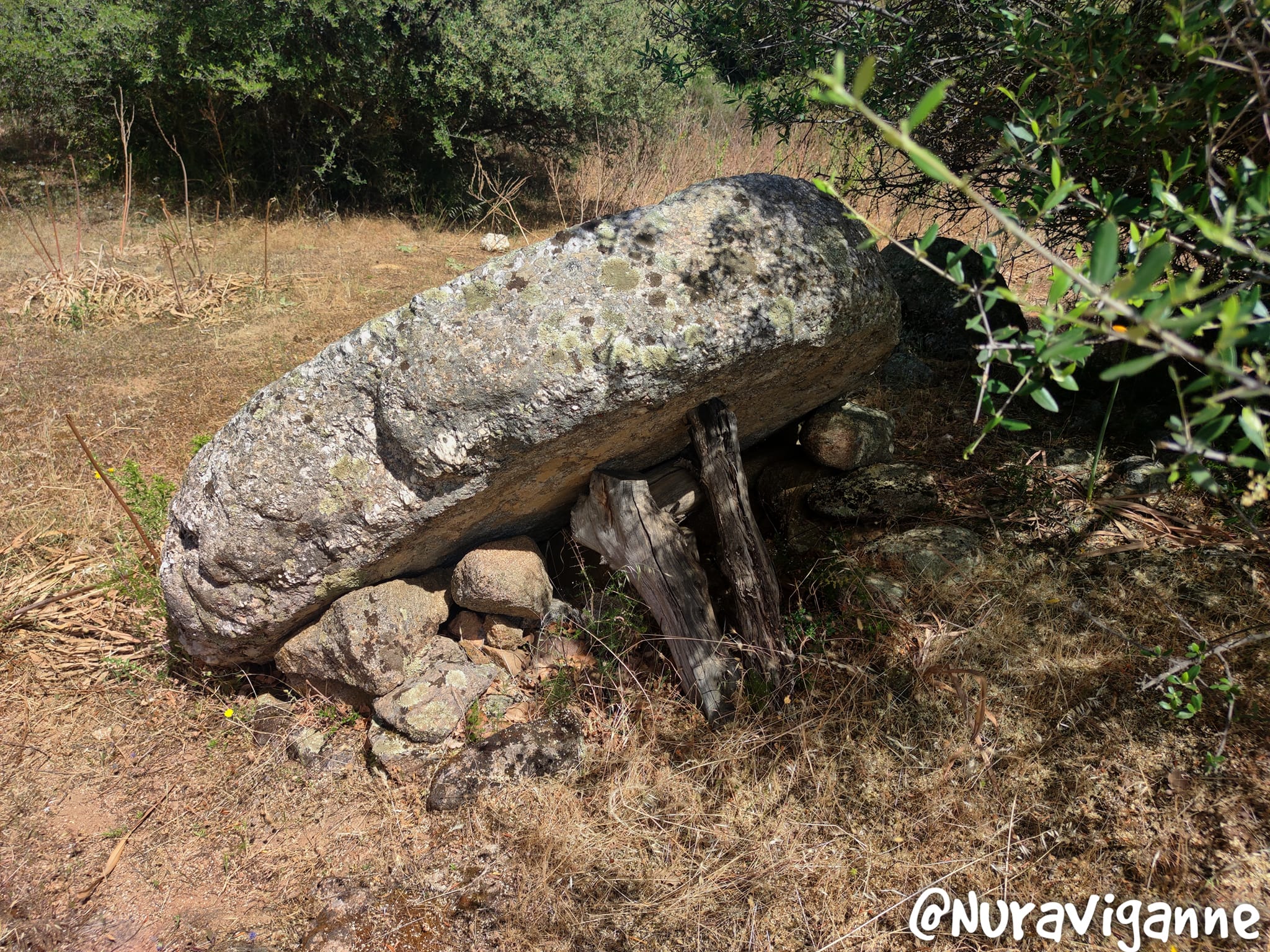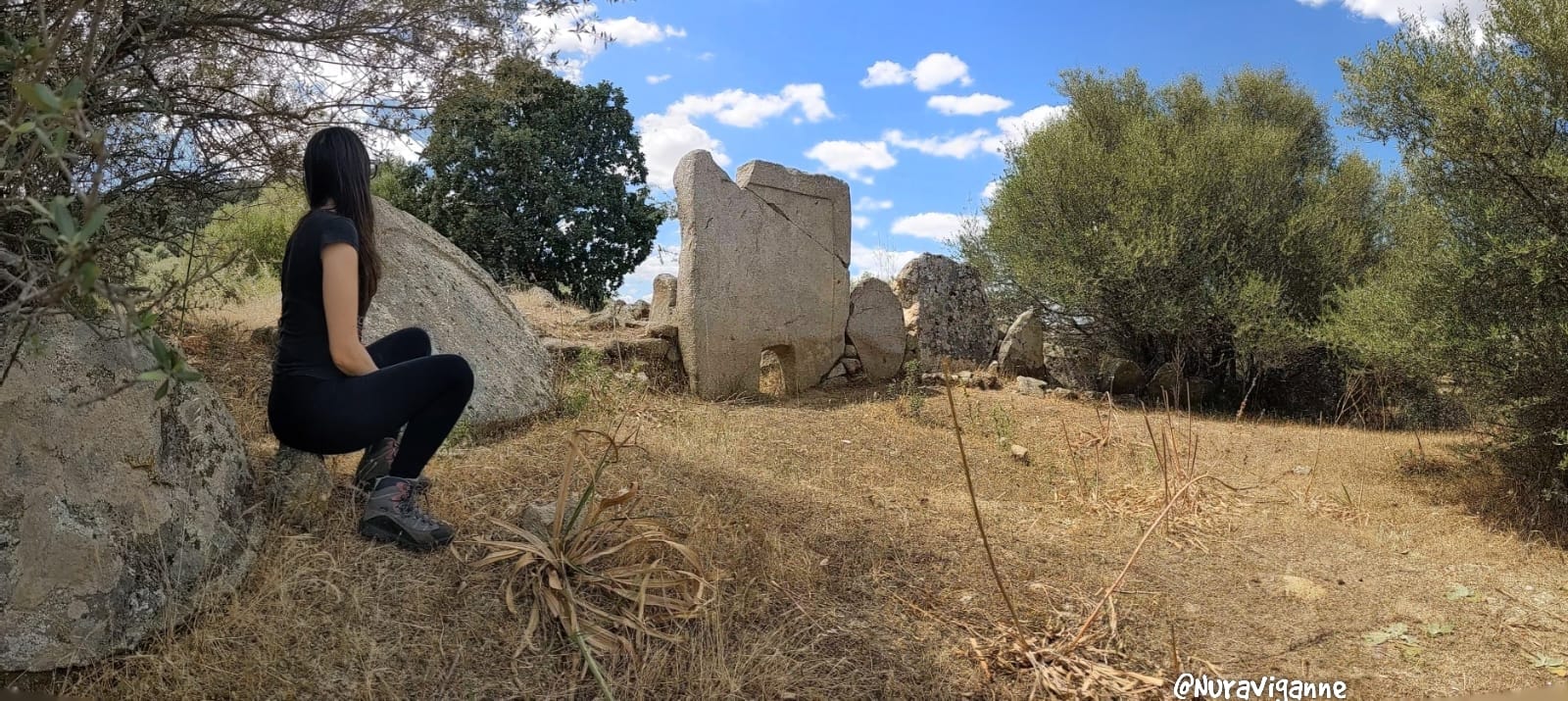 La tomba faceva parte di un complesso funerario in origine composto da quattro sepolture megalitiche messe a breve distanza l’una dall’altra e vicinissime ai nuraghi Ilòi e Logula. L’attuale tracciato stradale ha diviso la piccola necropoli di tombe di giganti costruite in funzione dei villaggi lungo un tracciato di vie di transumanza. E’ una tomba dolmenica, originariamente provvista di stele centinata bilitica con portello alla base posta al centro dell’esedra.
